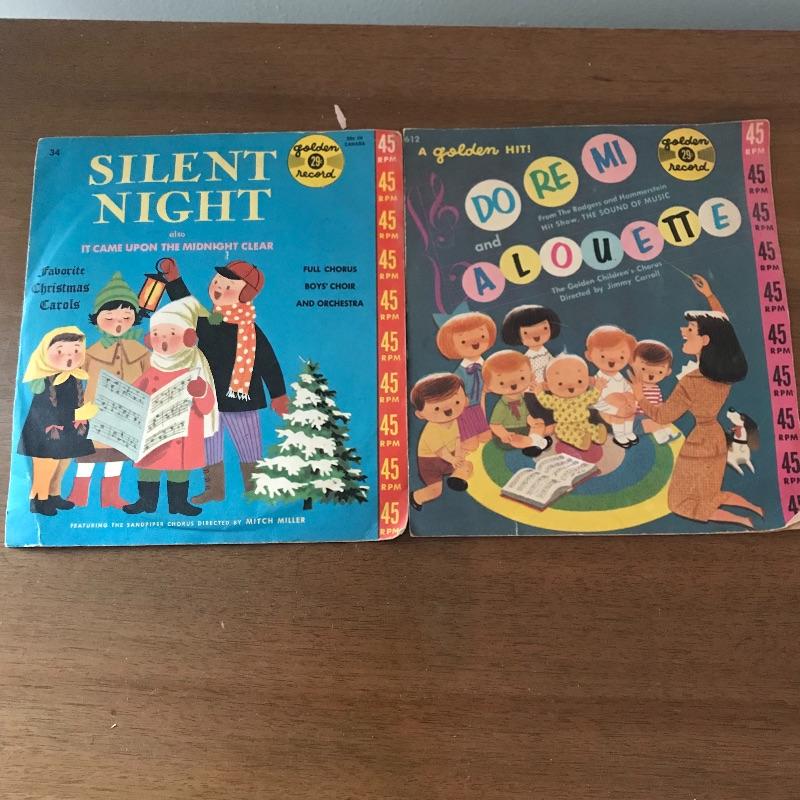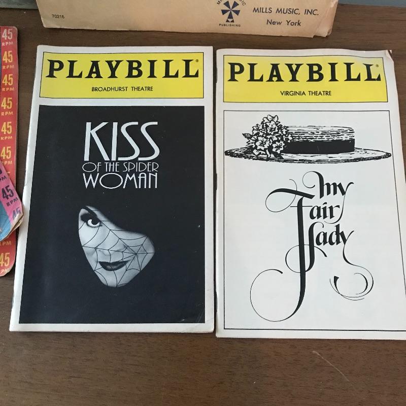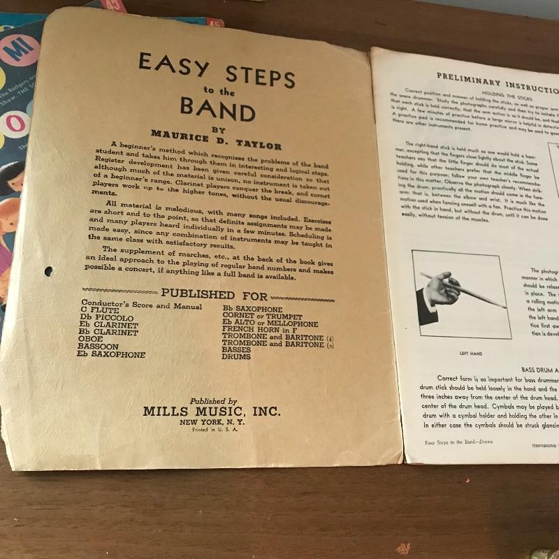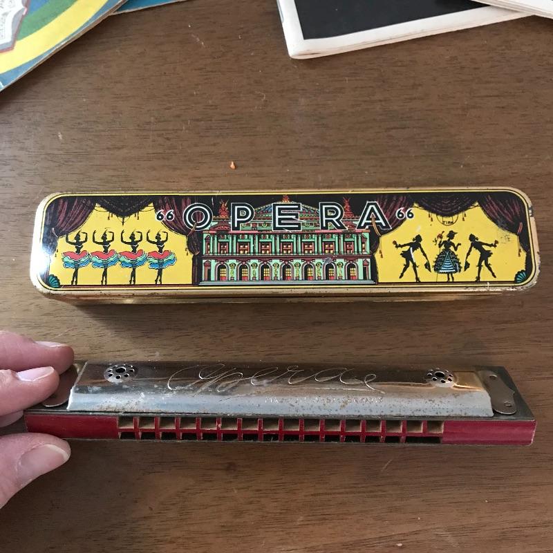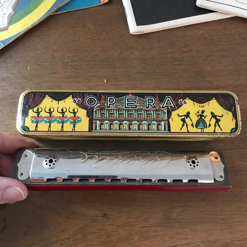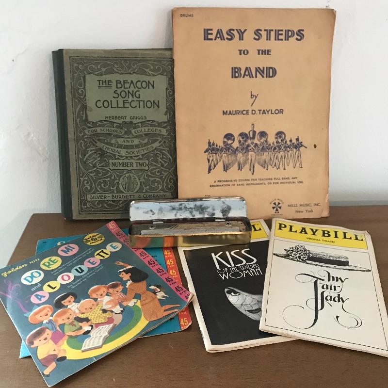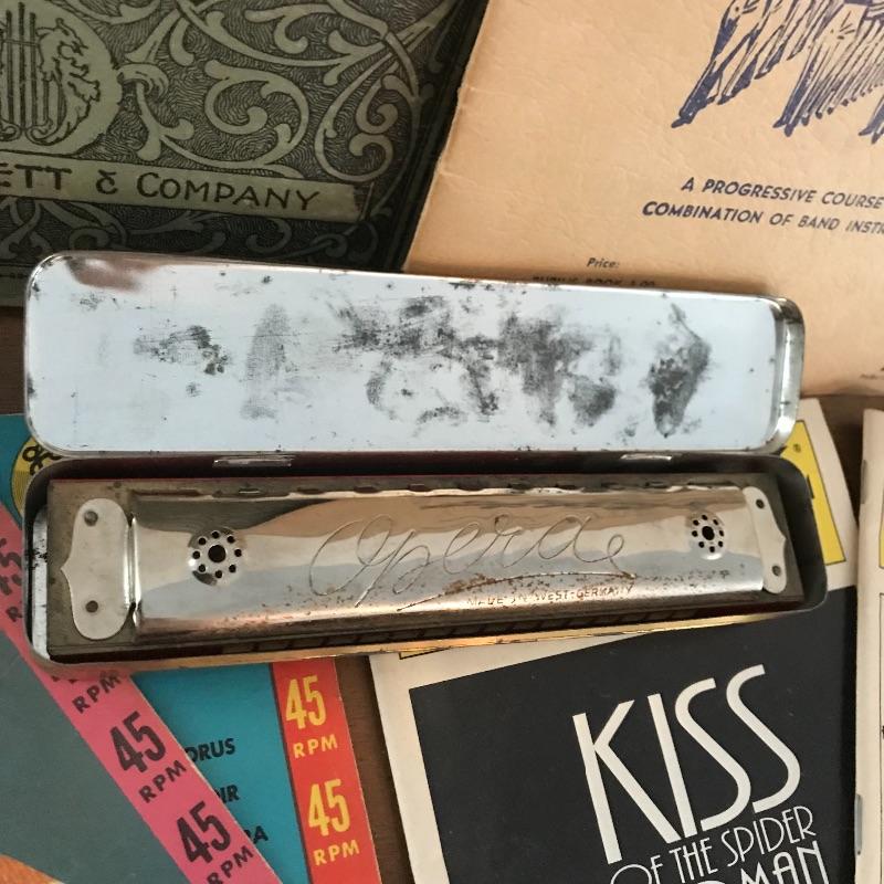 Wisp away to an earlier era of music! A book, The Beacon Song Collection Number 2 has a copyright of 1900! Next we have drum instructional magazine from 1939 and two children’s records, one with the year 1959! A West German made Opera harmonica with case (some rusting, see photos) and two playbills from 1994 to complete the collection. The 45s need some cleaning and restoring. See photos for signs of age and wear. Collection is mostly in nice shape. Shipping available.