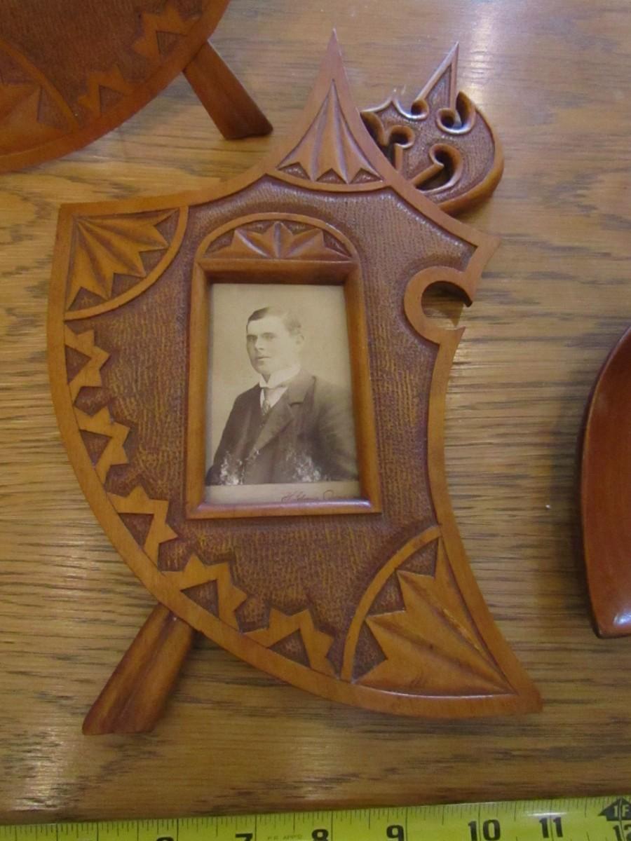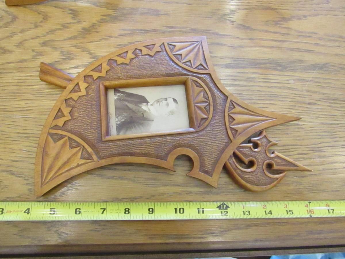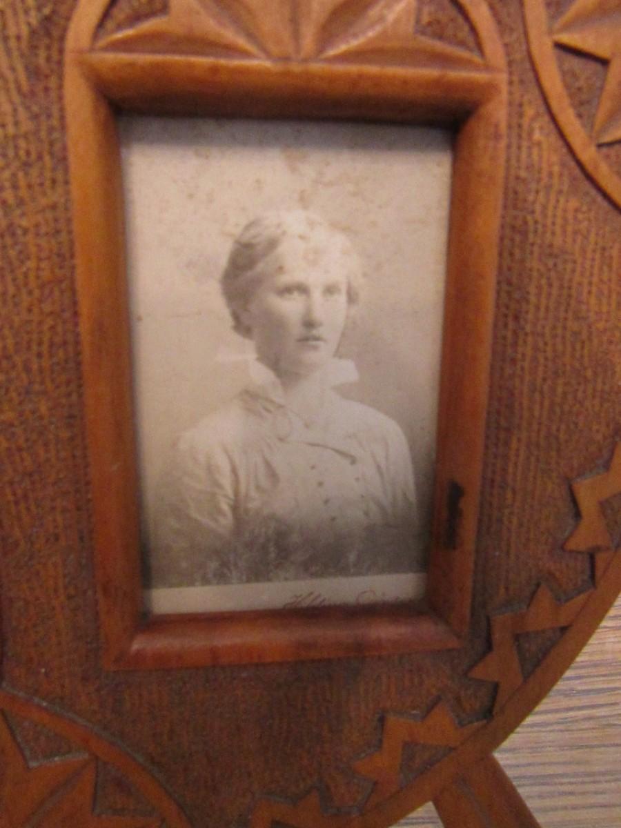 2 WOODEN ANTIQUE PICTURE FRAMES WITH ANTIQUE PHOTOS, 1 IS MISSING ITS BRACE TO HOLD IT UPRIGHT