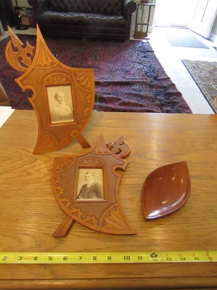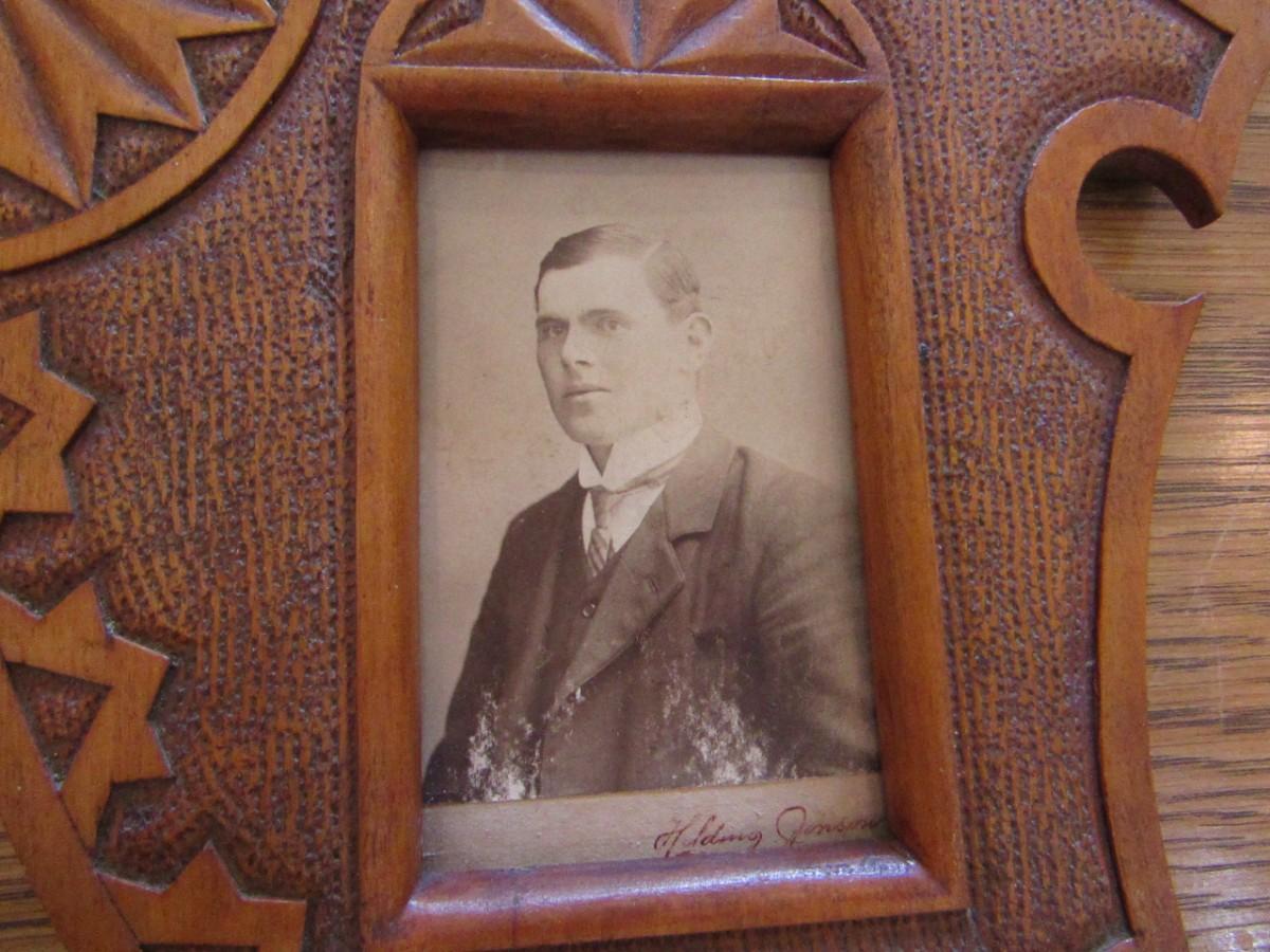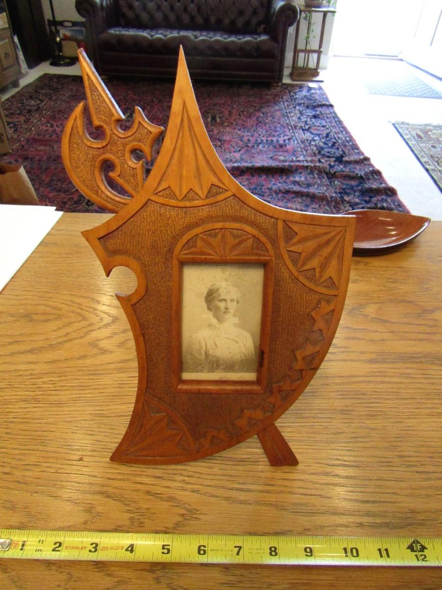 2 WOODEN ANTIQUE PICTURE FRAMES WITH ANTIQUE PHOTOS, 1 IS MISSING ITS BRACE TO HOLD IT UPRIGHT