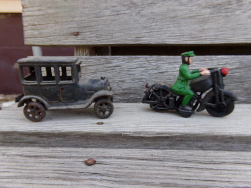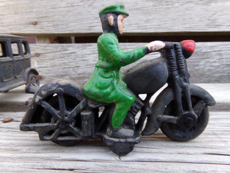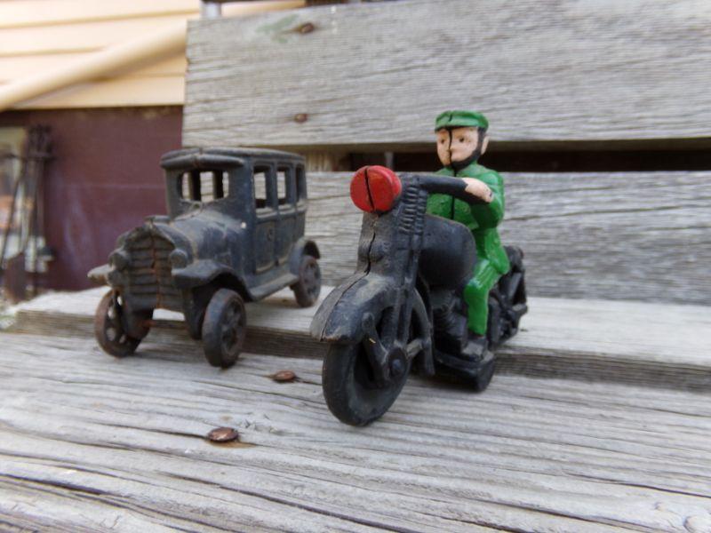 LOT 201 CAST IRON MOTORCYCLIST & SUV