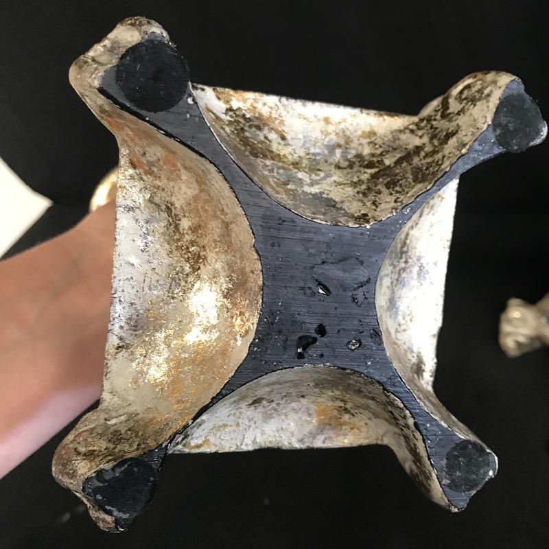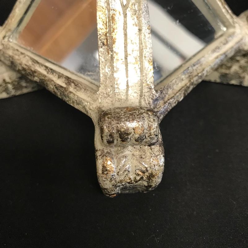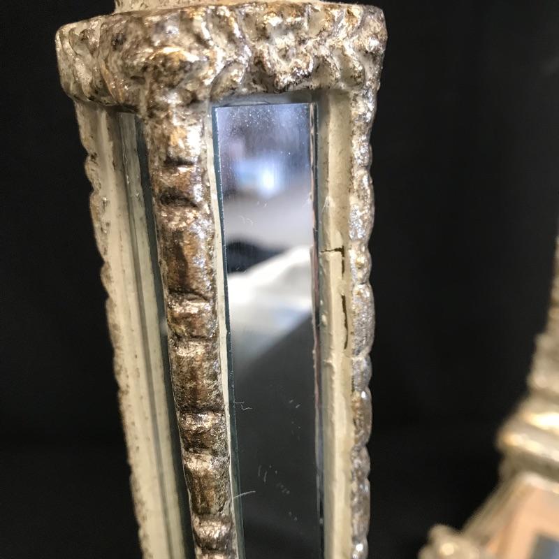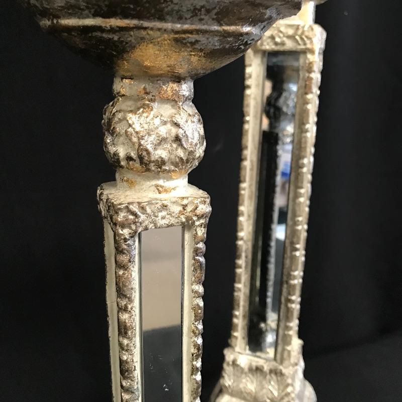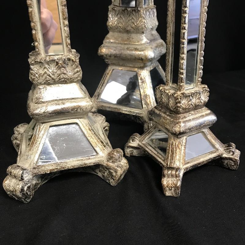 Trio of tall mirror adorned pillar candle holders. Painted with white, silver, and gold, their colors will go with any room! The tallest measures approximately 5.5”sq x 19” and the smallest is 4”sq x 12”. See photos. Shipping available.