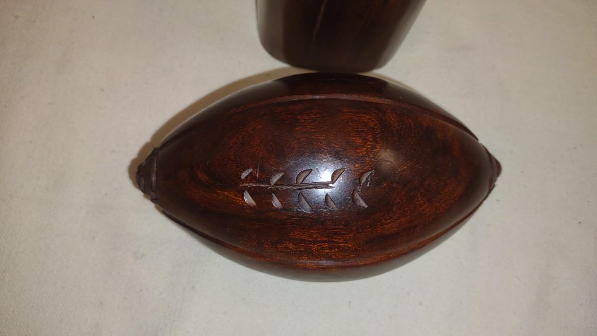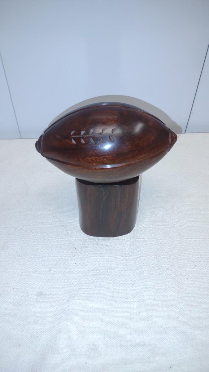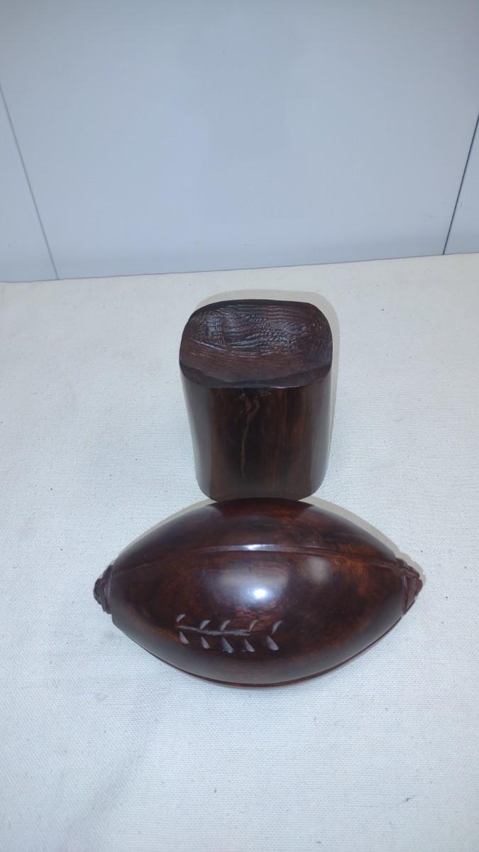 HAND-CARVED WOODEN FOOTBALL AND STAND. BEAUTIFUL AND HEAVY