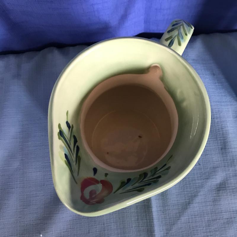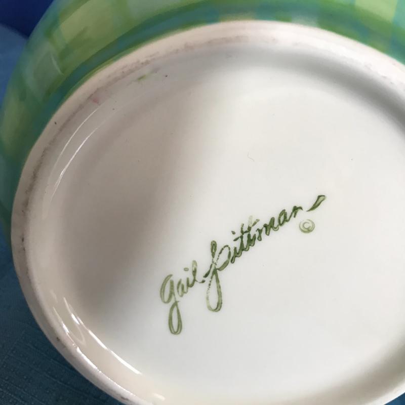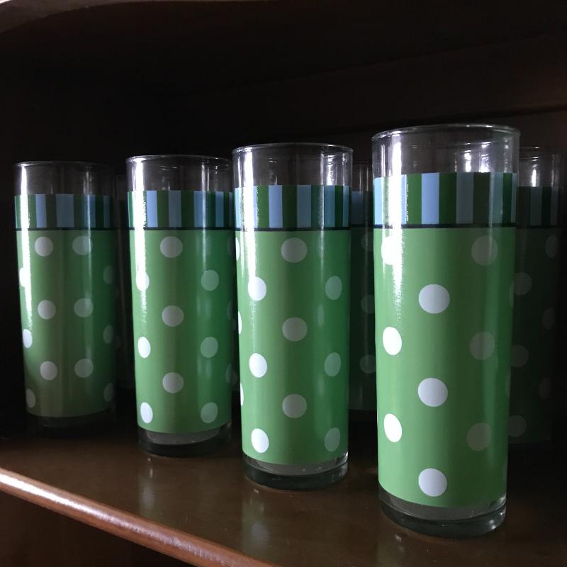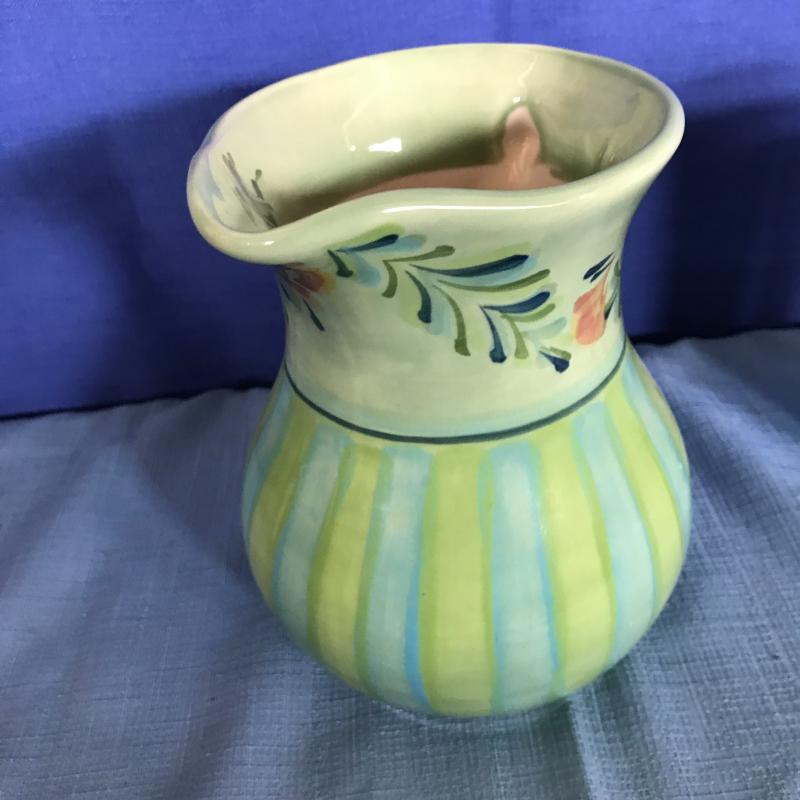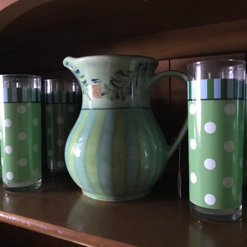 16 glasses and a pitcher by Gail Pittman. Pitcher is 8 in high. No shipping. Local pick up only in Maggie Valley, NC.