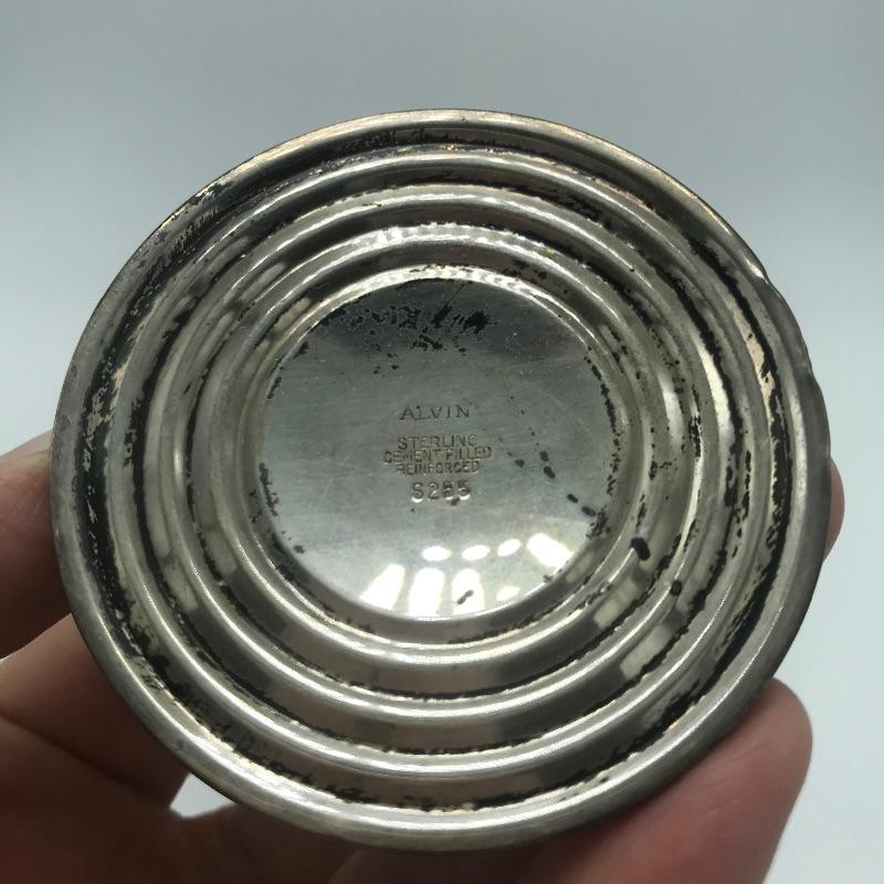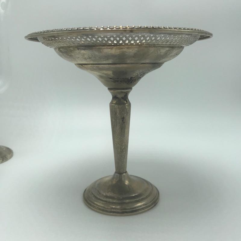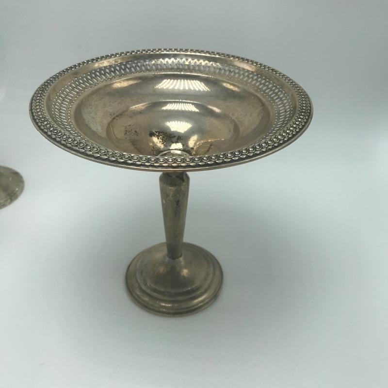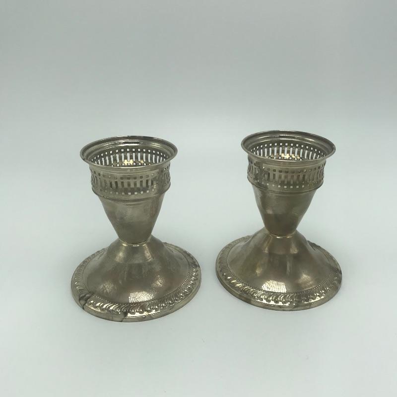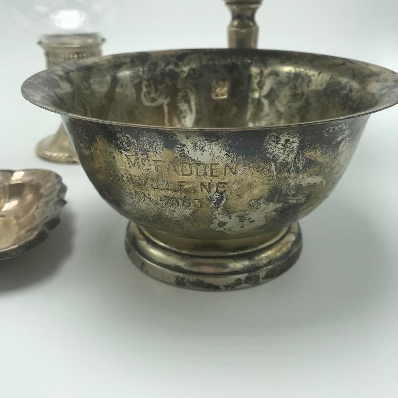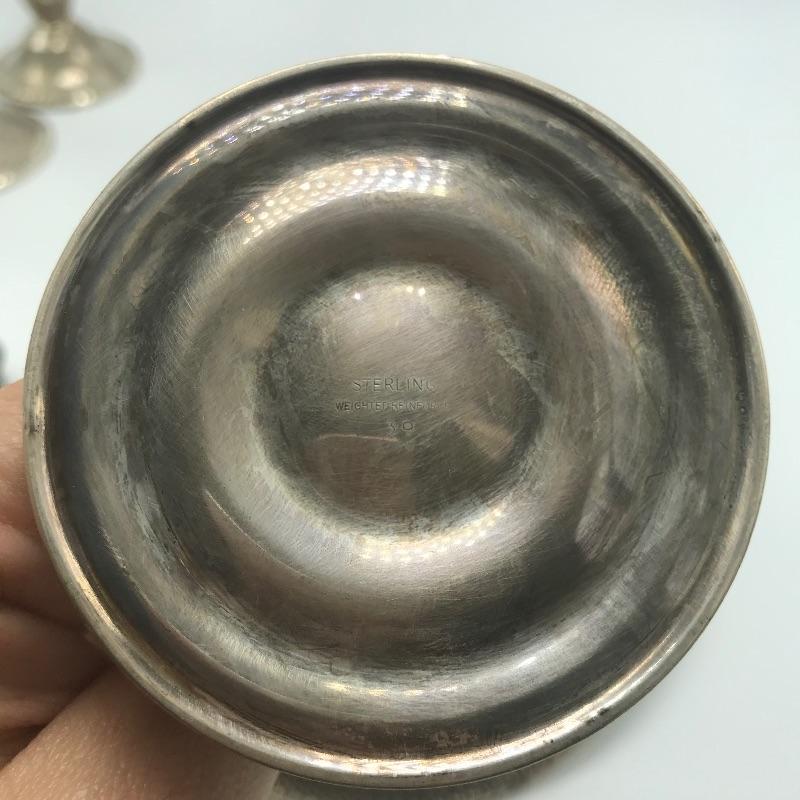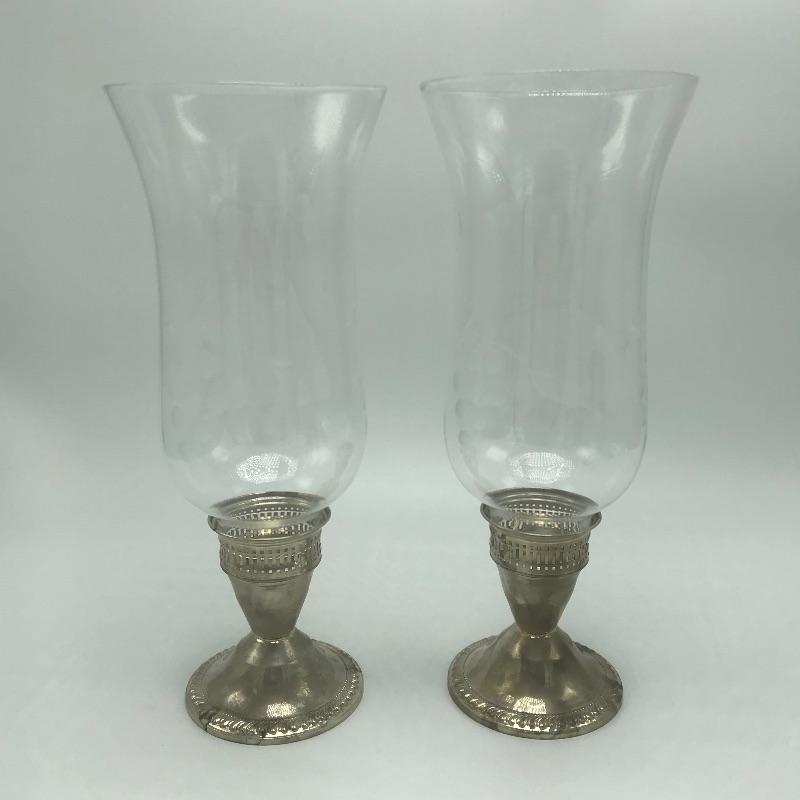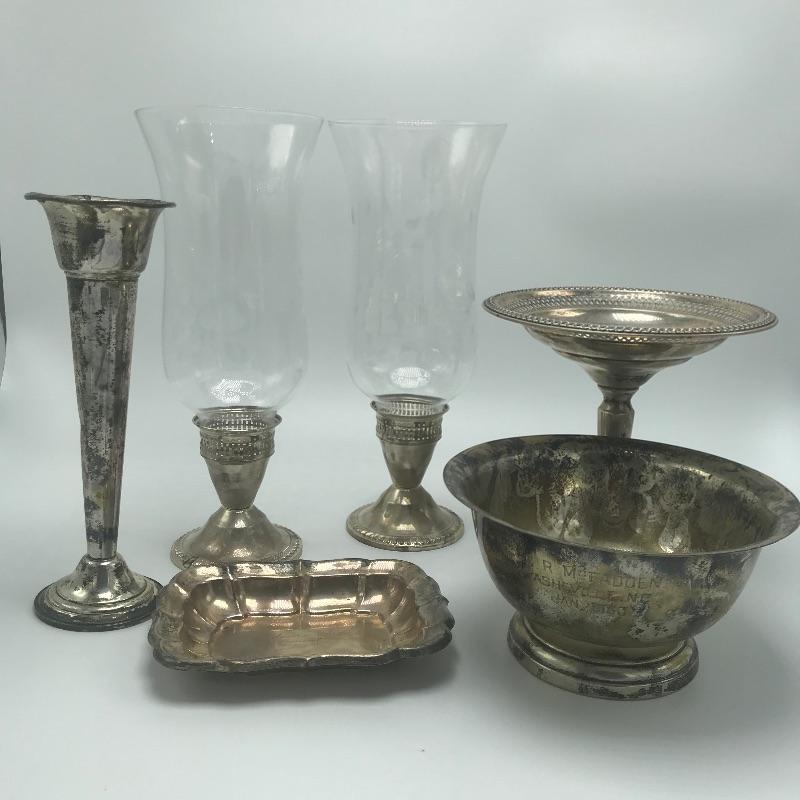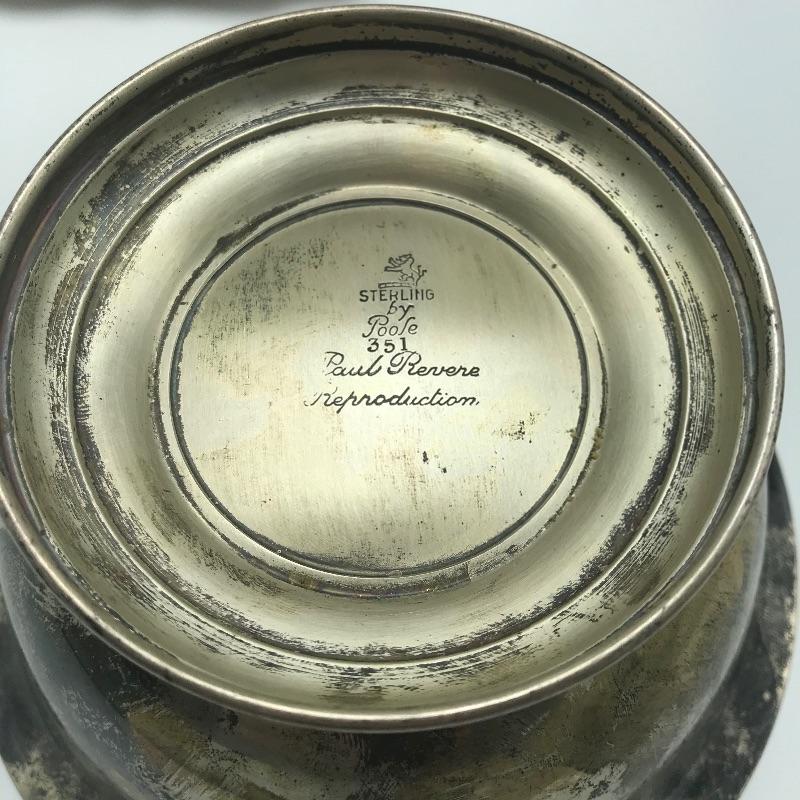 Classic vintage sterling silver collection including a heavyweight bowl labeled Sterling by Poole, Paul Revere Reproduction. with inscription on the outside. Two weighted candle holders with etched hurricane glass shades. The other footed sterling pieces are also weighted. See photos. Beginning bid is based on approximate melt value. Shipping available.