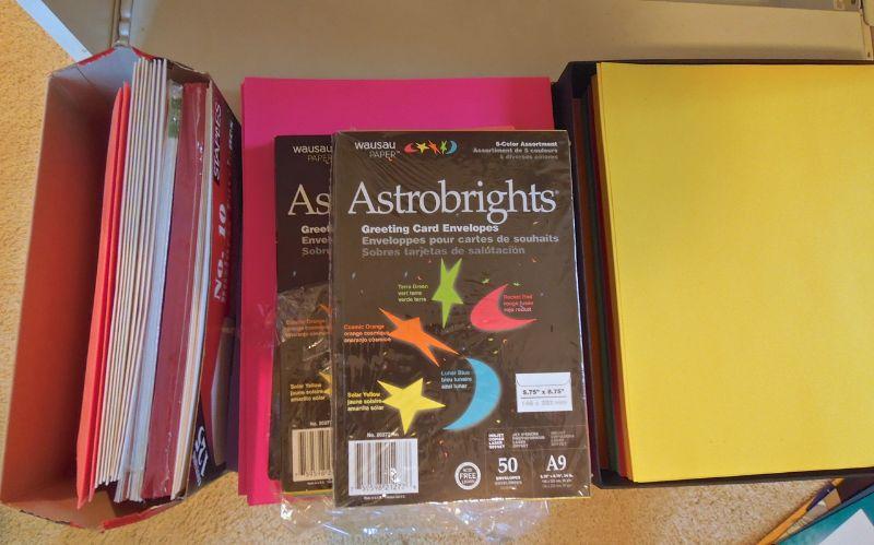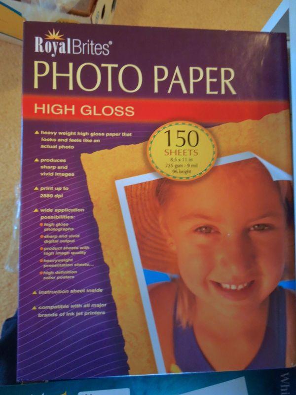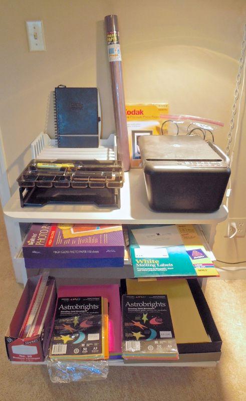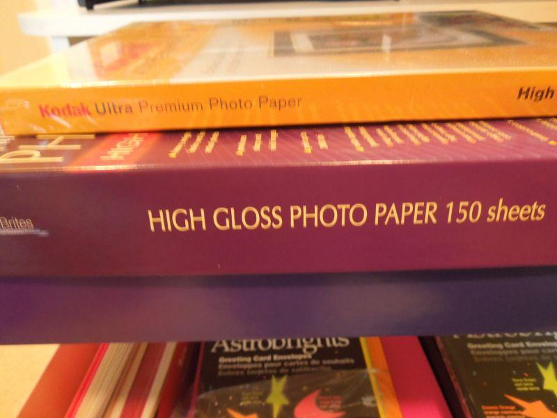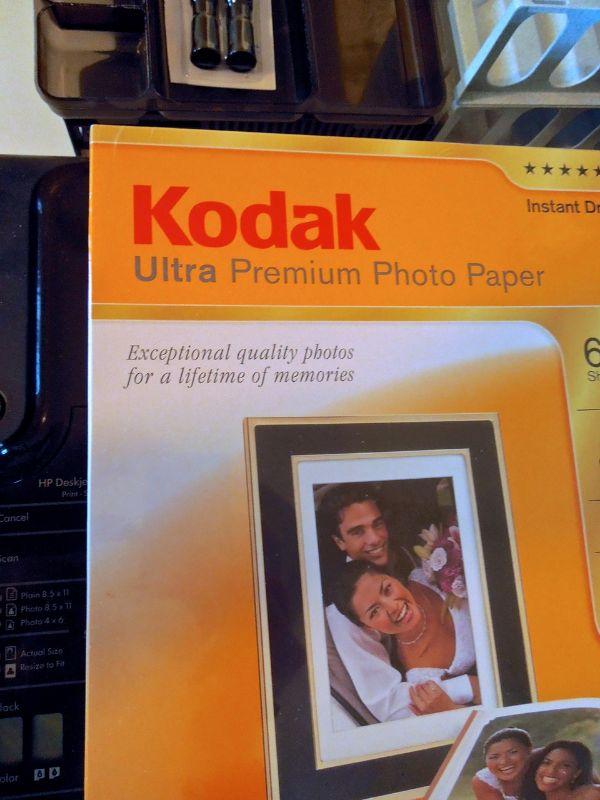 Model CB745A Hewlett Packard Deskjet Printer with lots of photo paper and Astrobright neon copy paper and envelopes. Leather journal and unopened roll of project paper.