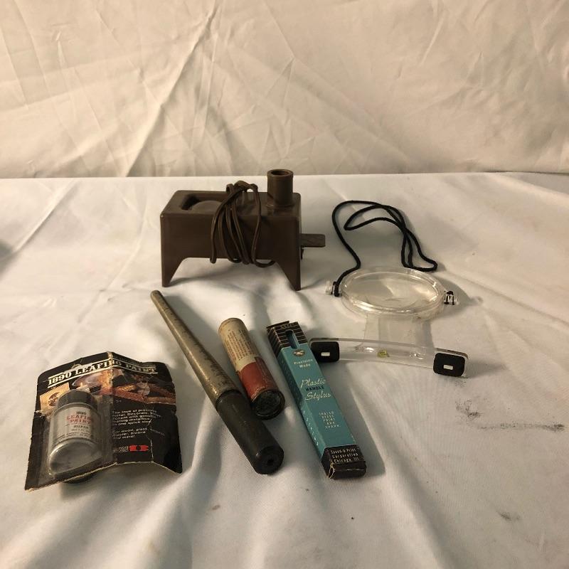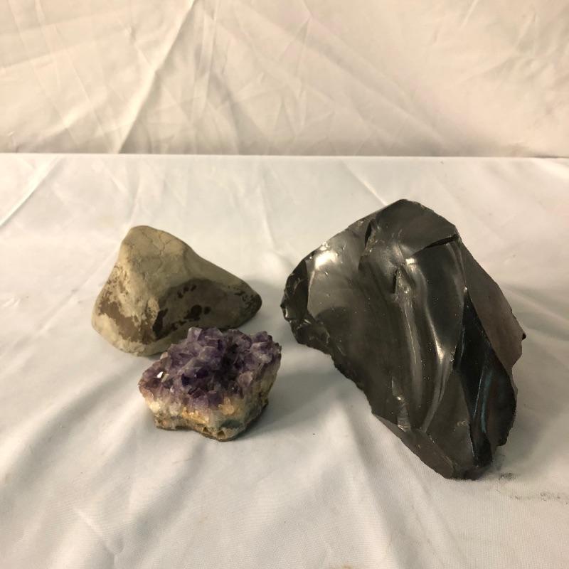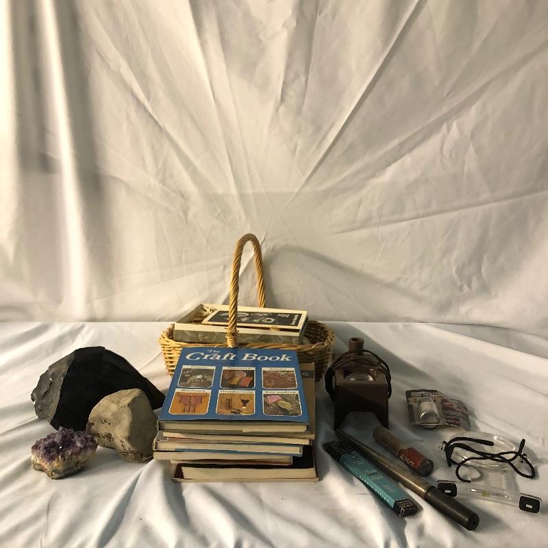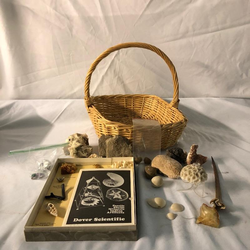 Calling all crafters! This set includes jewelry making tools such as microscopes, a ring sizer, gold leafing paint, and crafting books. This set also includes a nice variety of gemstones, such as obsidian and amethyst, and it also includes fossils and shells. This set also comes with a lightweight basket to hold everything! Basket is about 15” x 11.5”. Largest rock is about 9”x 6”. Local pick up only.