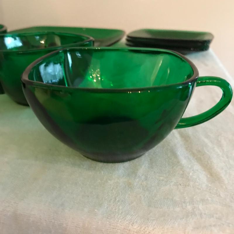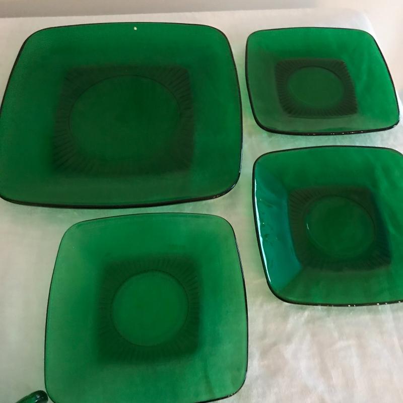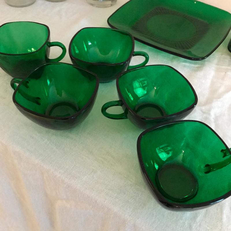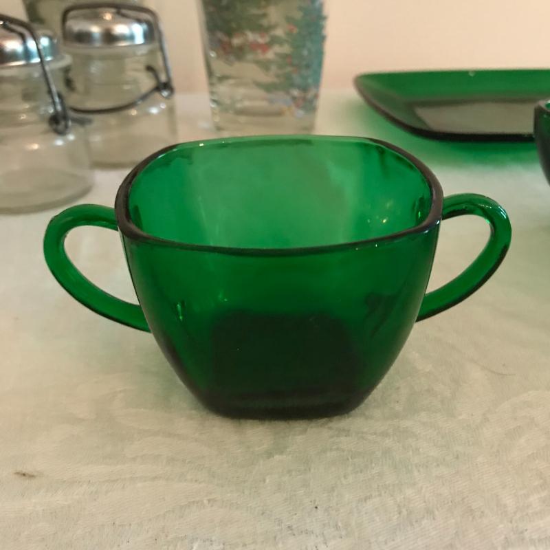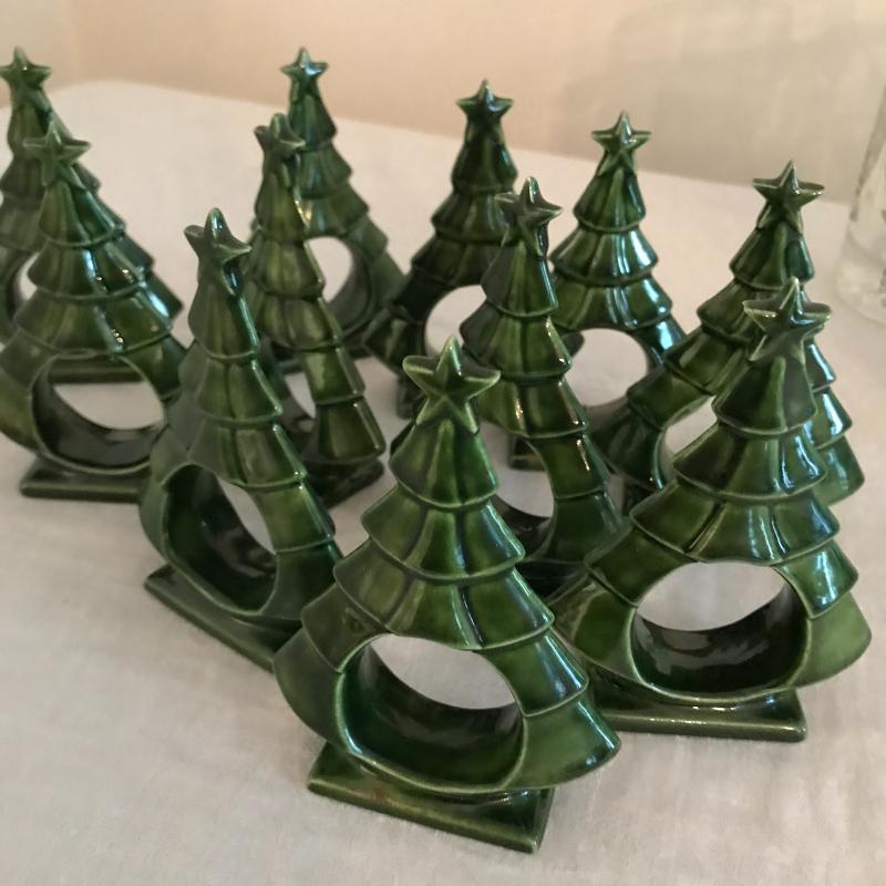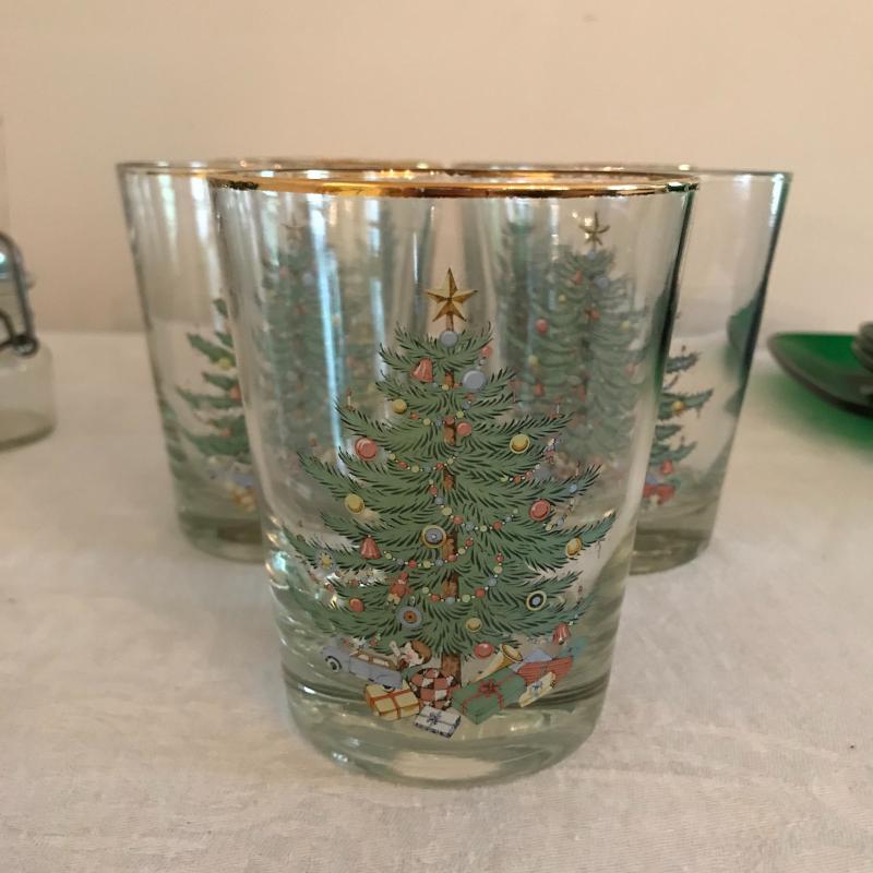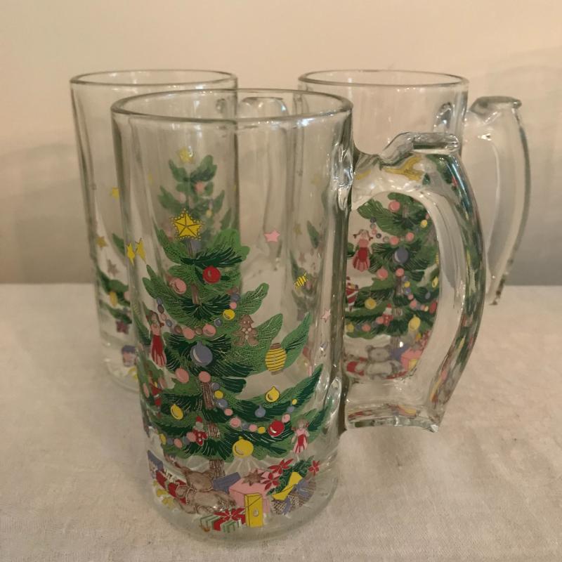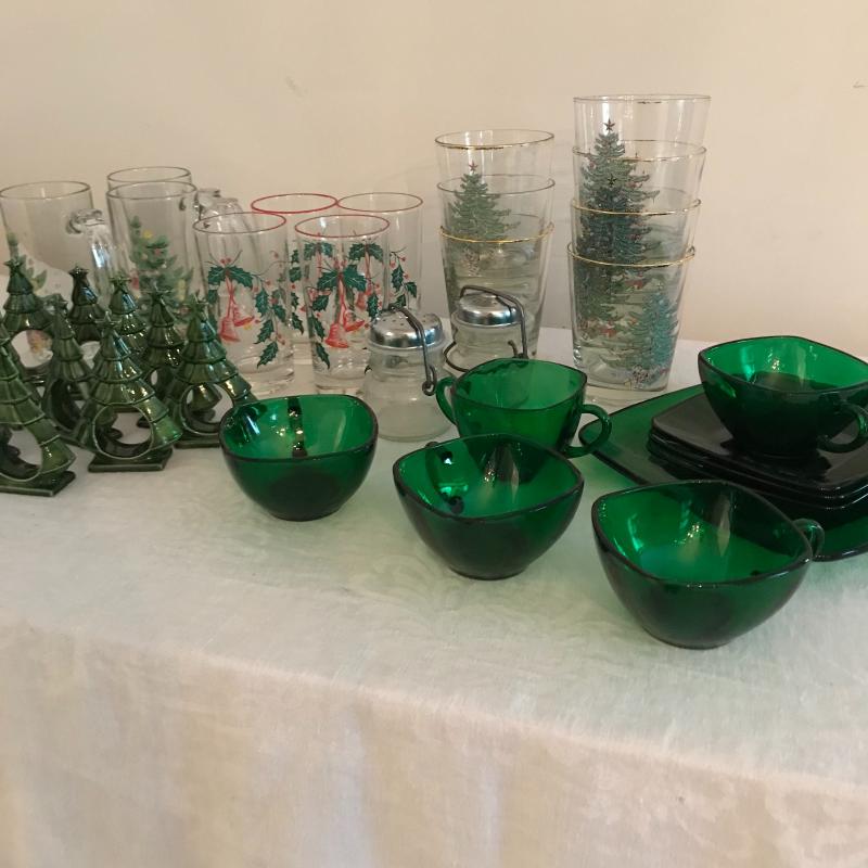 Lot includes set of seven Christmas tree glasses, three Christmas tree beer mugs, three garland glasses, a set of small lidded jars, a set of nine forest green plates and mugs (includes sugar dish), and a set of 11 Christmas tree napkin holders. No shipping available. Local pickup only in Asheville, NC.