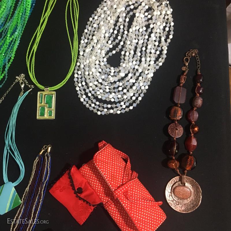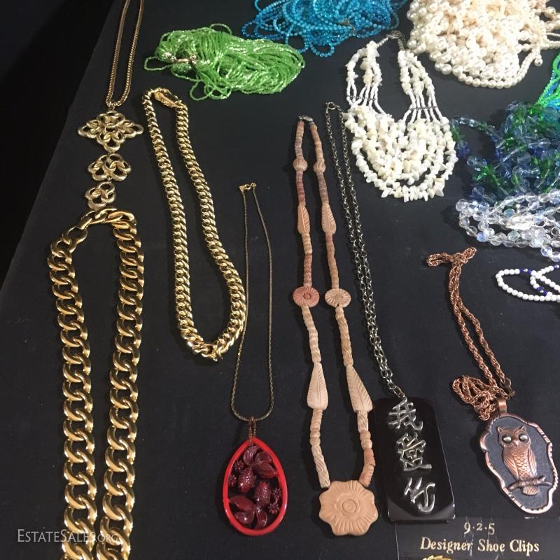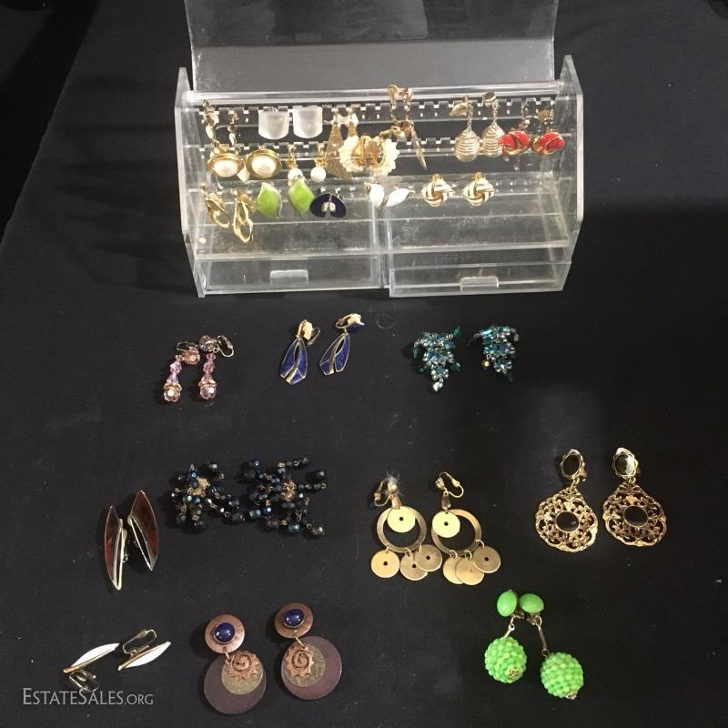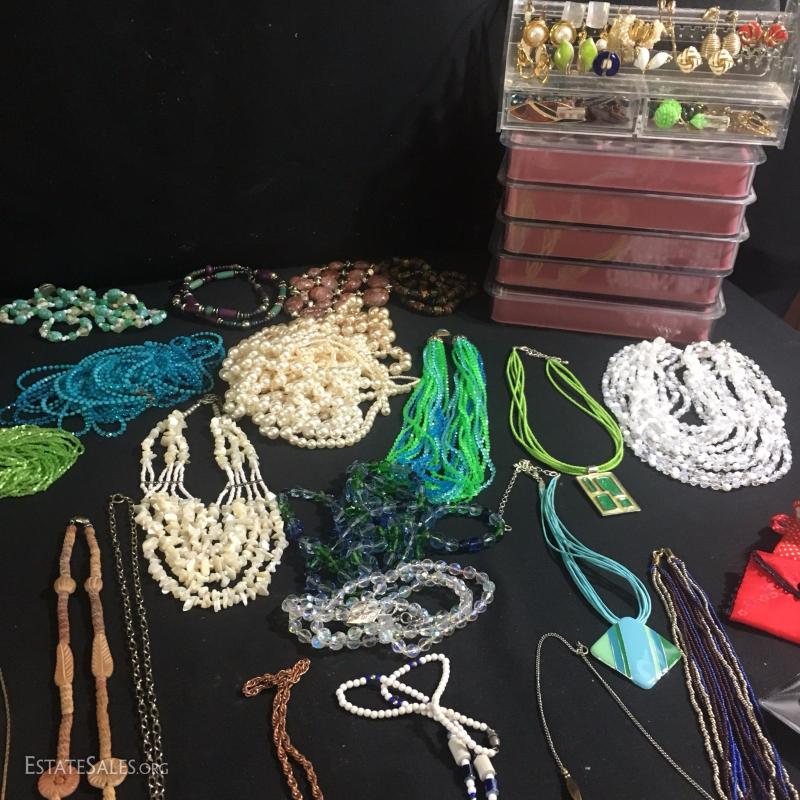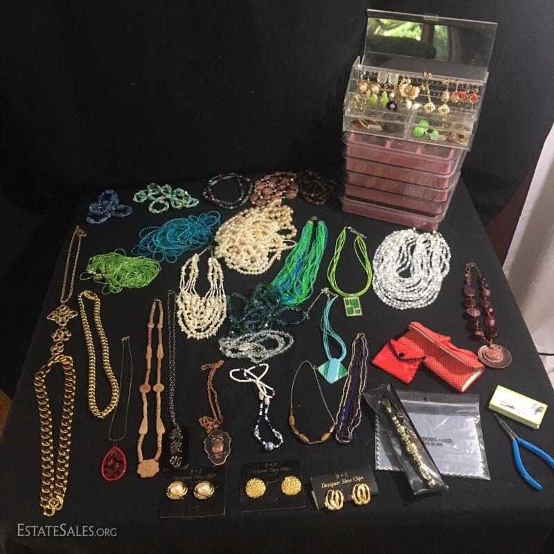 Large lot includes necklaces and clip earrings. See photos. Also includes storage jewelry organizers. jewelry tools and cleaning cloth.