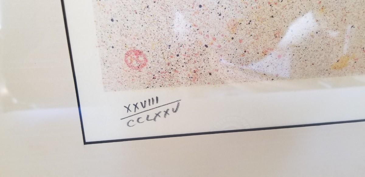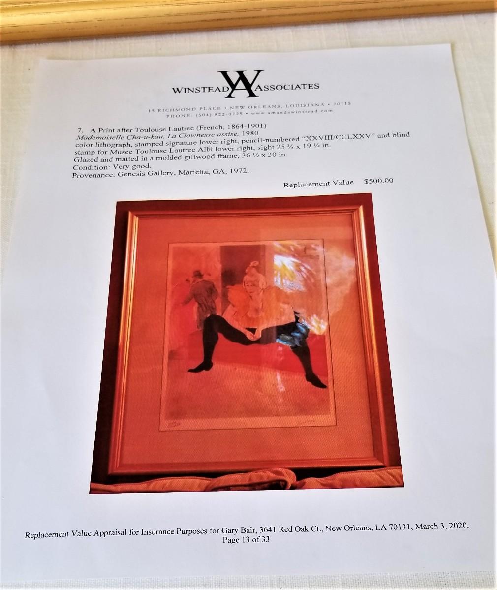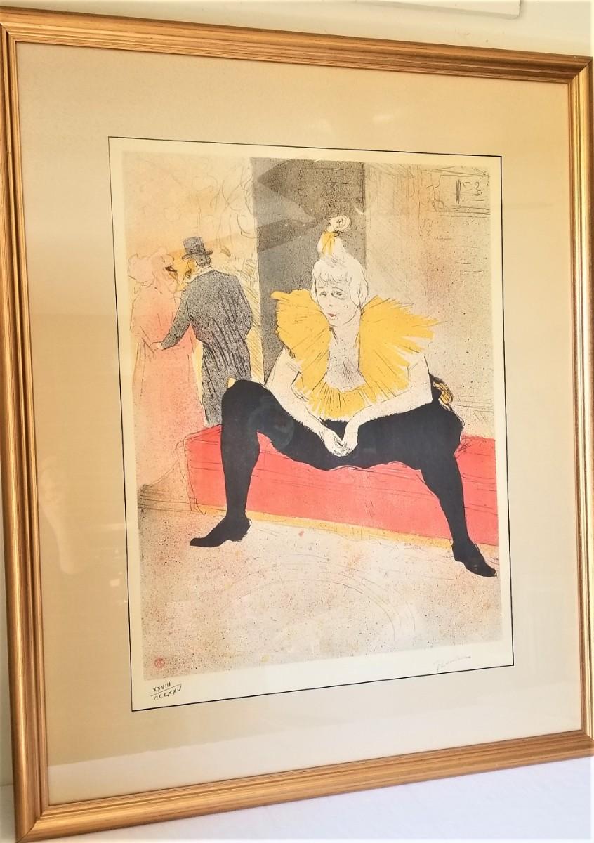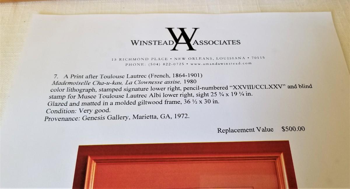 Lithograph, stamped and signed lower right, pencil numbered XXVIII/CCLXXV - blind stamp for Musee Toulouse Lautrec. Measures 36.5" x 30", molded gilt wood frame. This was originally purchased from the Genesis Gallery in Marietta, Georgia. A recent appraisal was done by a certified local appraiser a couple of years ago. A copy comes with the piece. At that time, the appraiser certified the authenticity and stated the insurance value as $500.00. This is a large, well framed piece that will look great in your home.