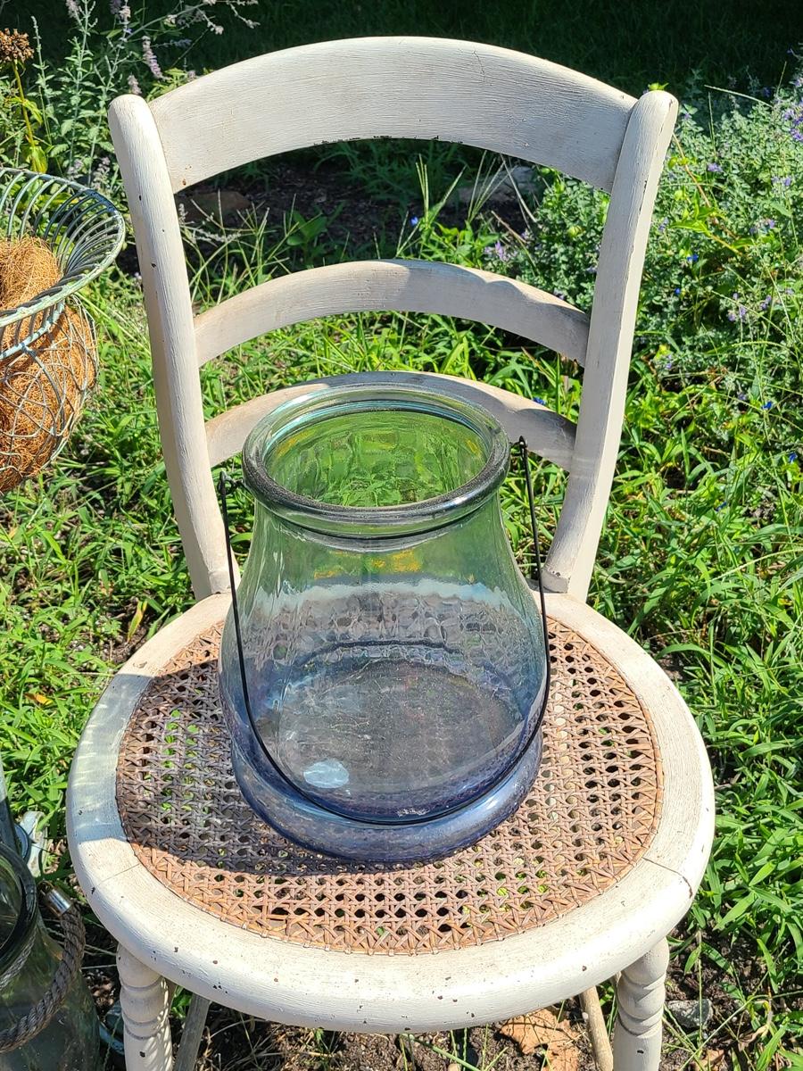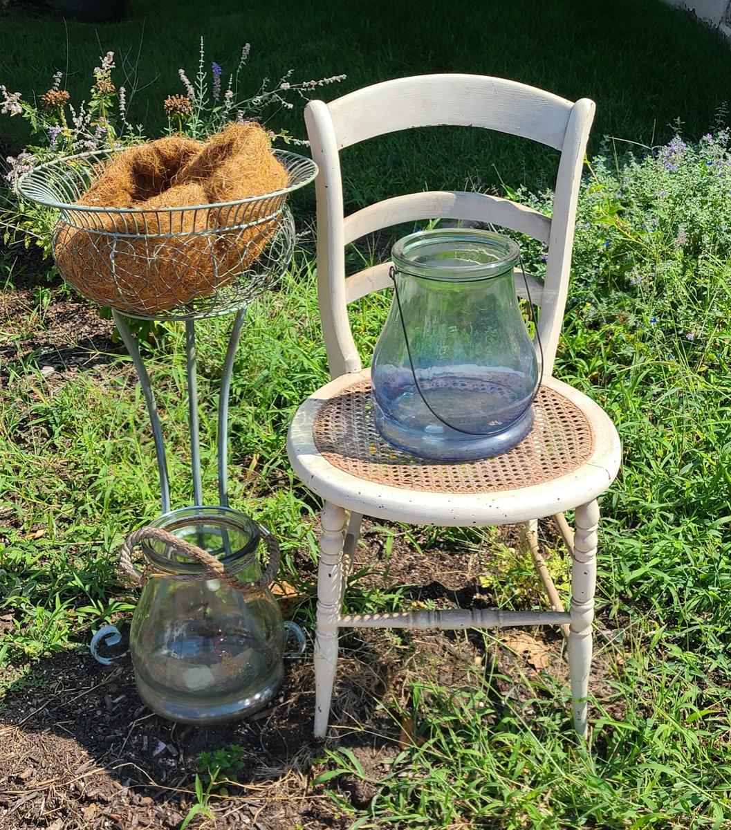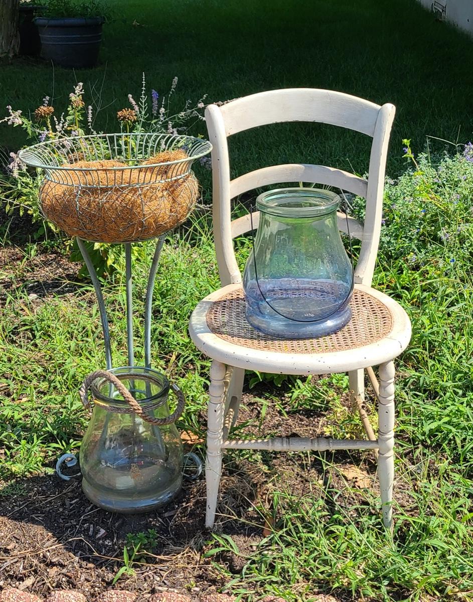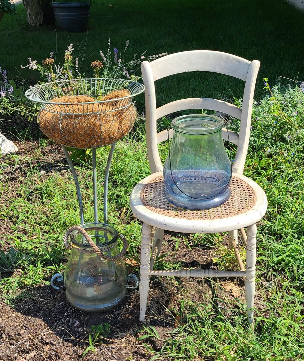 Lot 201: Metal Plant Stand, Vintage Chair and Two Large Glass Candle/Succulents Jars