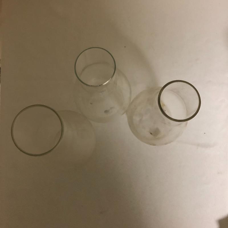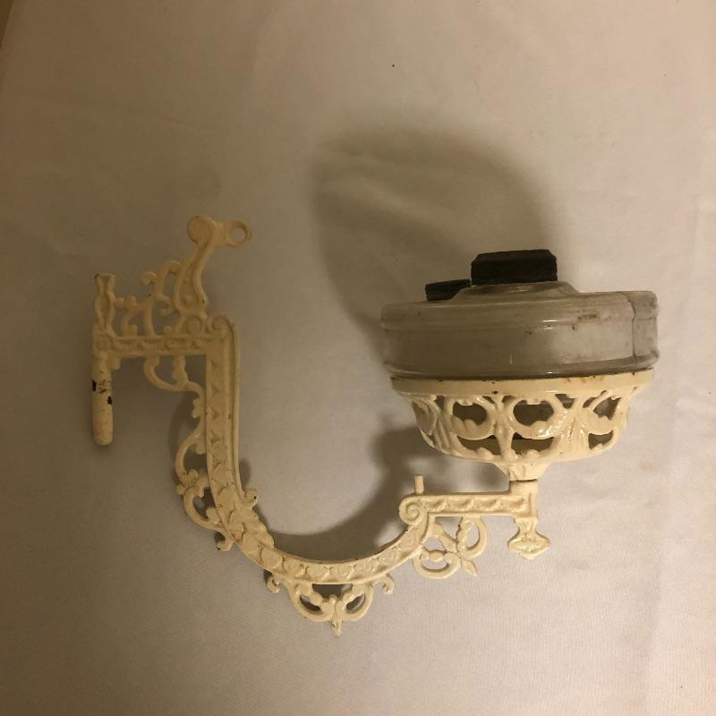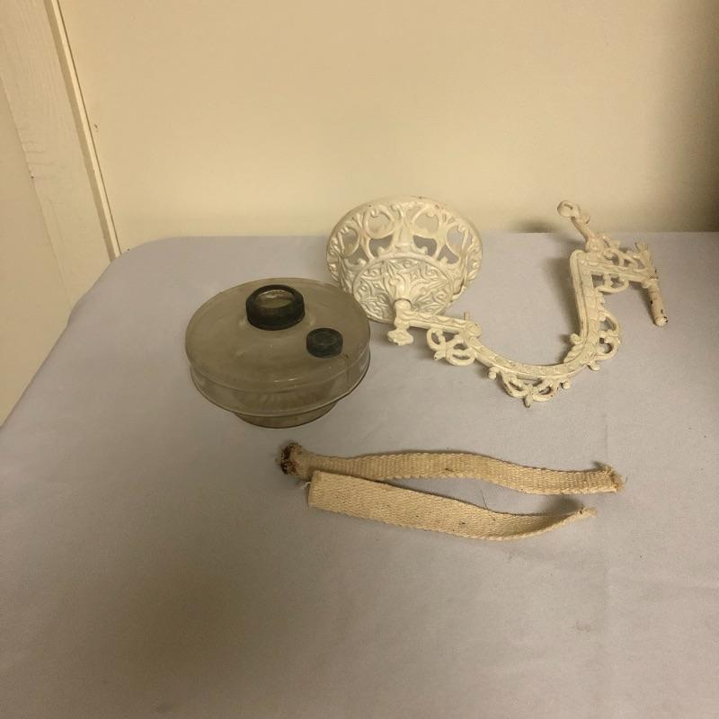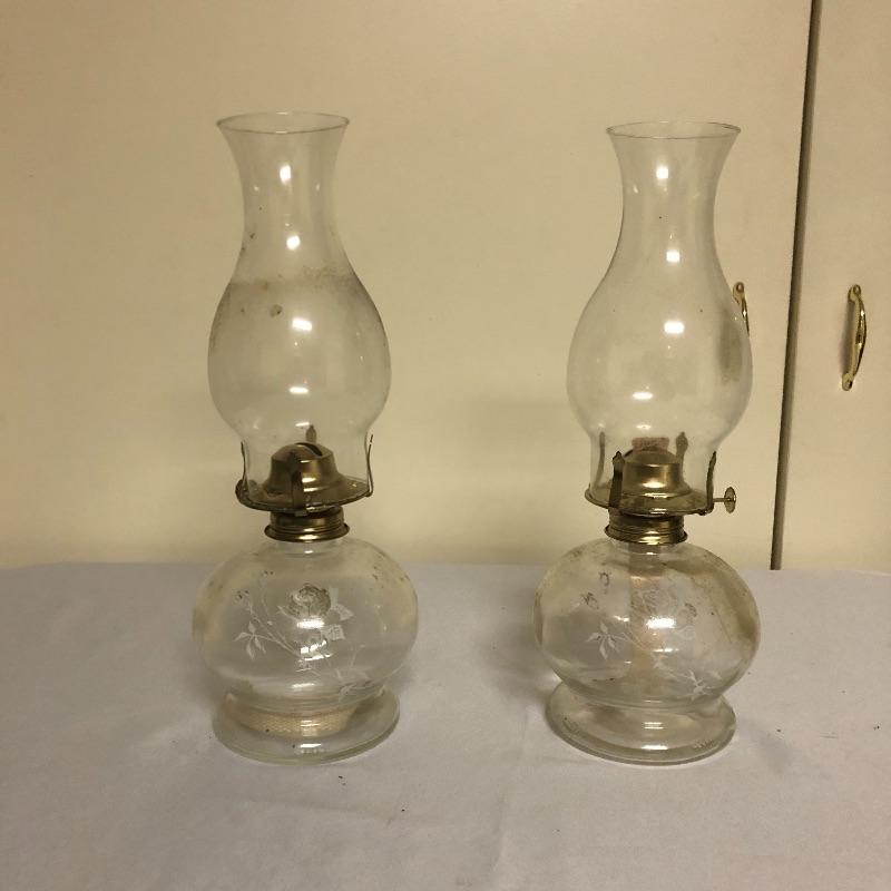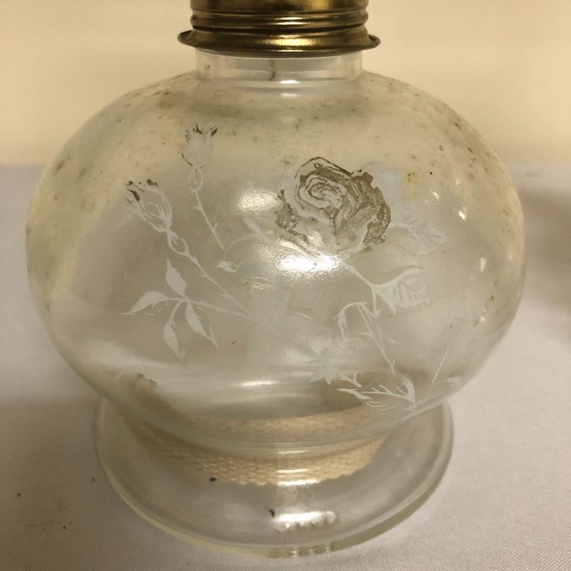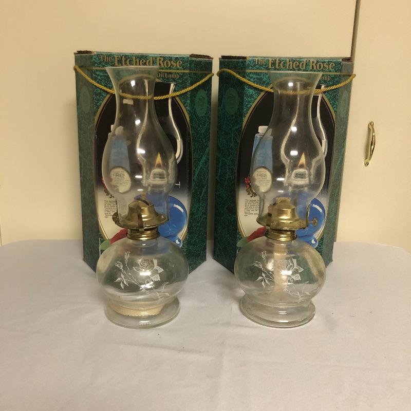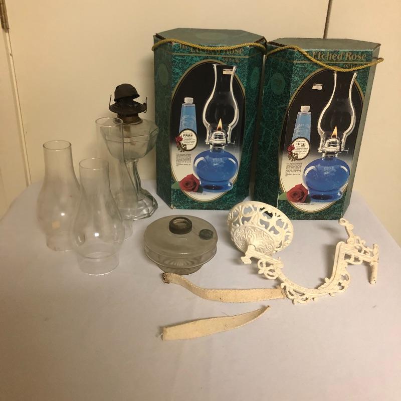 Be ready for the next power outage with these four oil lamps. Lot includes two matching etched rose oil lamps in box, standing lamp and a lamp with a wall bracket. Also includes three glass tops.