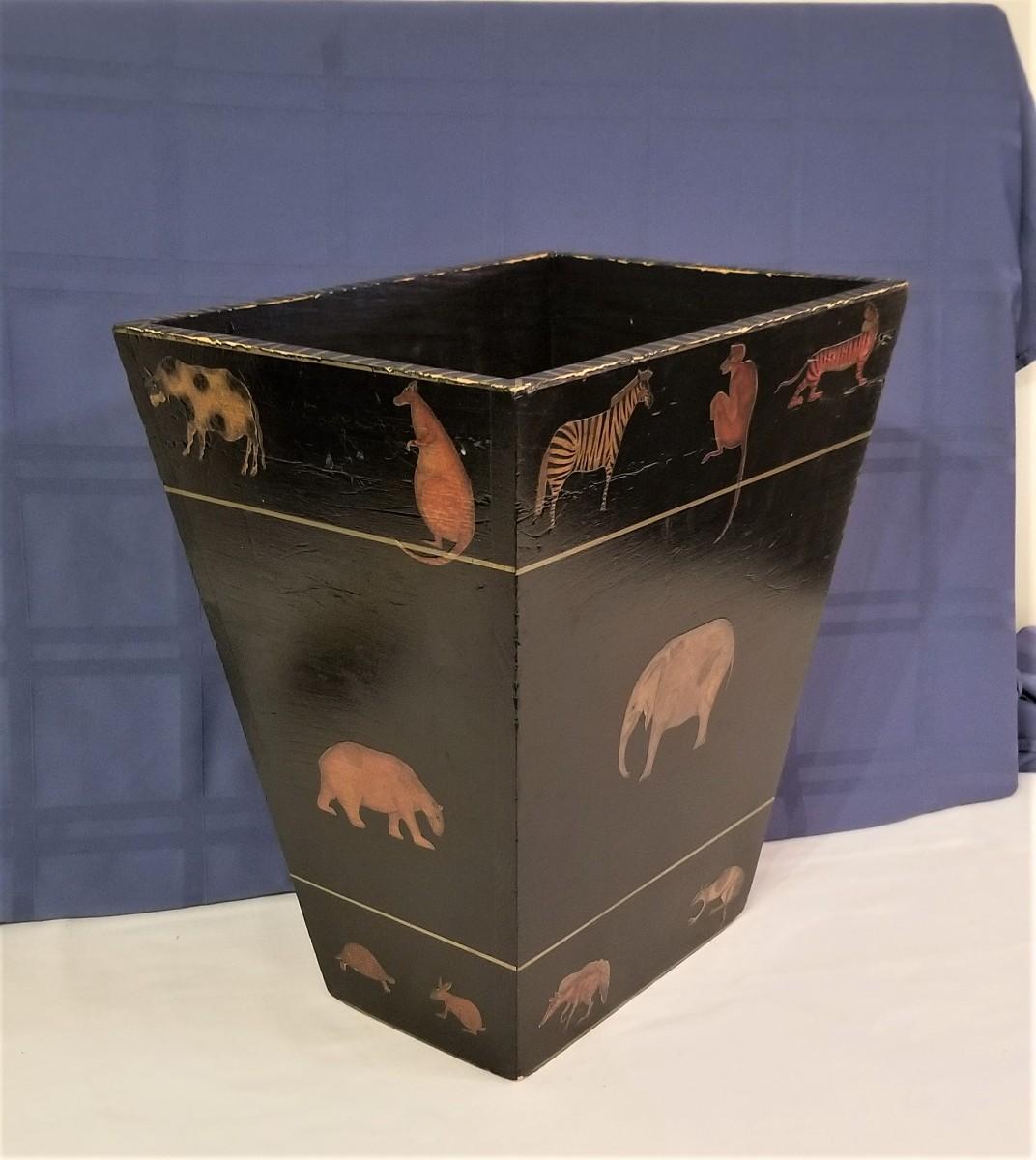 This contemporary decorative papier Mache waste basket has a stylized African theme. Good condition. Measures 12.5" across at tallest point. Decorative piece.