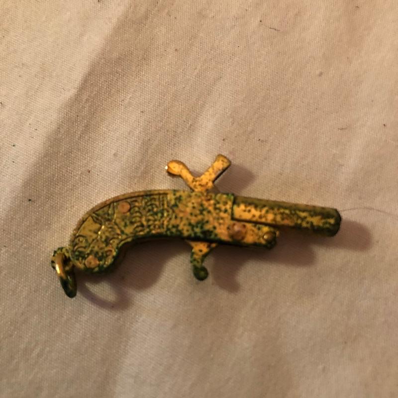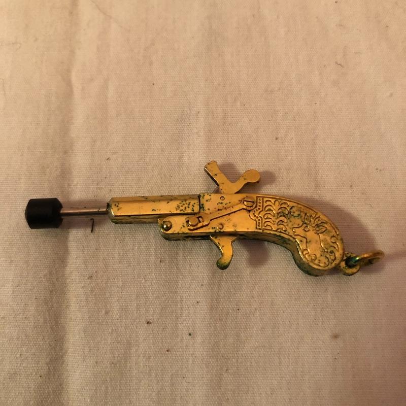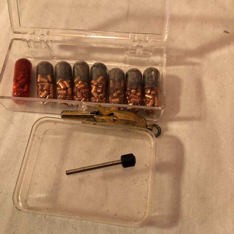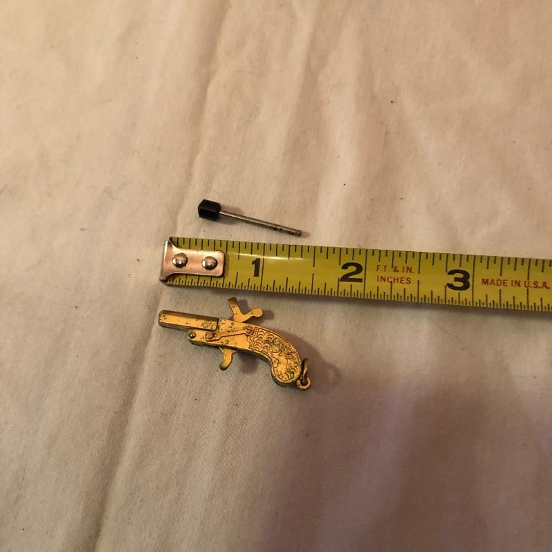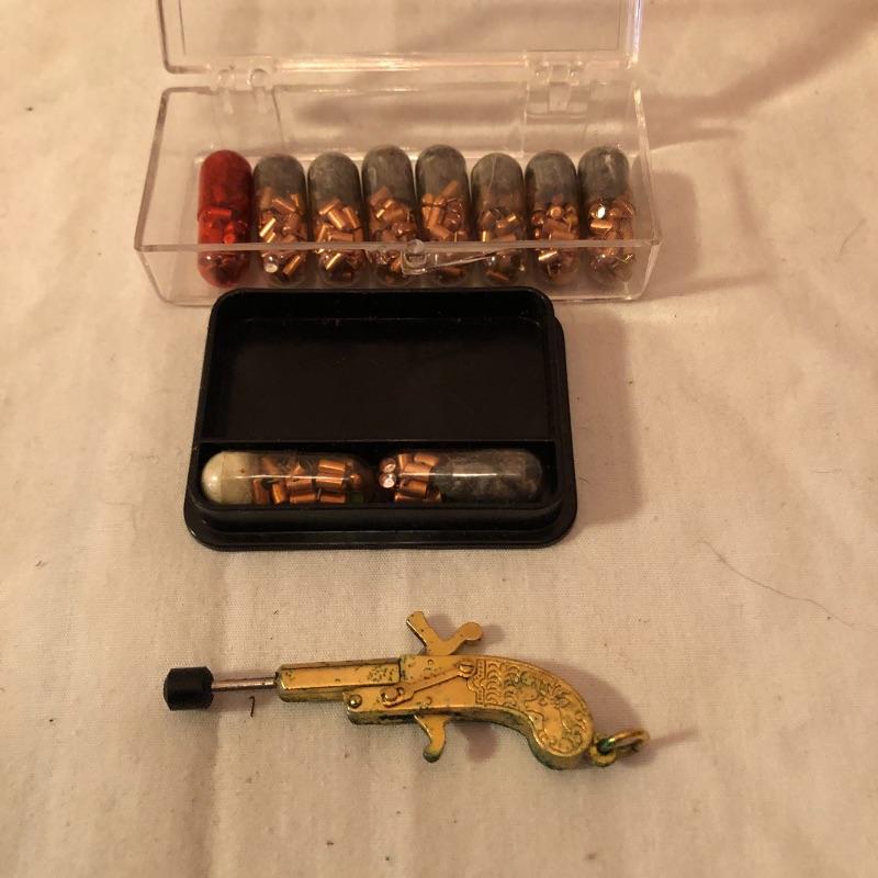 This lot includes a miniature revolver, a miniature ram rod and ten shots. The revolver and ram rod is made of metal. Shipping Available.