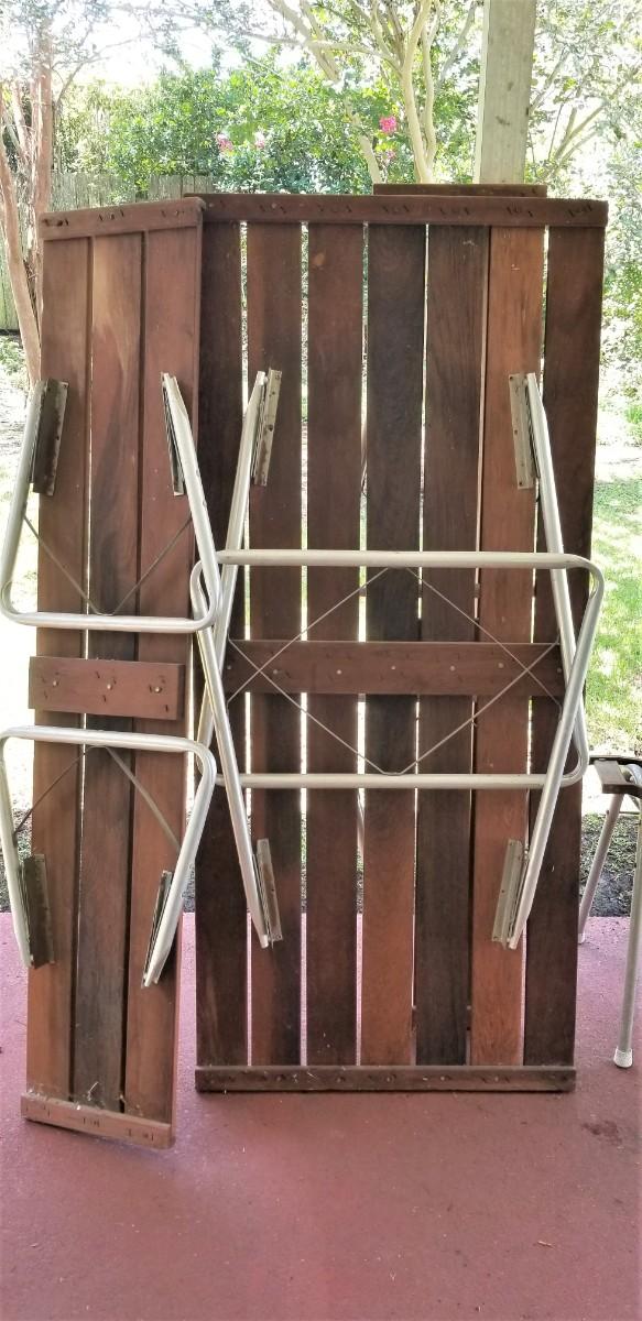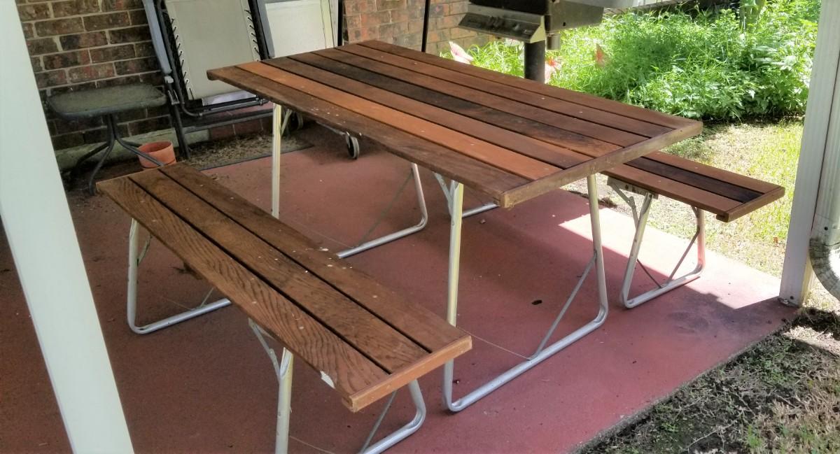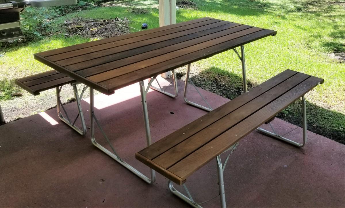 Aluminum base foldable picnic table and two matching benches. Light and easy to carry. Table is 17.5" tall - seats are 5 feet across. Good condition.