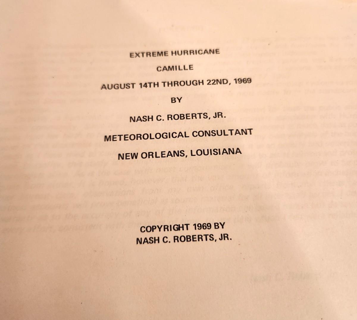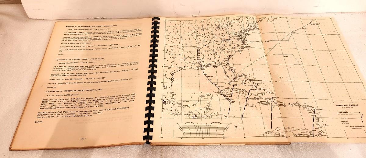 135 pages of charts, maps, etc tracking Hurricane Camille - August, 1969. Published and written by famed New Orleans weatherman Nash Roberts.
