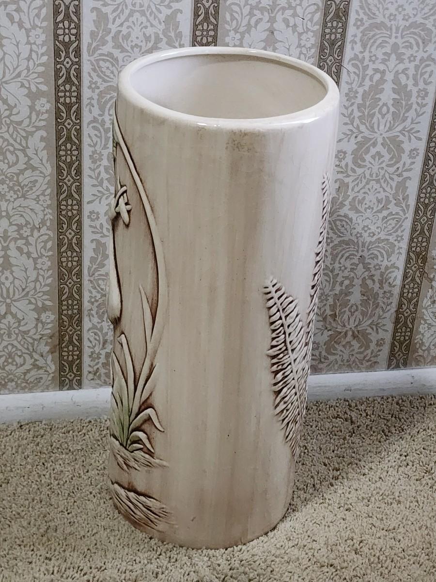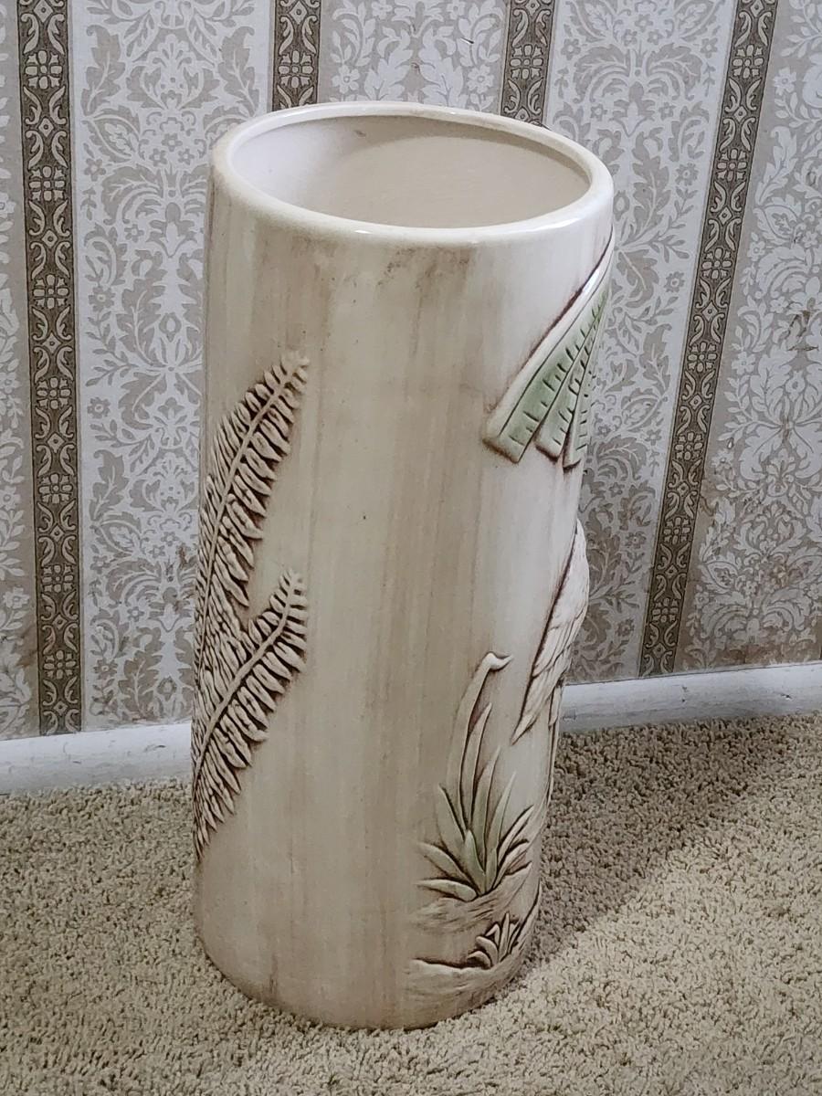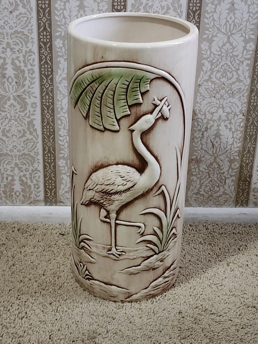 Lot 201: MCM Vintage Marcia California Pottery Flamingo Brown Green Ceramic Umbrella Stand Umbrella and three umbrellas