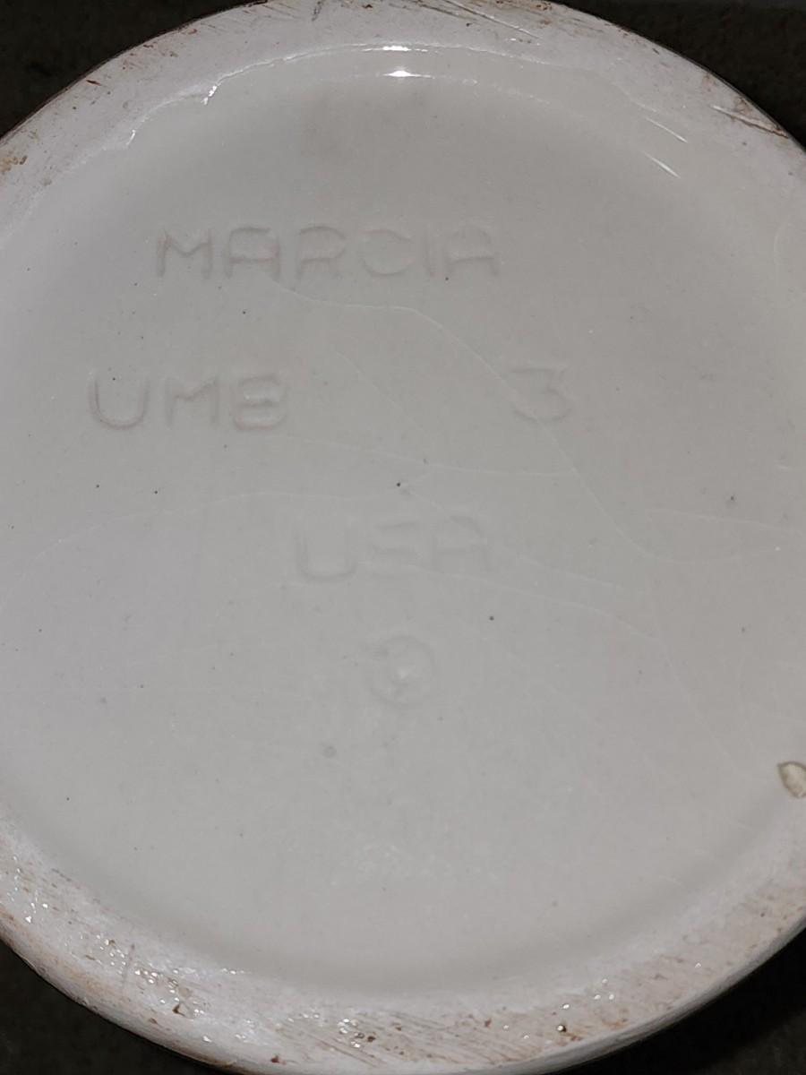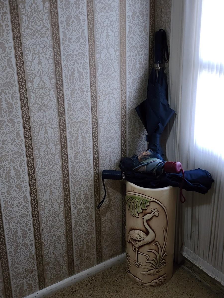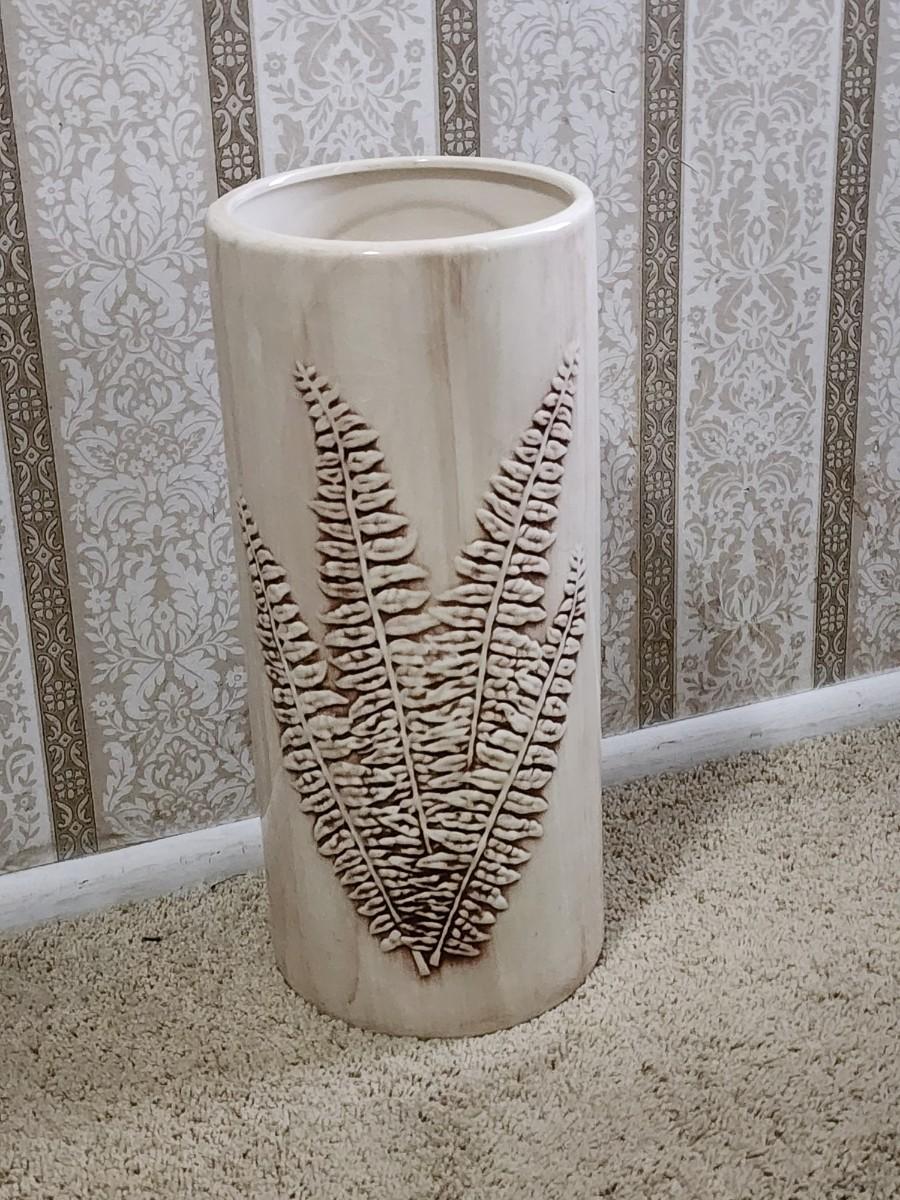 Lot 201: MCM Vintage Marcia California Pottery Flamingo Brown Green Ceramic Umbrella Stand Umbrella and three umbrellas