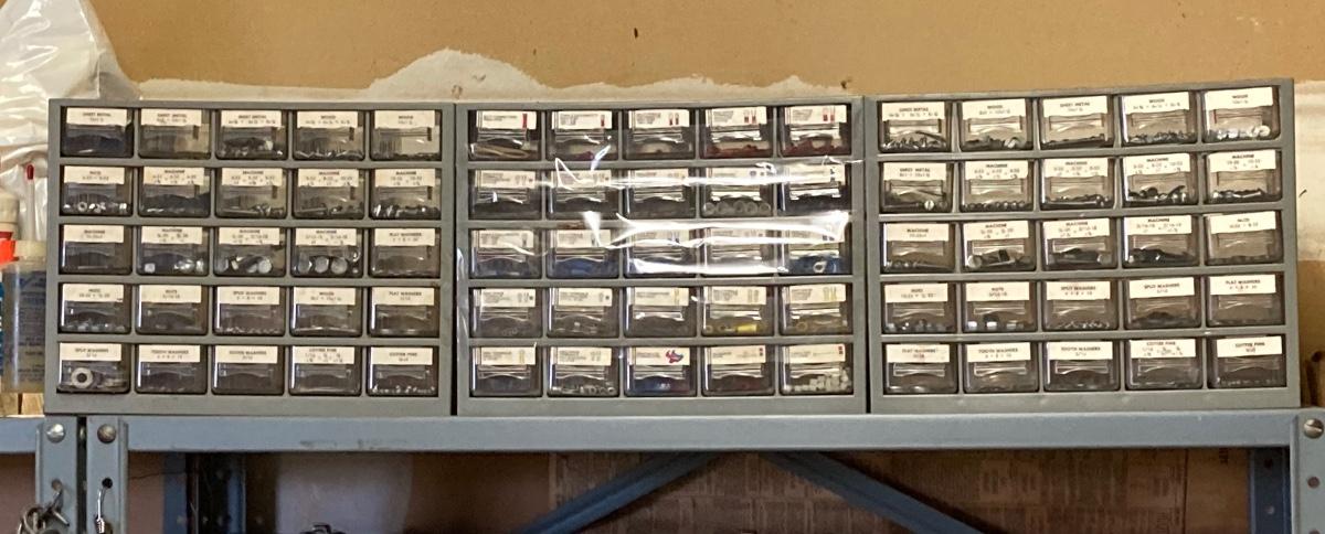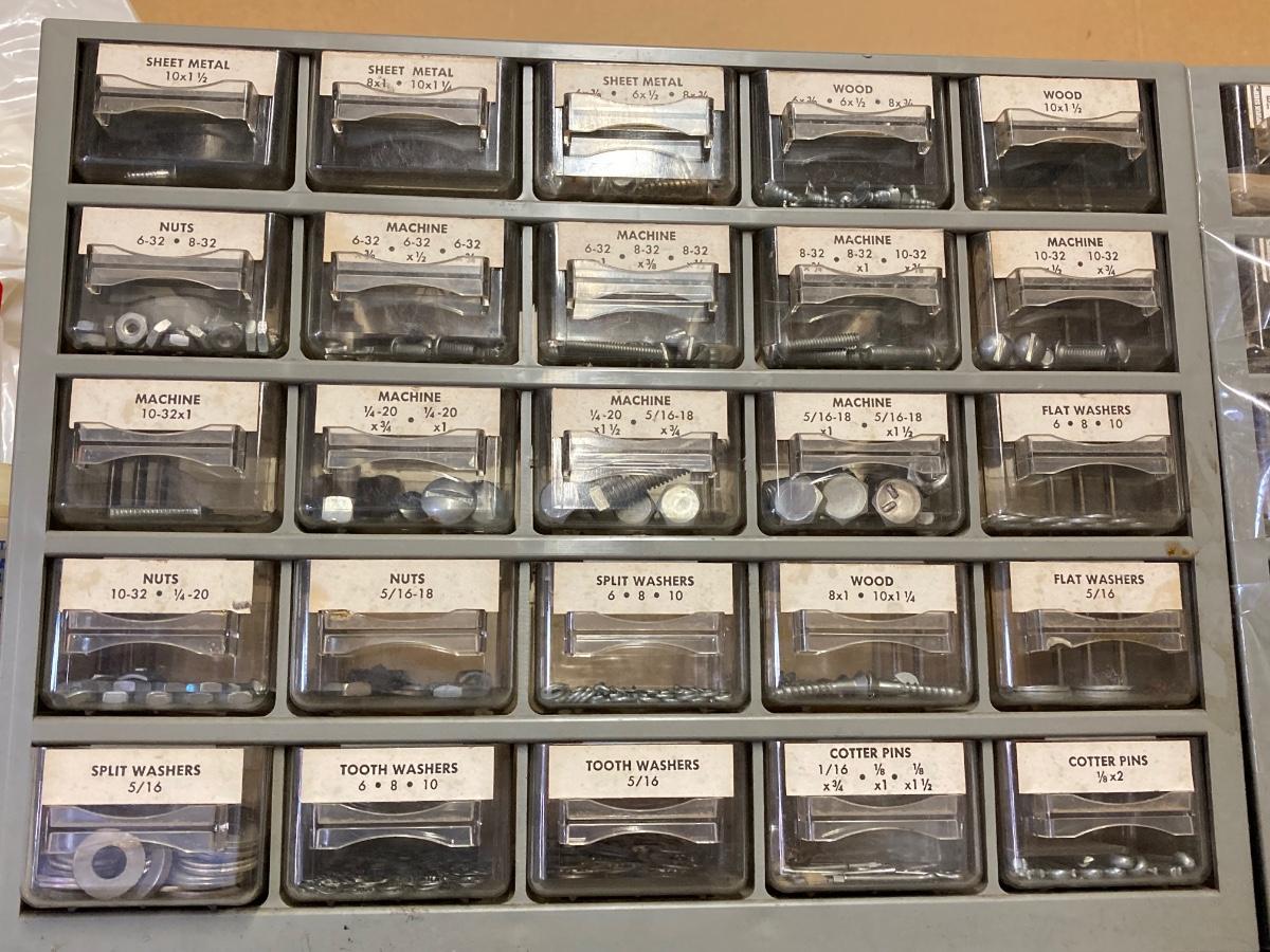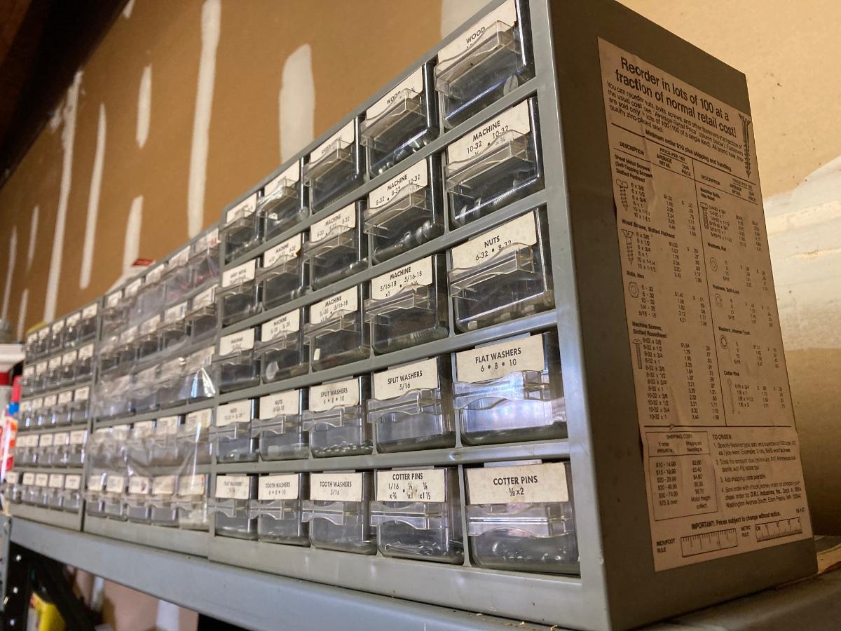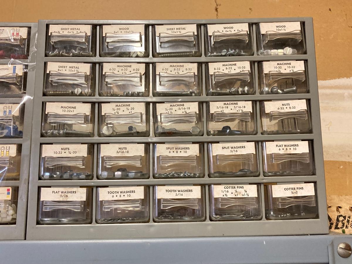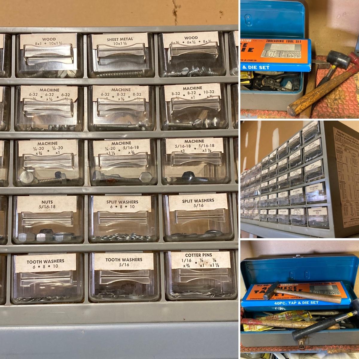 LOT 201J: Garage Finds - Three Storage Drawers Filled with Hardware / Tool Box and Contents
