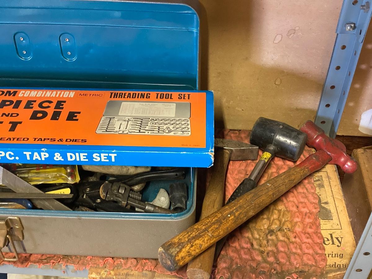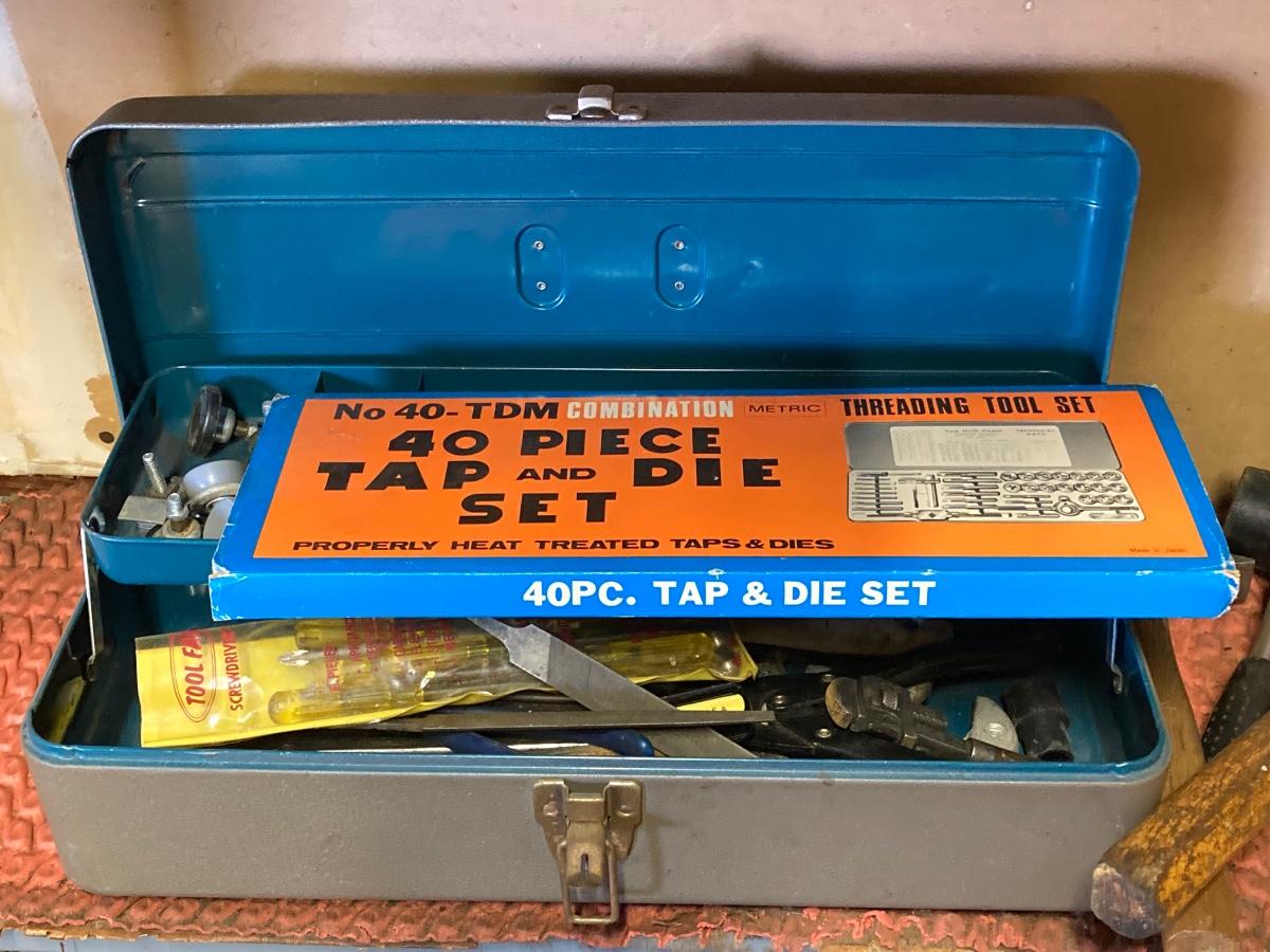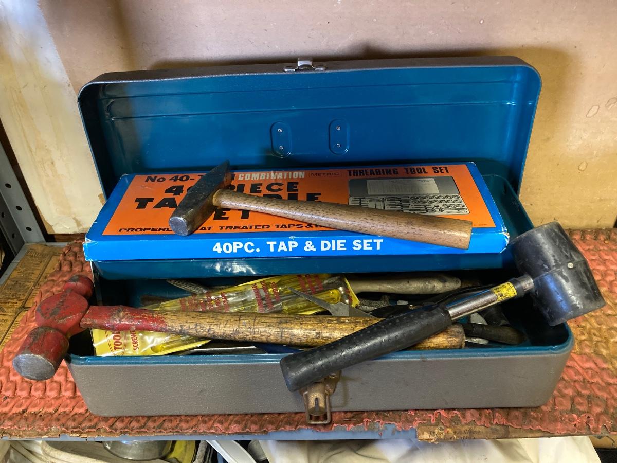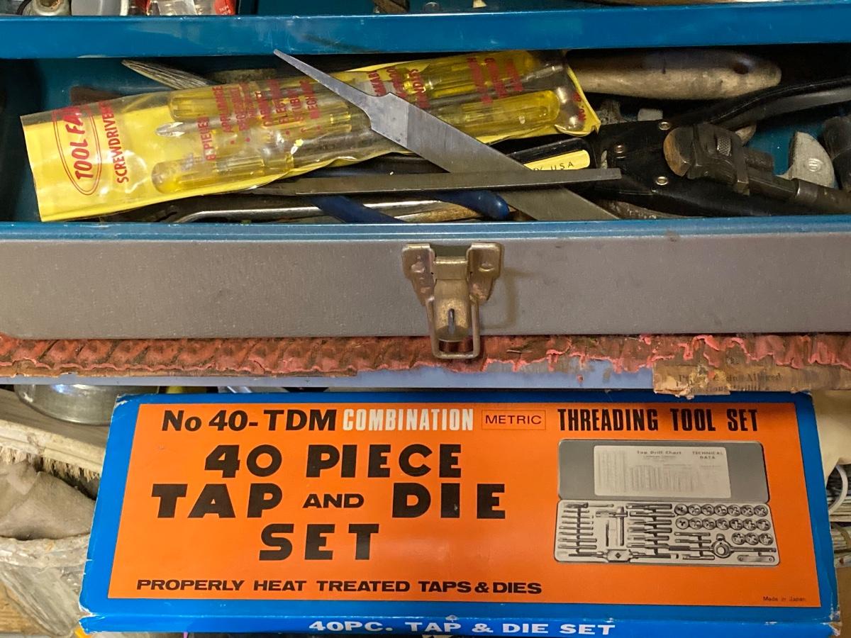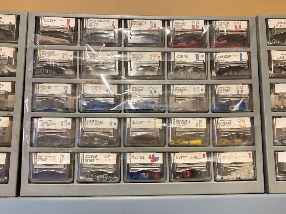 LOT 201J: Garage Finds - Three Storage Drawers Filled with Hardware / Tool Box and Contents