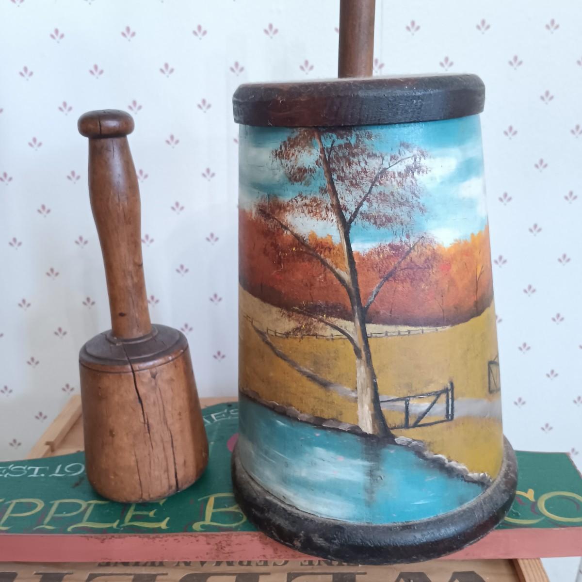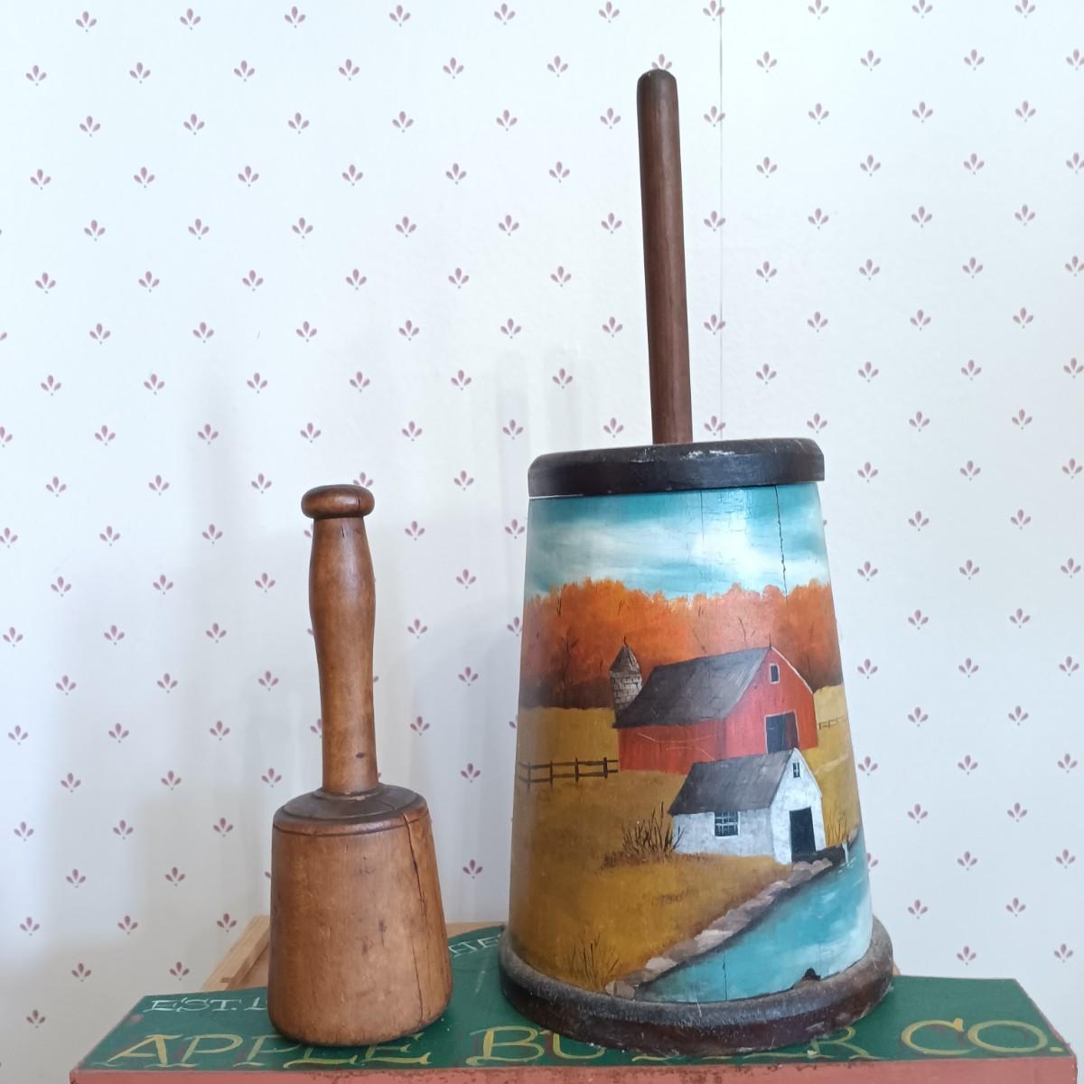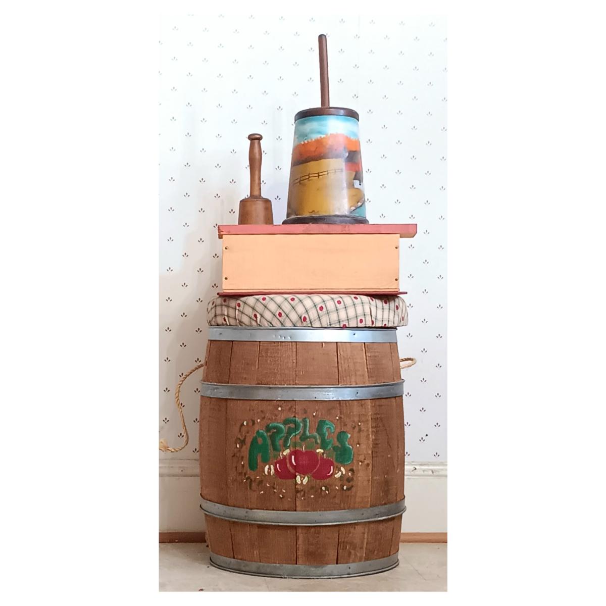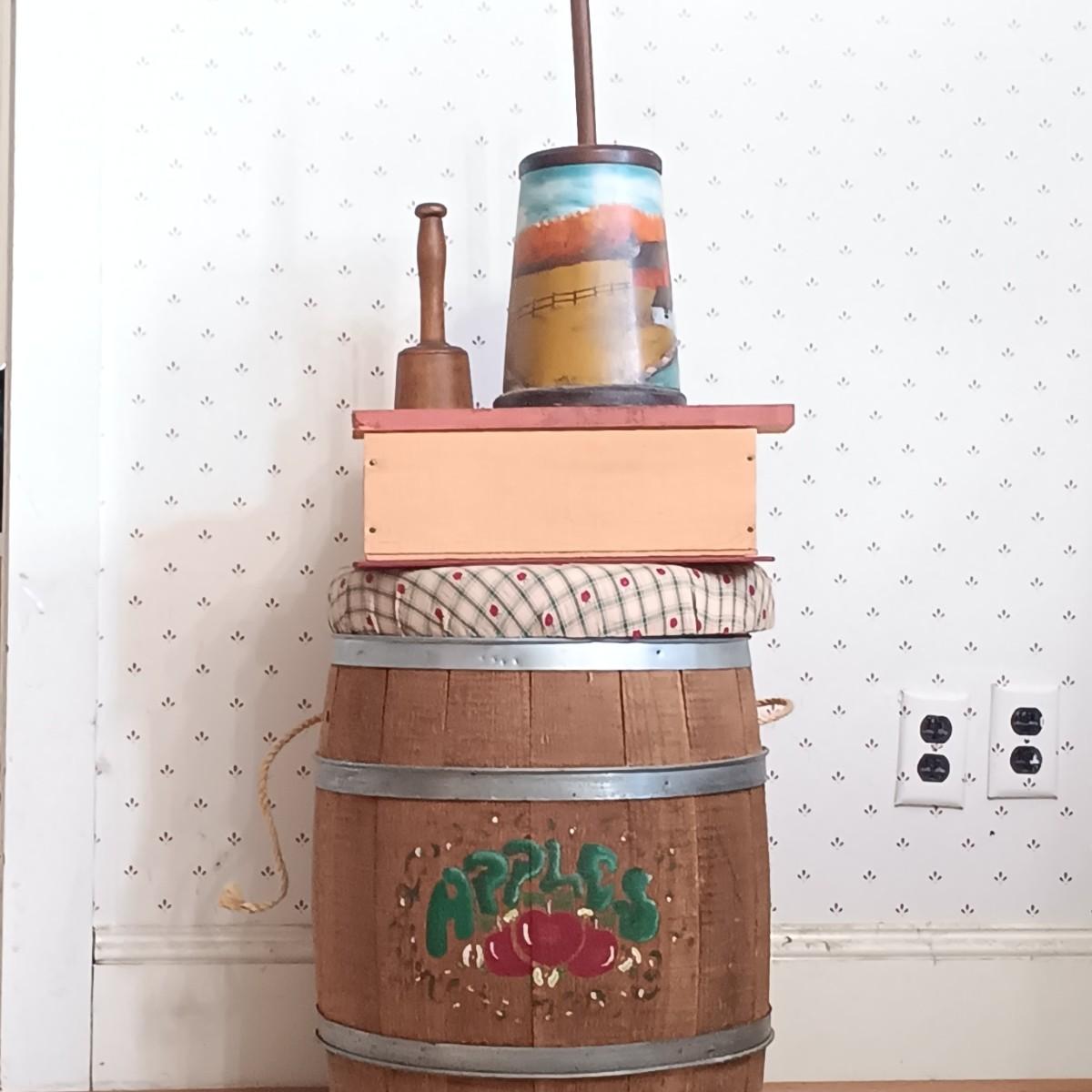 LOT 201K: Vintage Barrel Stool w/ Kitchen Tools, Handpainted Butter Churn & More
