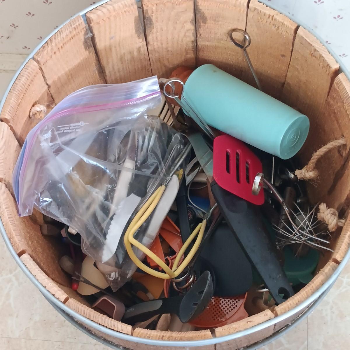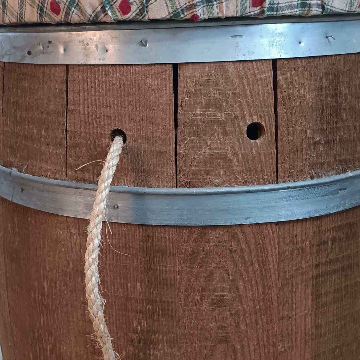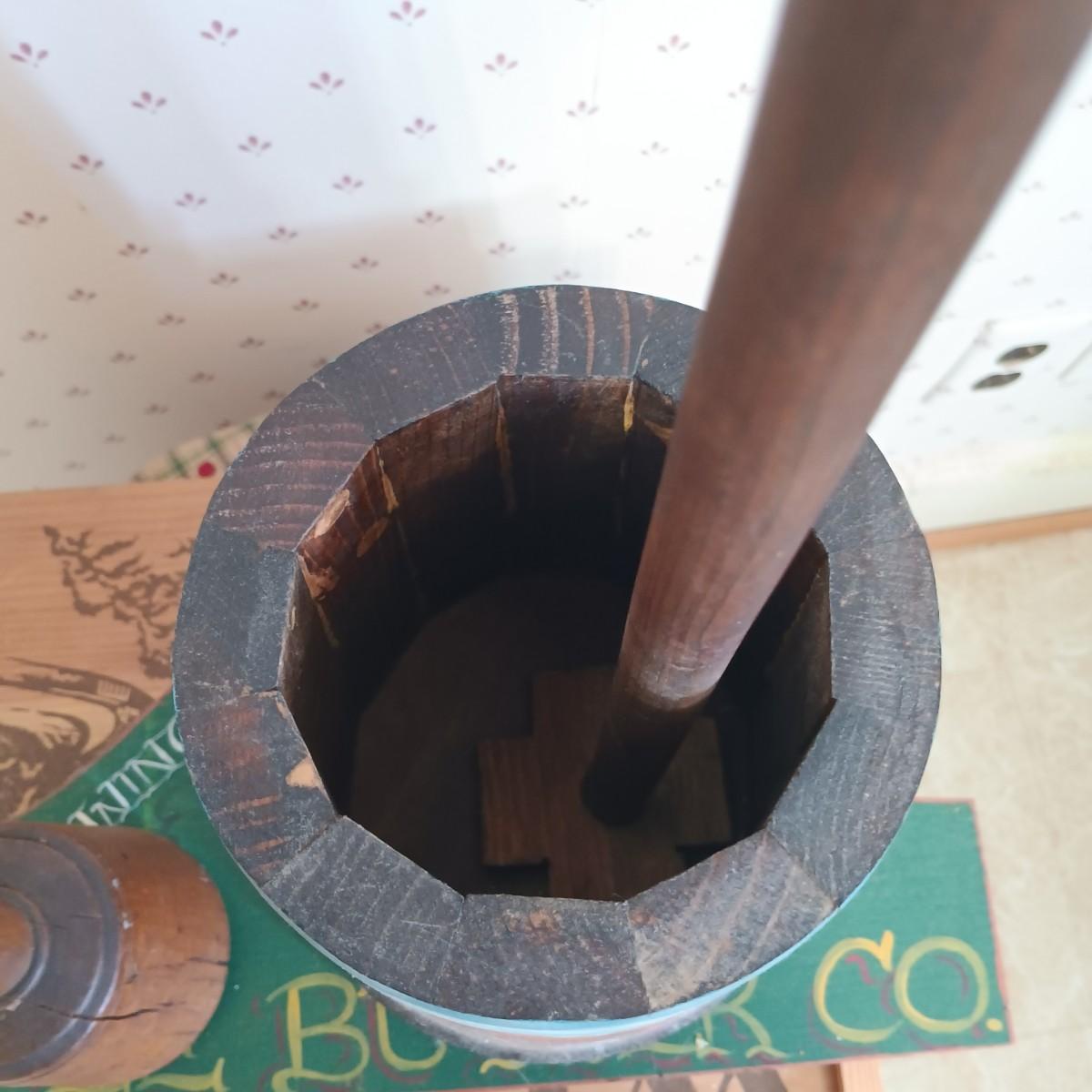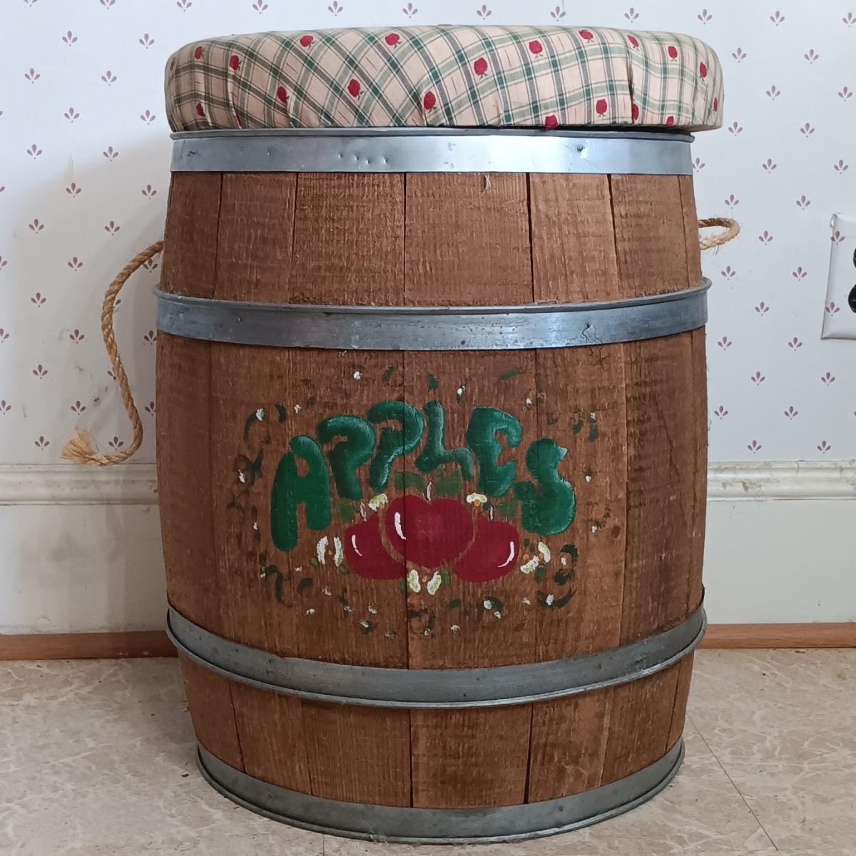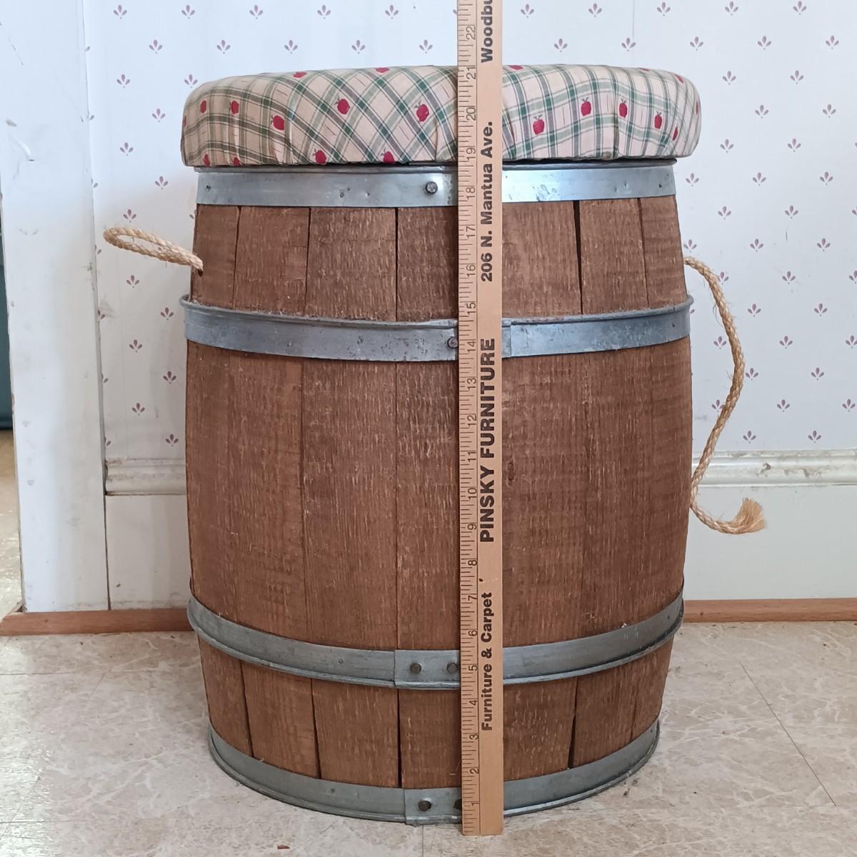 LOT 201K: Vintage Barrel Stool w/ Kitchen Tools, Handpainted Butter Churn & More