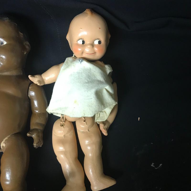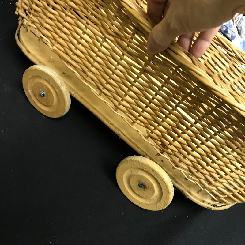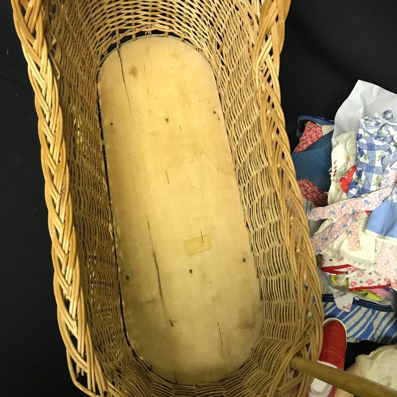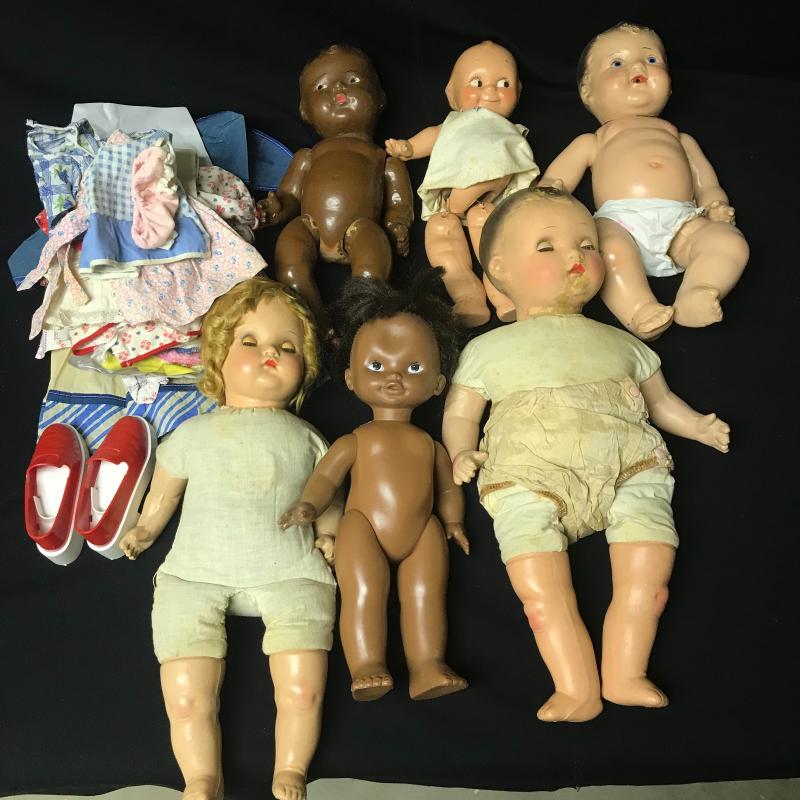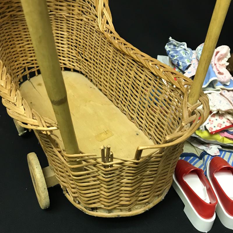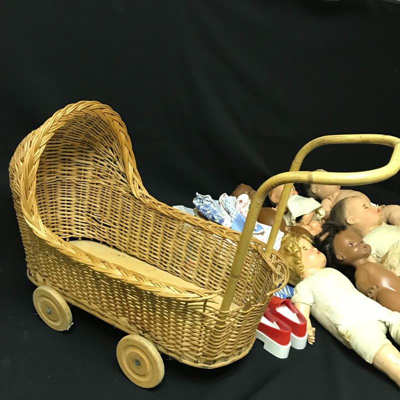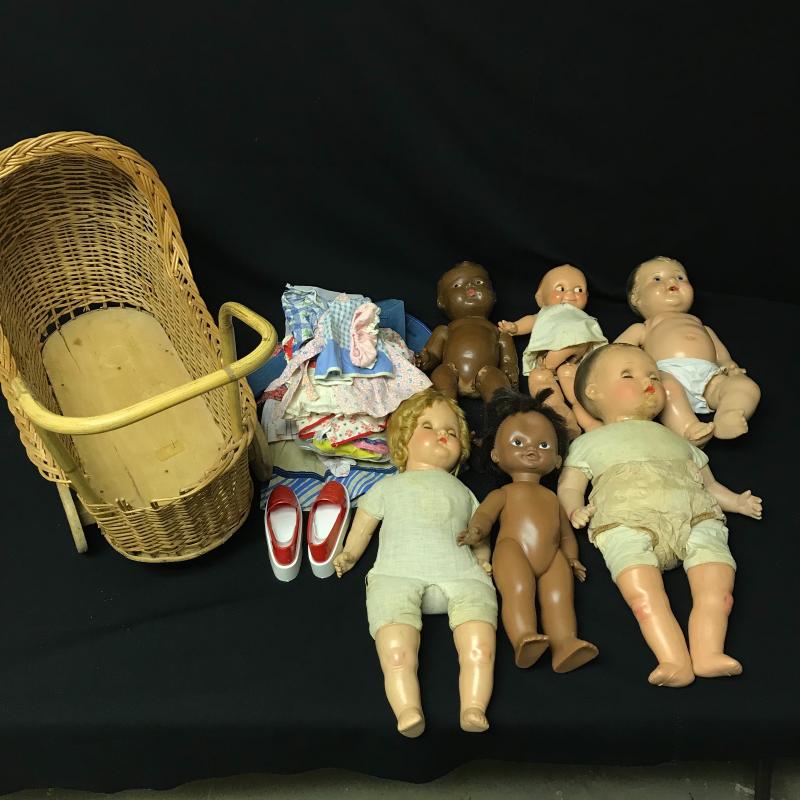 Six play dolls! No markings that were seen. Most are older and pieces are in good shape but need some repair. One is a soft body and the rest are moving parts. Clothes are various sizes and may or may not fit these dolls. Wicker carriage with little damage and needs reinforcing at base. Local pick up only.