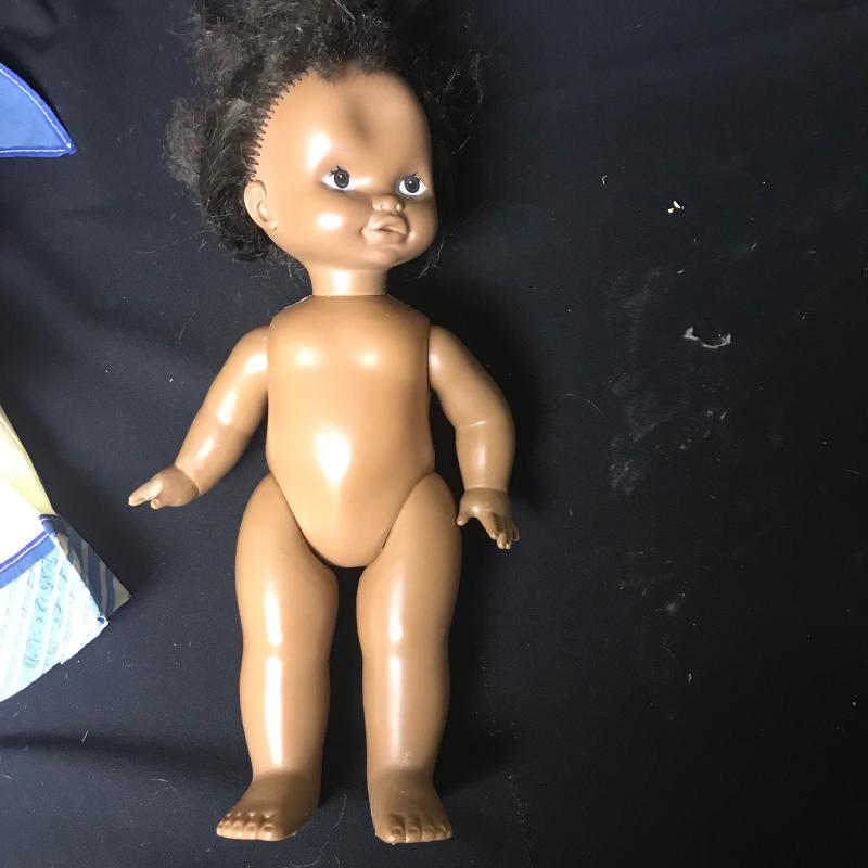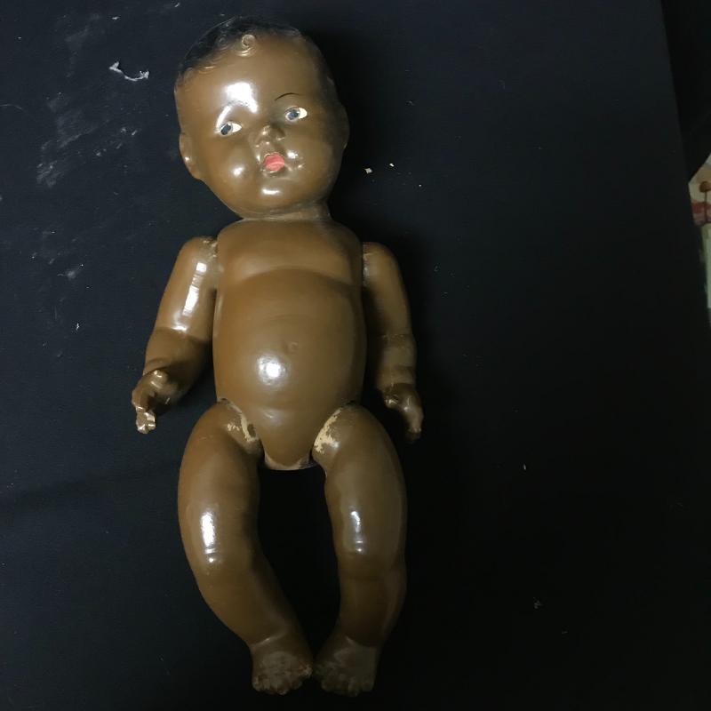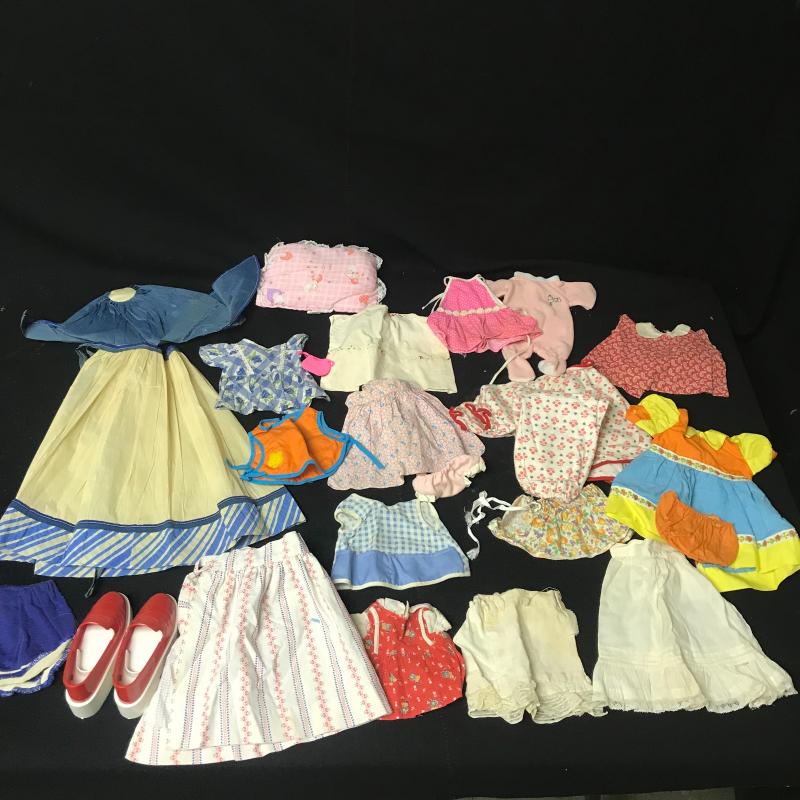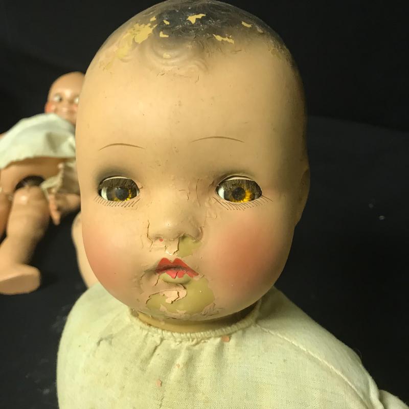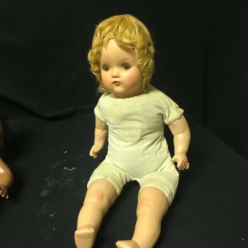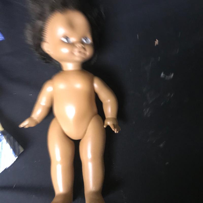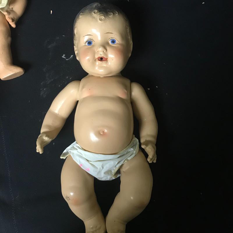 Six play dolls! No markings that were seen. Most are older and pieces are in good shape but need some repair. One is a soft body and the rest are moving parts. Clothes are various sizes and may or may not fit these dolls. Wicker carriage with little damage and needs reinforcing at base. Local pick up only.