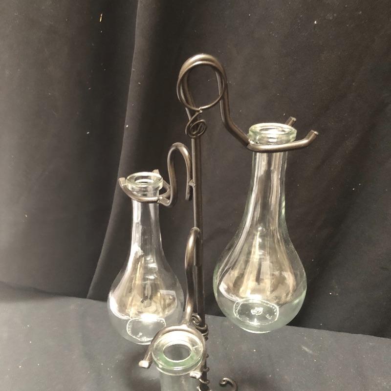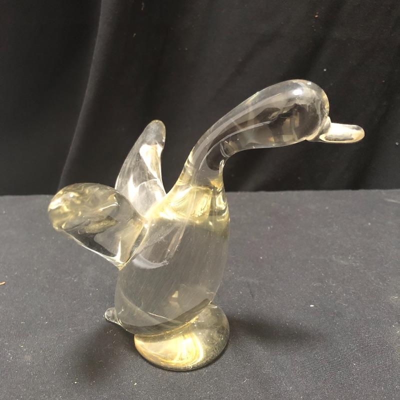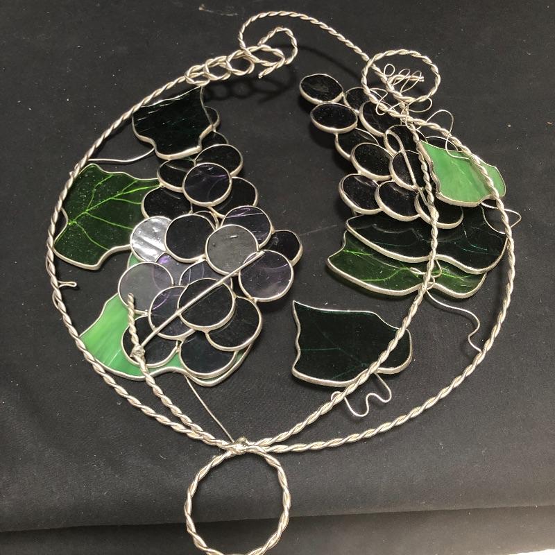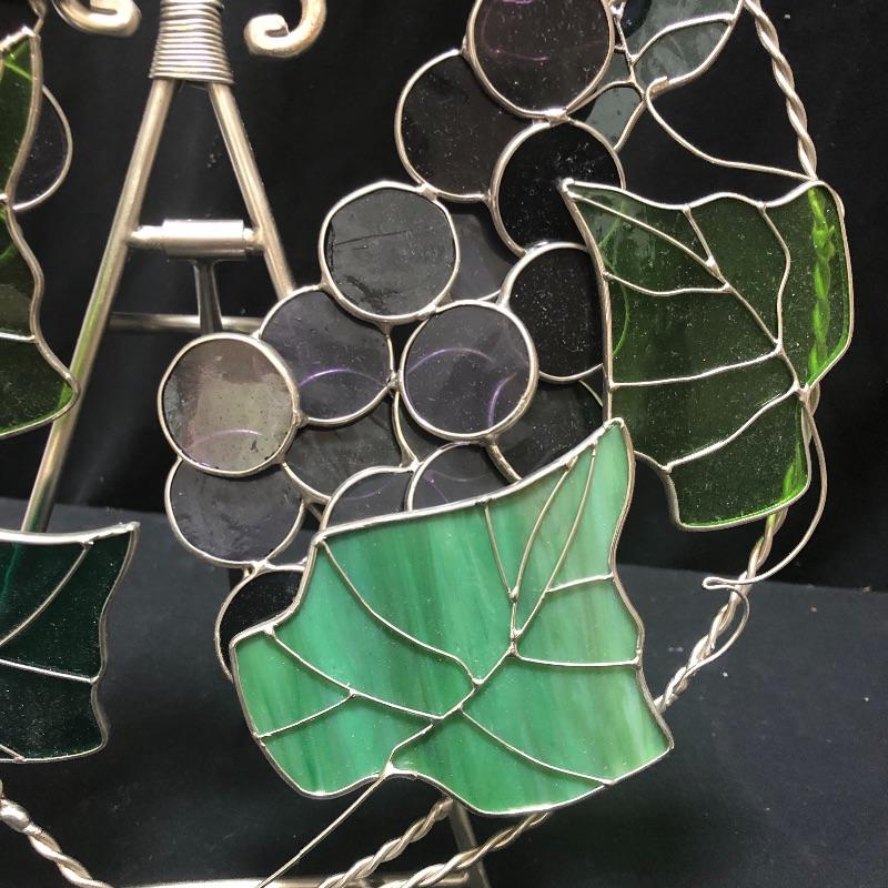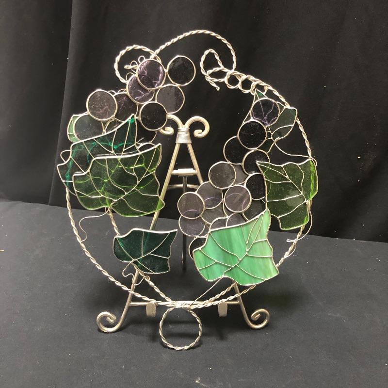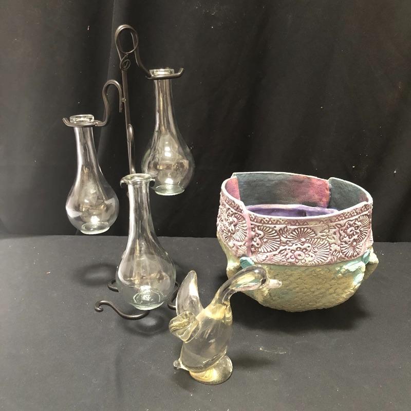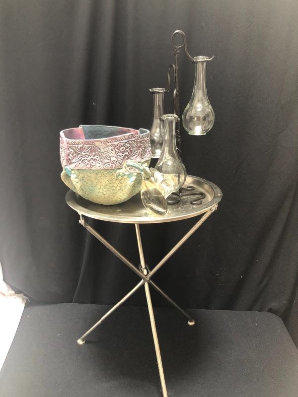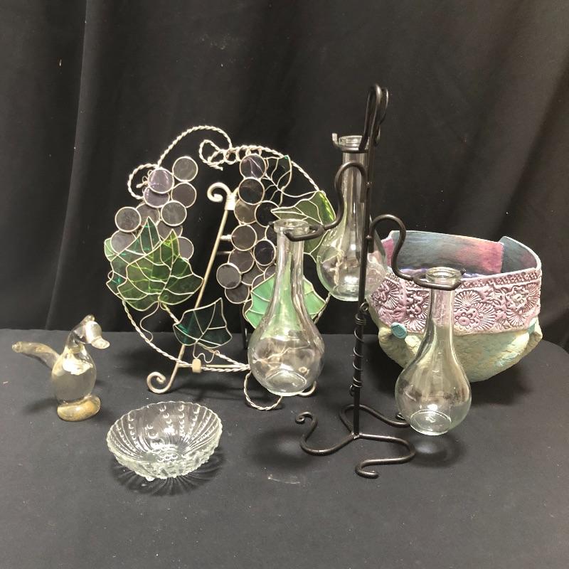 Lot includes signed pottery, glass duck, small footed bowl, metal wire & grape stain glass art and three bottles on a metal caddy. Pottery measures 8”D x 7” tall and table measures 15”D x 21”.