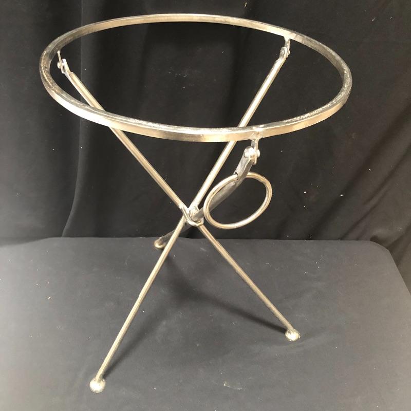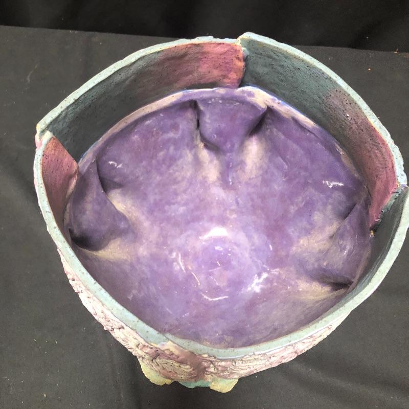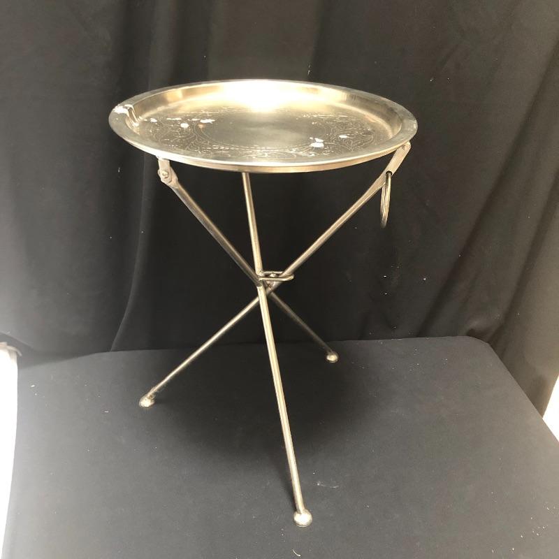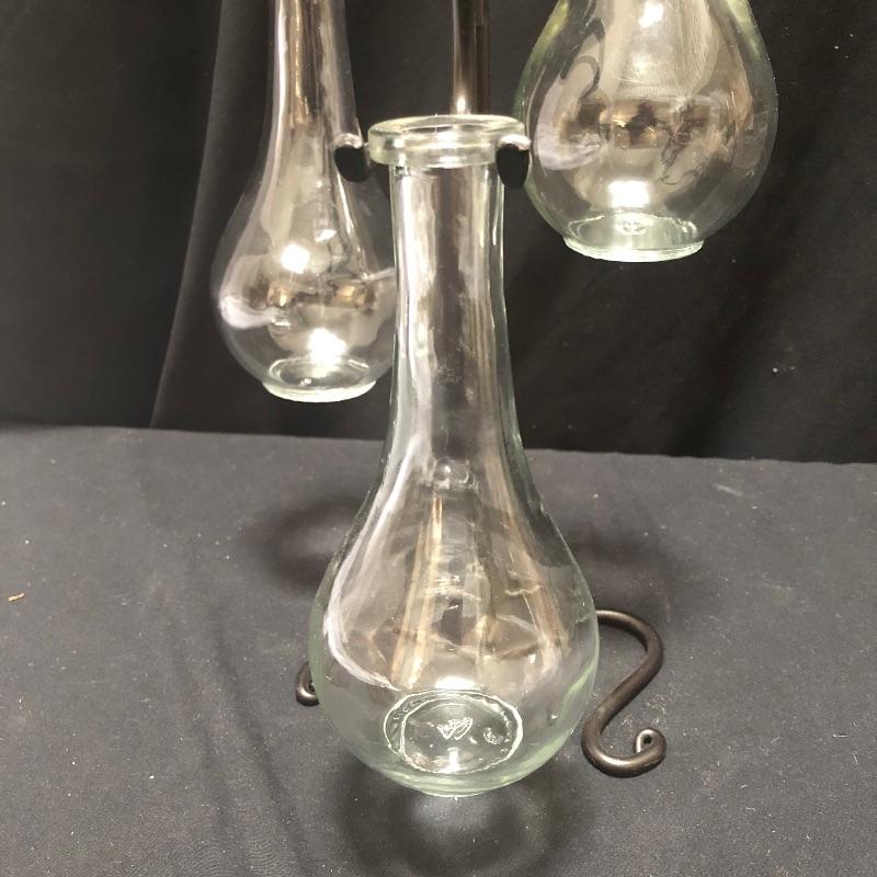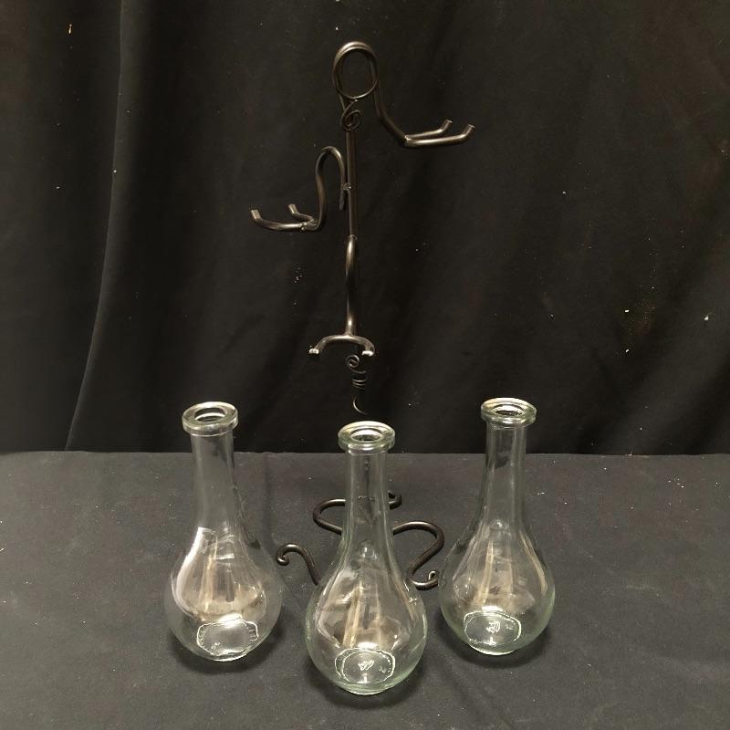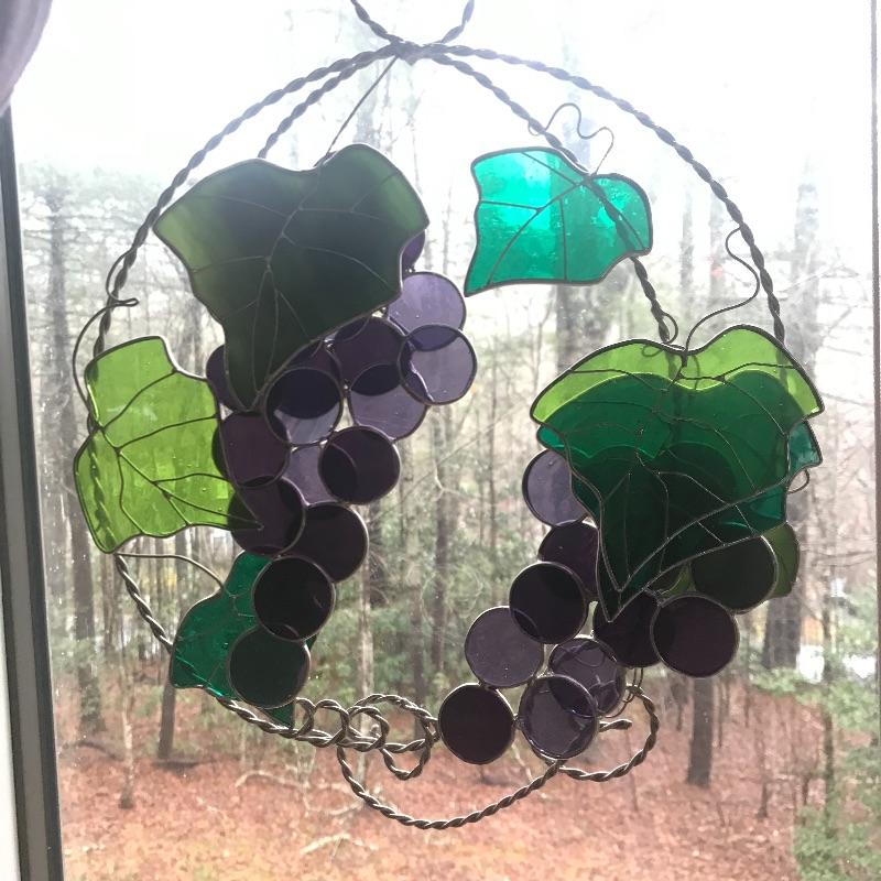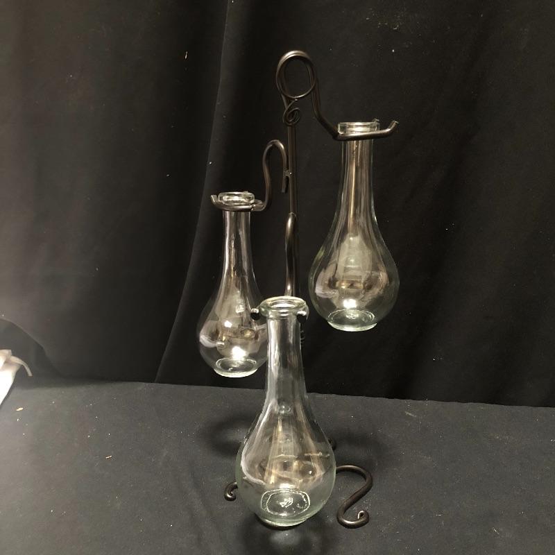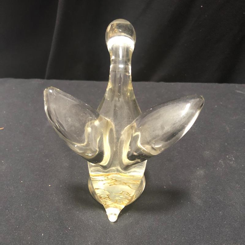 Lot includes signed pottery, glass duck, small footed bowl, metal wire & grape stain glass art and three bottles on a metal caddy. Pottery measures 8”D x 7” tall and table measures 15”D x 21”.
