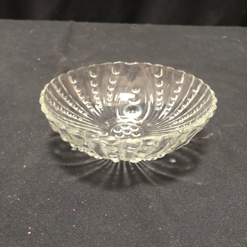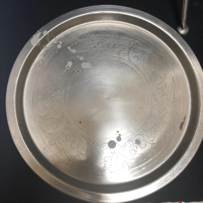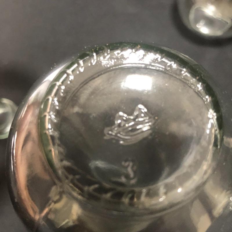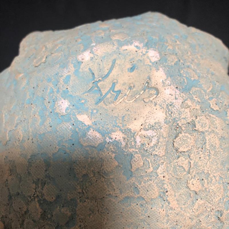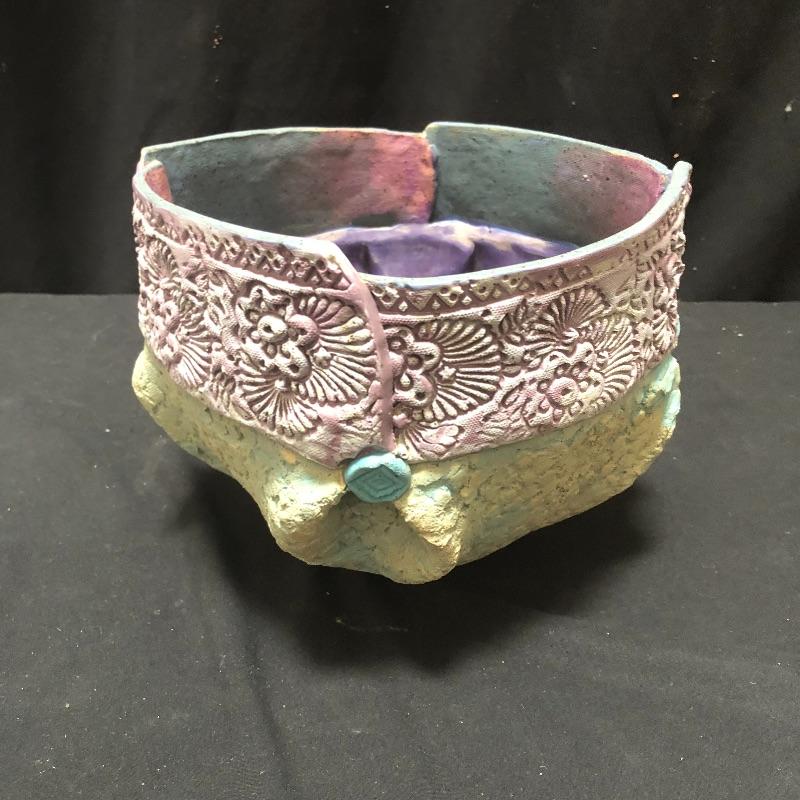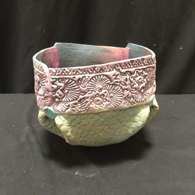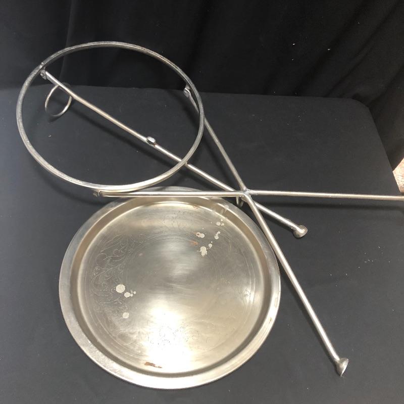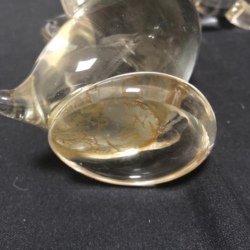 Lot includes signed pottery, glass duck, small footed bowl, metal wire & grape stain glass art and three bottles on a metal caddy. Pottery measures 8”D x 7” tall and table measures 15”D x 21”.