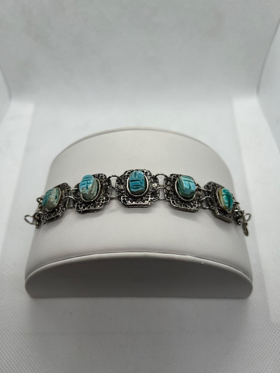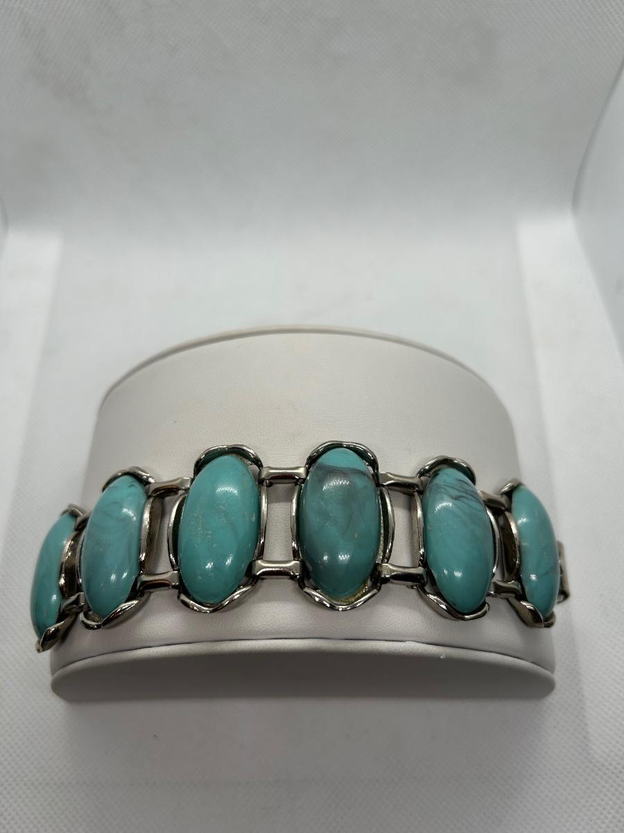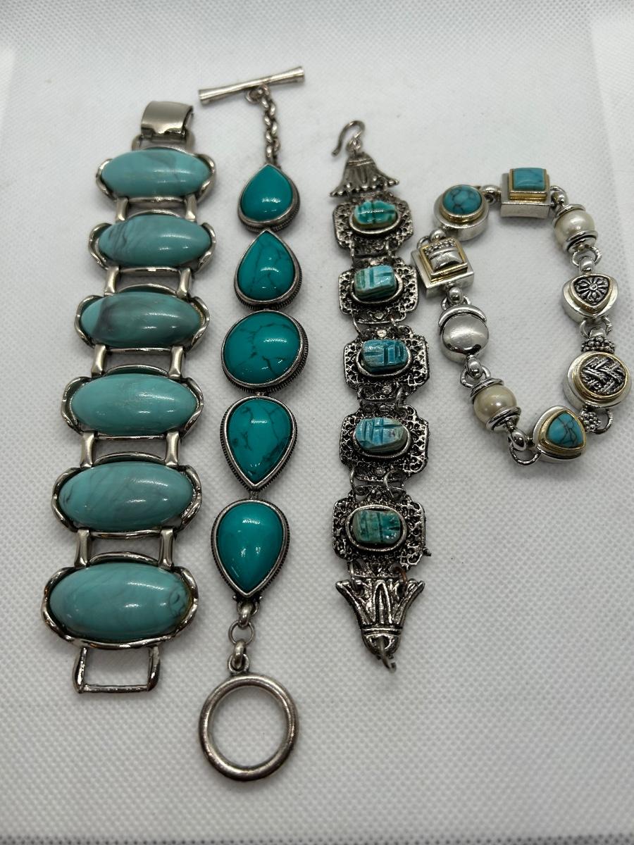 One of these looks to be natural turquoise stone (the 5 stone with cut designs), the others look to be costume. Please see all pictures as they are the best representation of the items. The pictures show condition, measurements if taken, and what is included in the lot. Due to the large amount that we photograph and the time frame, we are not always able to take measurements. All items unless noted, are pre-owned and have been used. If you purchased furniture, you must bring help. We do not allow one person to carry large furniture out on their own. Bring help, tools and a truck for the safety of our client’s homes, and your personal safety. Any damages that result to the property including walls, and floors due to moving of the furniture will be charged to the buyer. Company policy. Thank you.