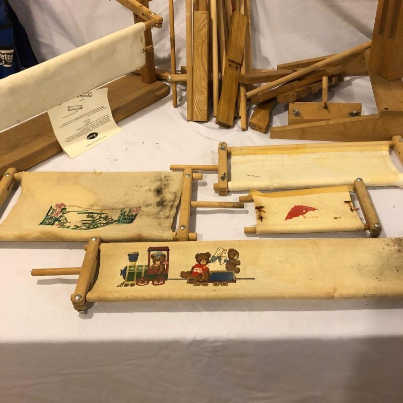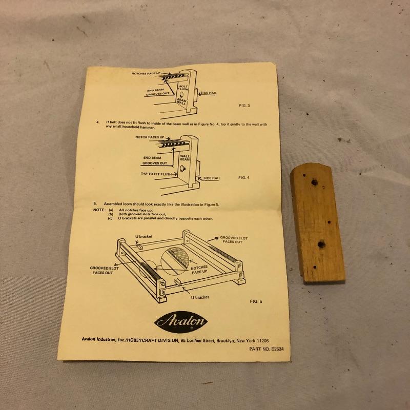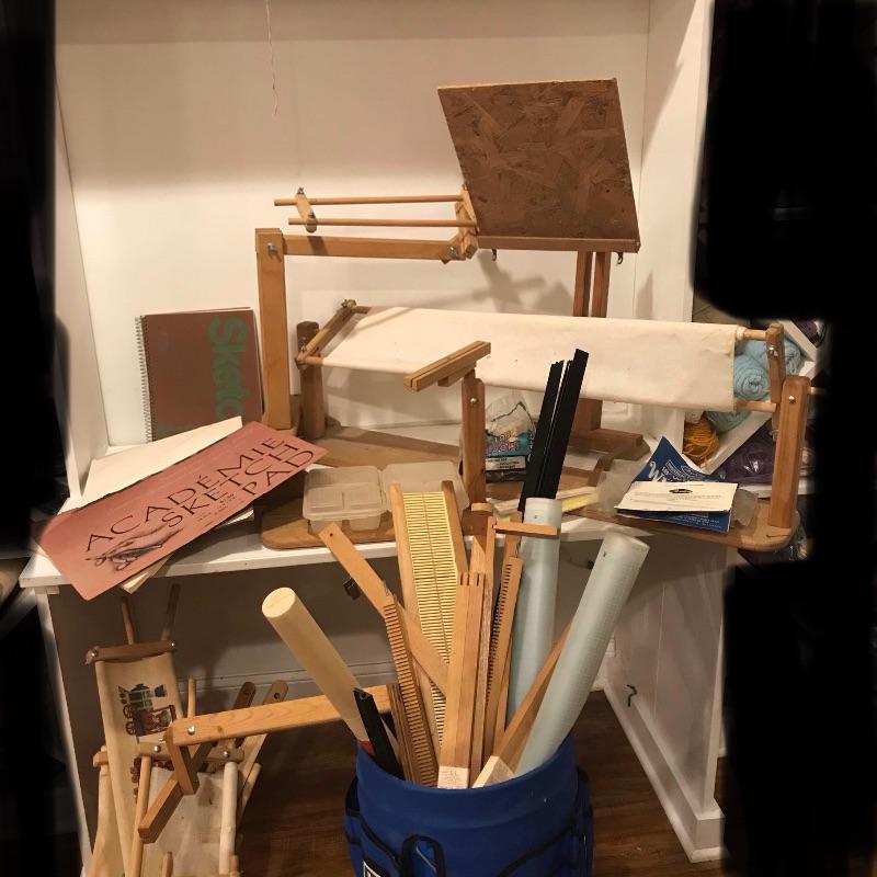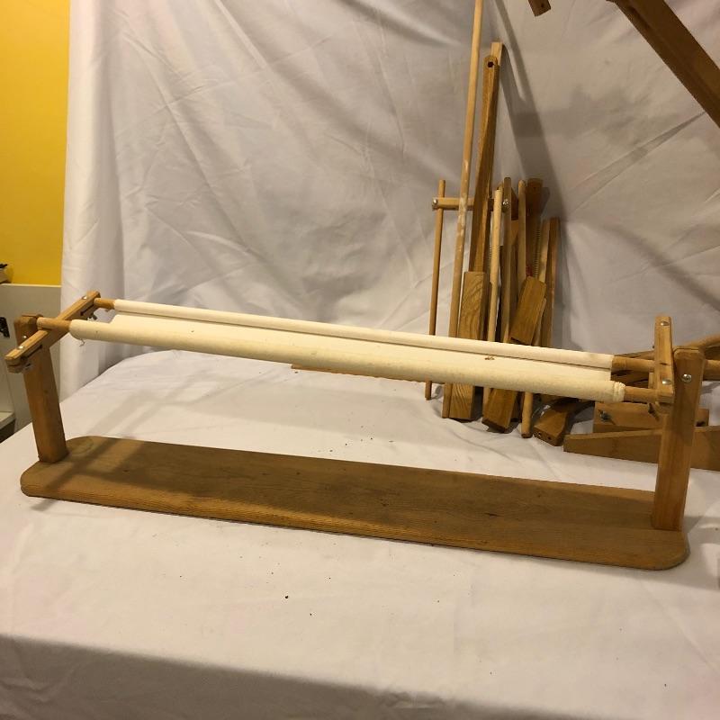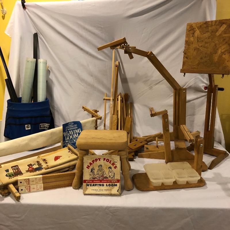 This large lot includes an Avalon loom plus extra loom parts and accessories. There are lots of images to look through to see what exactly is all here. The Avalon loom appears to be just missing one small piece that is the piece photographed next to the manual. As you will see from the images any fabric related items do show signs of mold, but all less porous items such as wood are fine. Lots more loom parts and embroidery stretchers, see images. Also included is an adjustable easel and measuring tools and a 5 gallon bucket with a tool storage attachment.