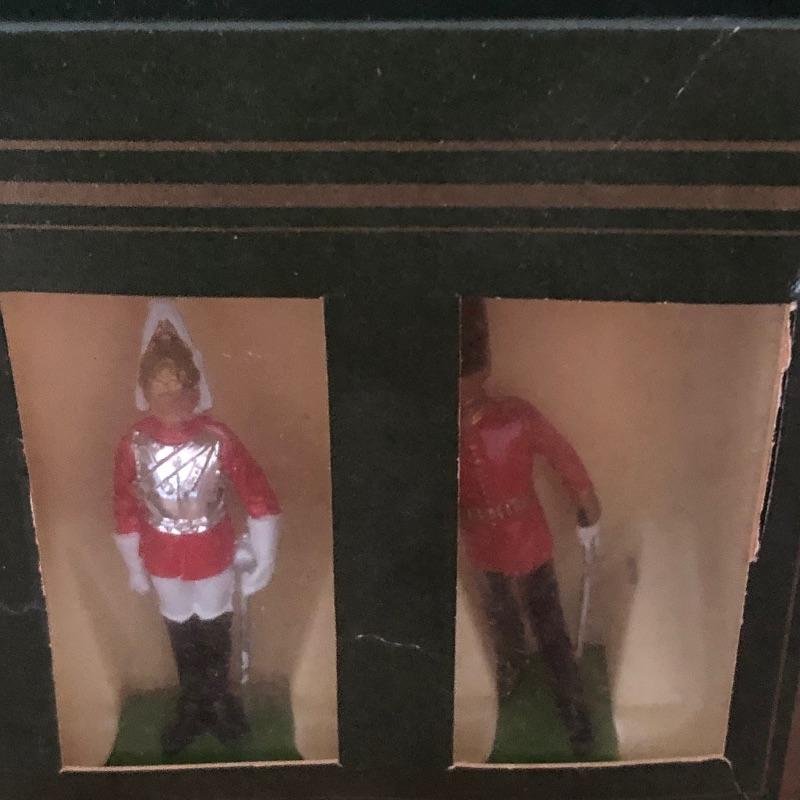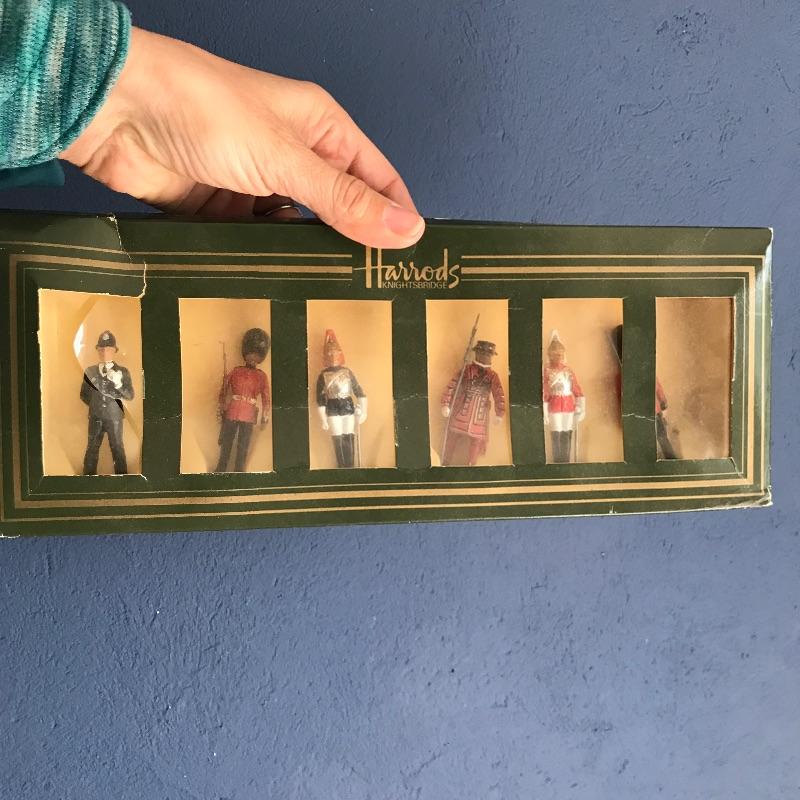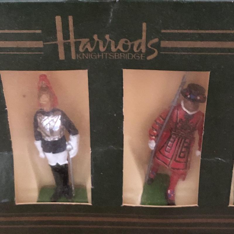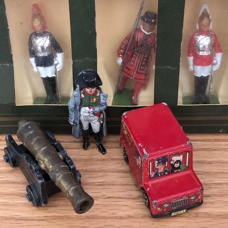 Neat array of British collectible items. Includes a box from Harrods Store of six British figurines(measuring appx 2.5” each), a canon, a metal red Mail truck and a soldier. See photos for markings. Original box is not in great shape. Shipping available