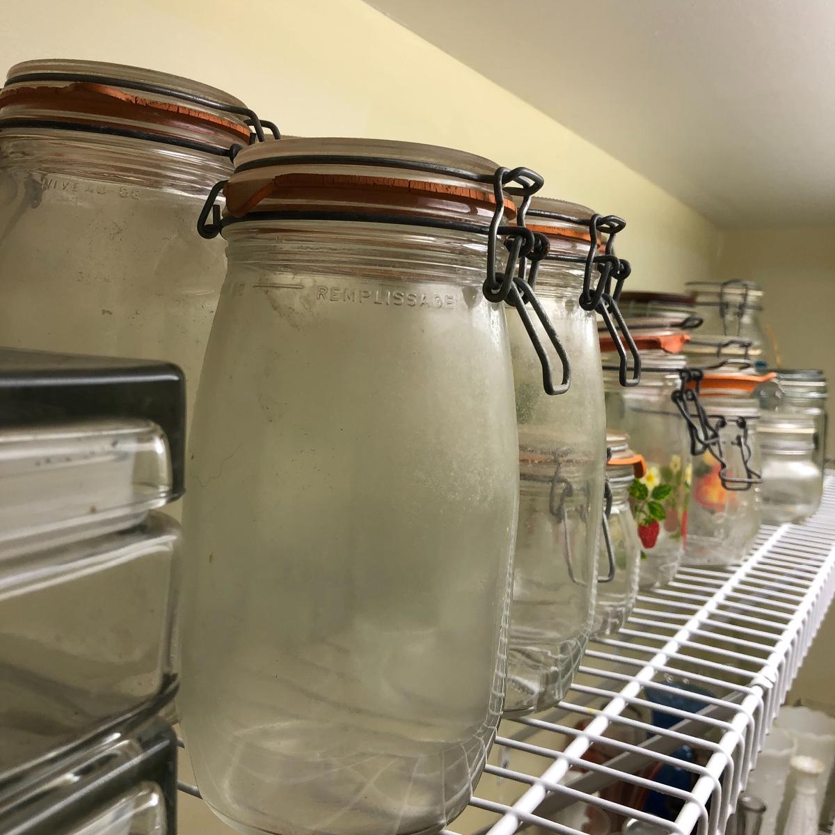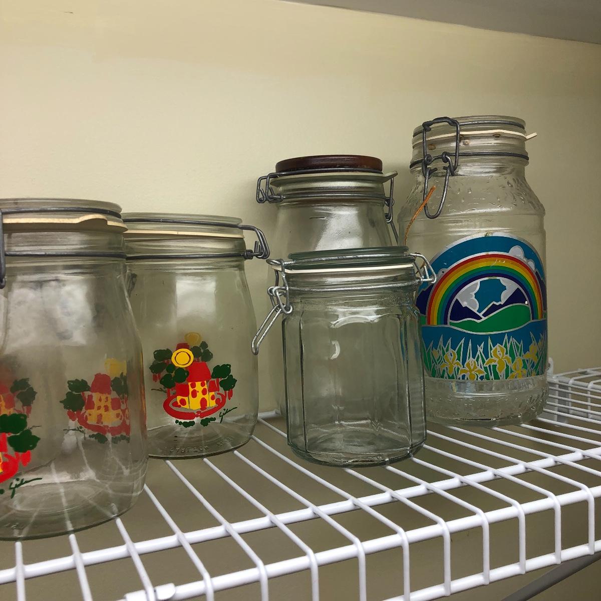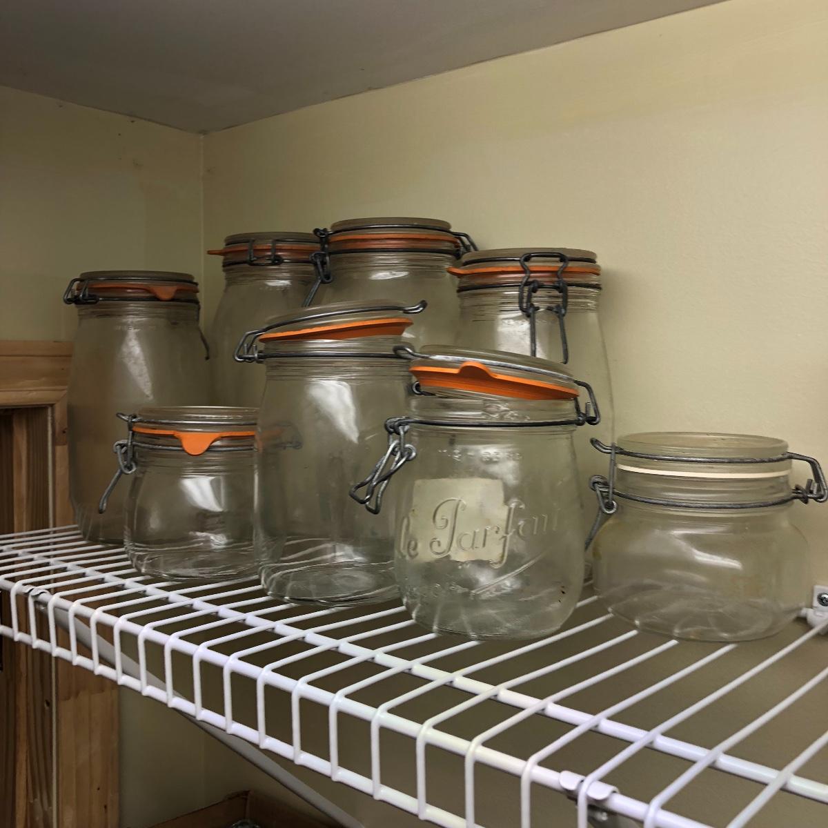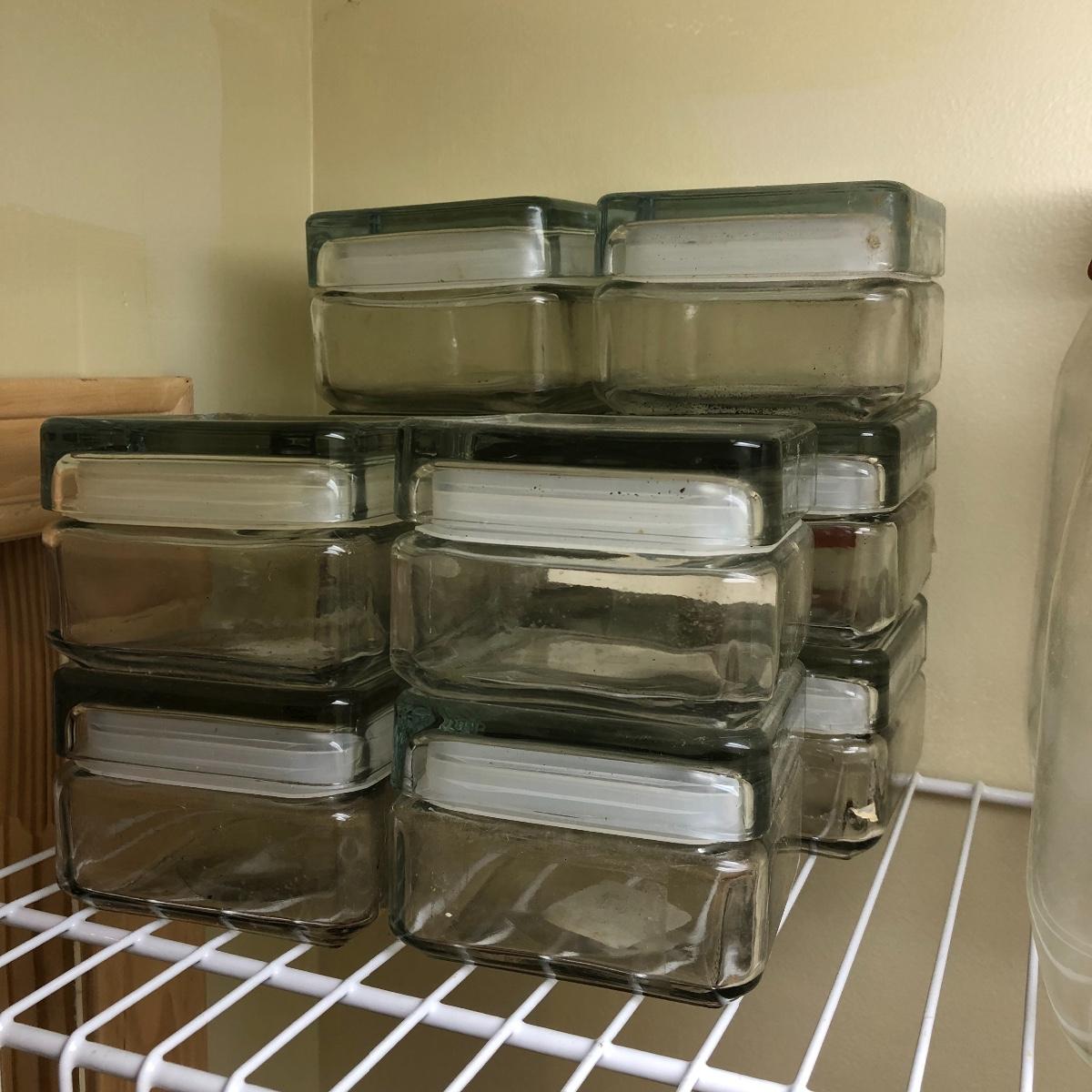 Containerize with this lot! It includes ten square stackables and sixteen close top glass canisters. There are four large canisters that are 10” tall and the remaining are a variety of sizes. Local pick up only.