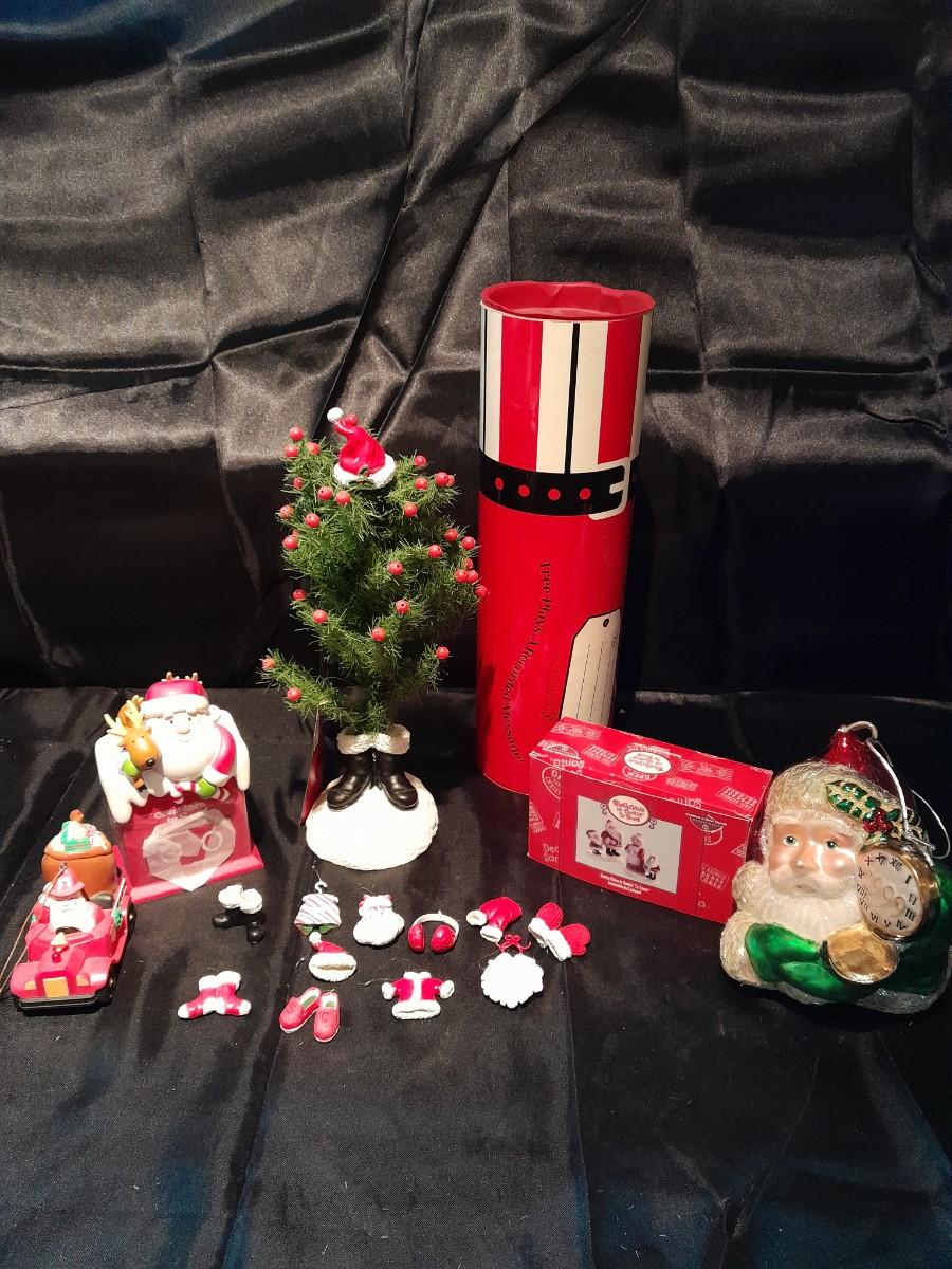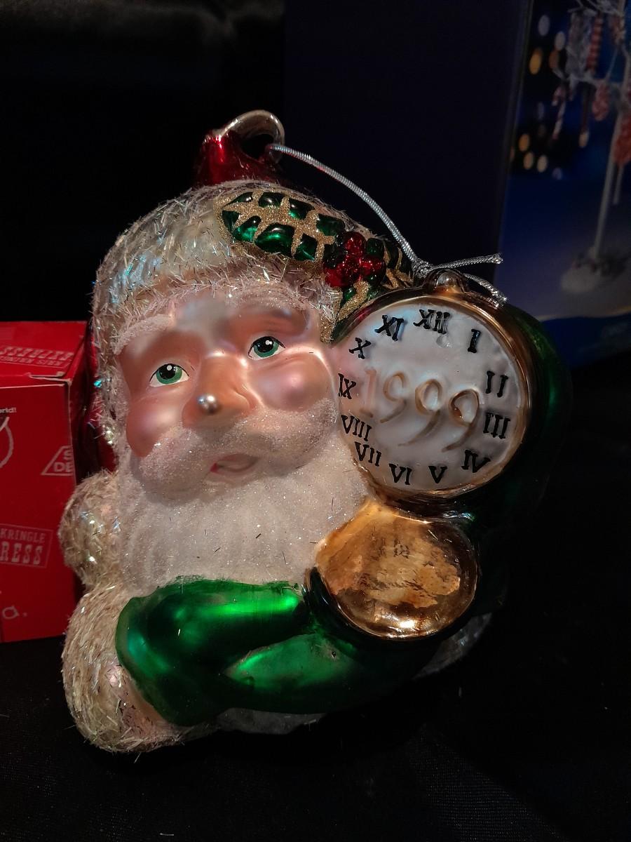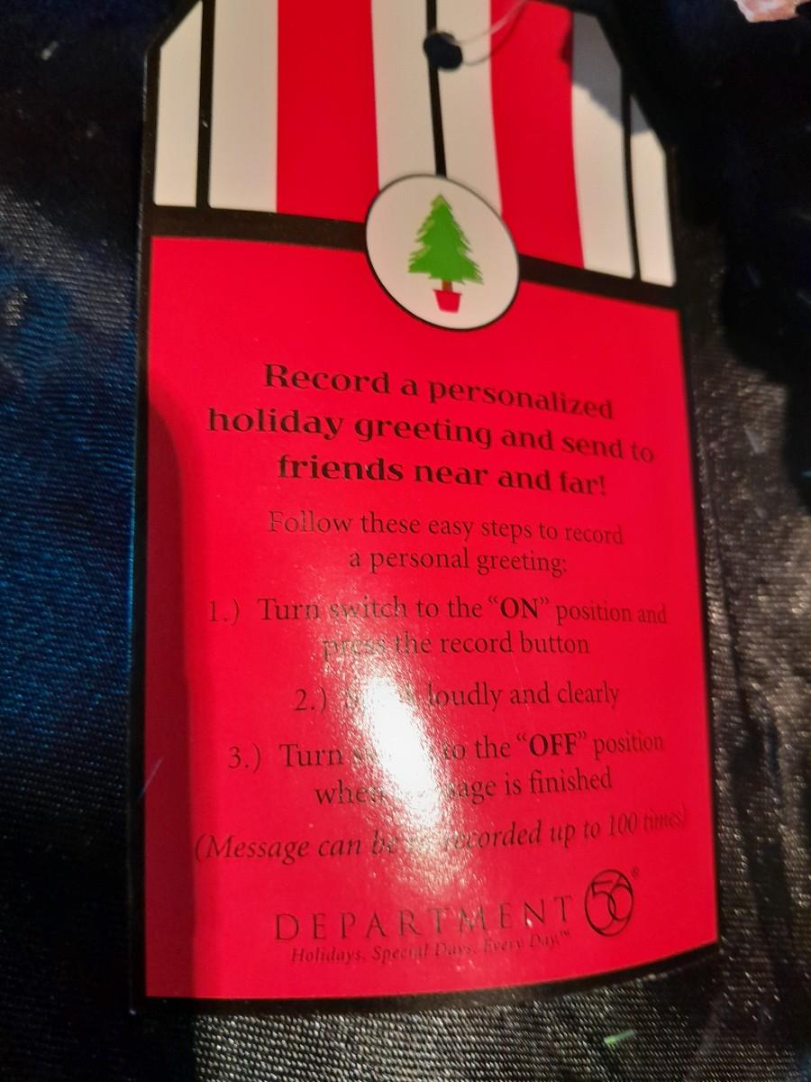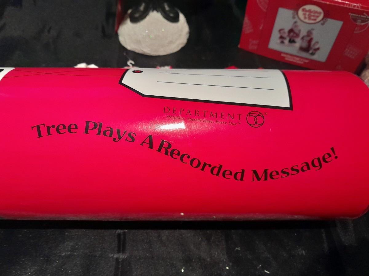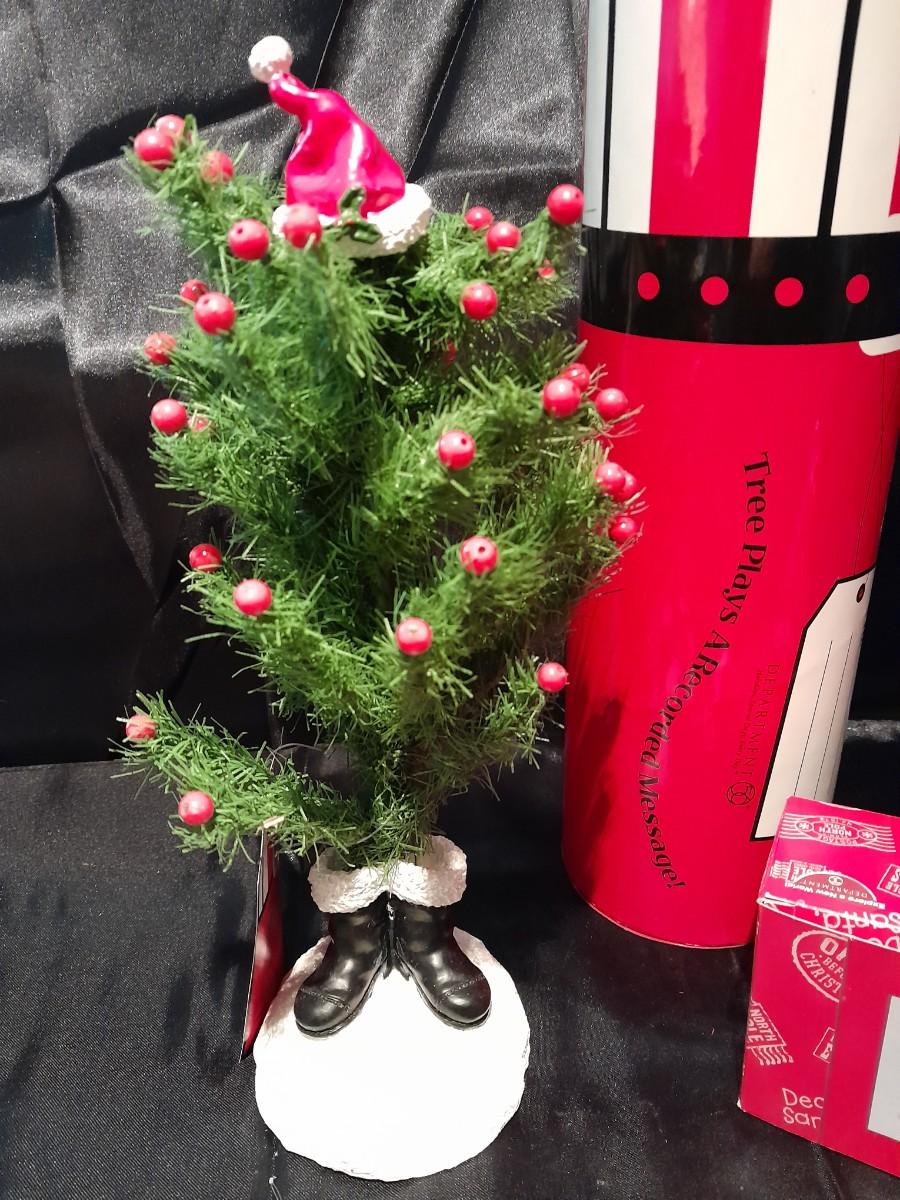 DEPTARTMENT 56 TREE PLAYS A RECORDED MESSAGE, COMES WITH SANTA'S CLOTHING ITEMS AS TREE DECOR, A LARGE GLASS SANTA HEAD, AND MORE