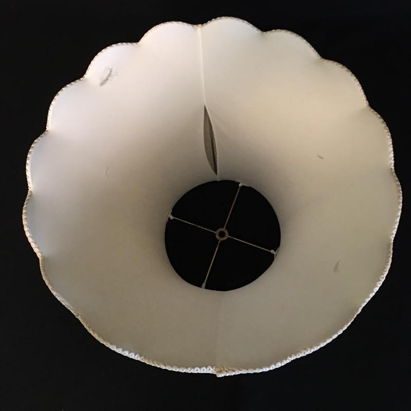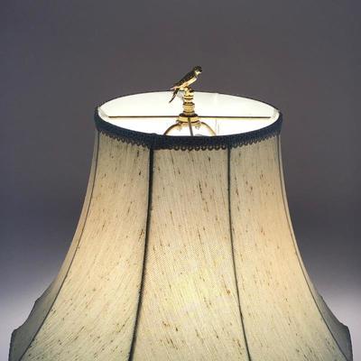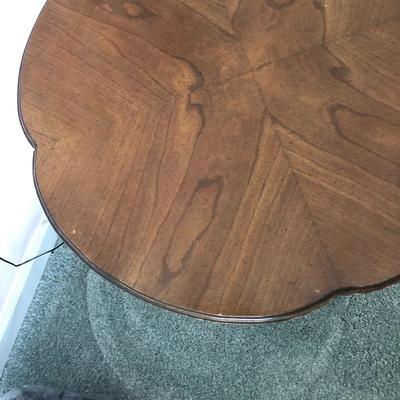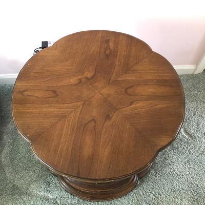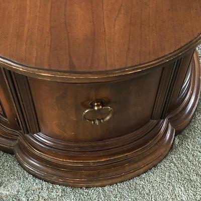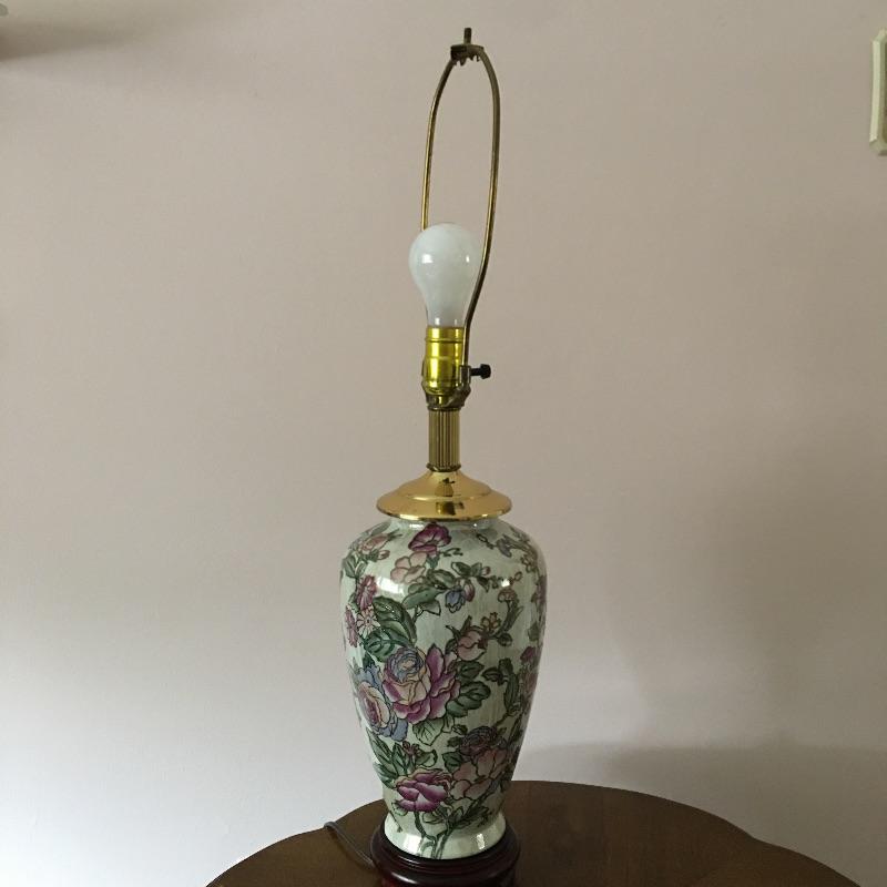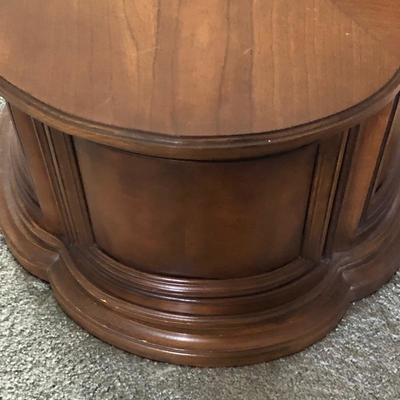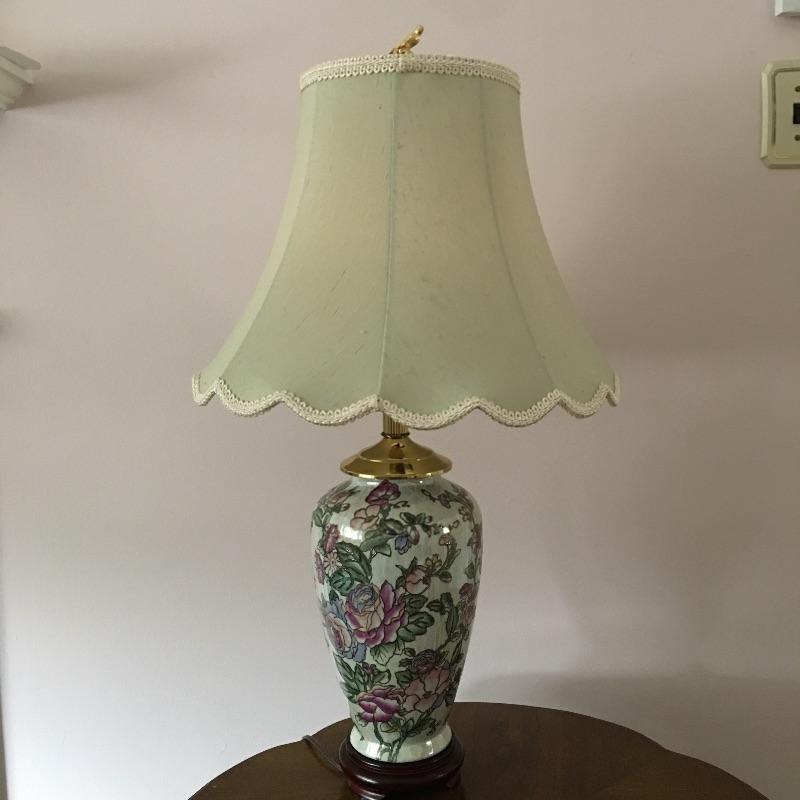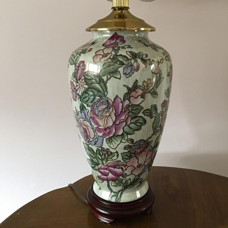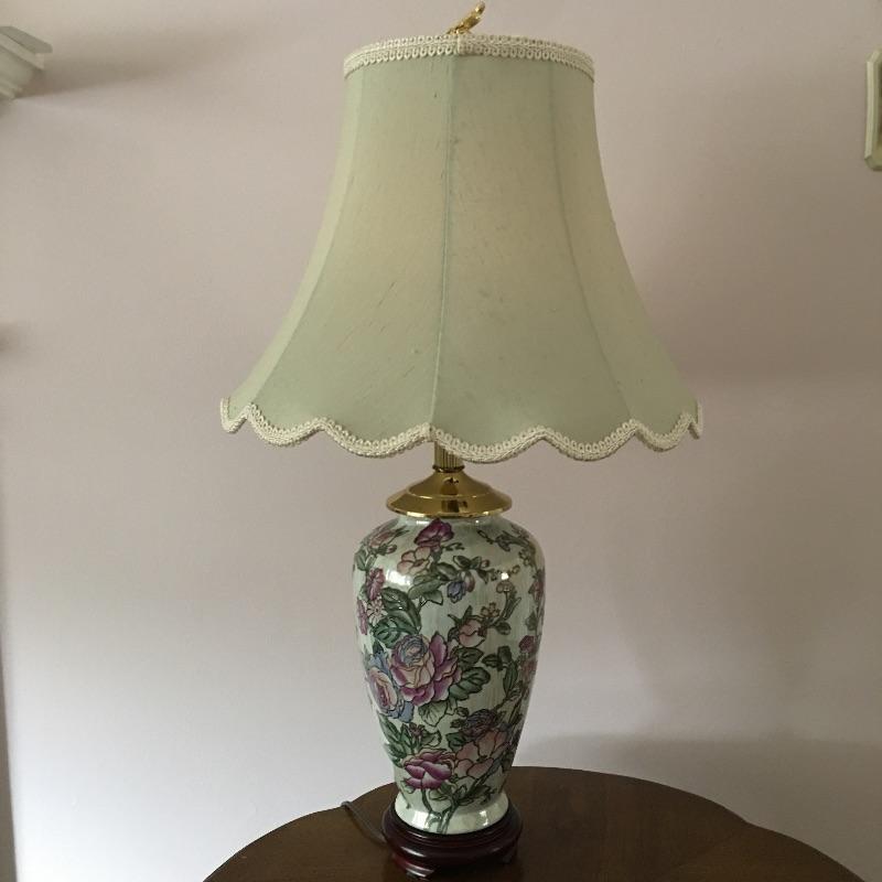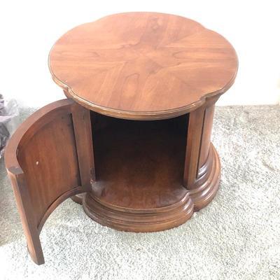 This decorative round shaped end table with door that opens revealing storage space inside has some minor blemishes throughout see photos. Lamp with wooden base and ceramic floral design makes a nice accent piece. Lamp shade has a few flaws inside, see pictures. Table measures 24” x 24” x 21”.