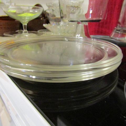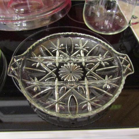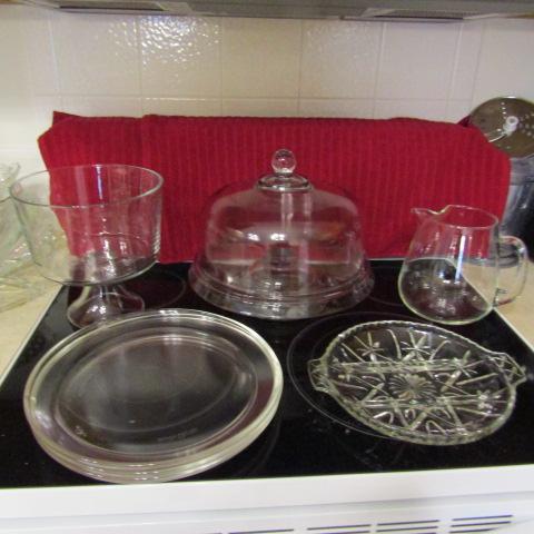 3 GLASS PLATTERS, 1 DIVIDED PLATTER, PITCHER, CAKE PLATE WITH LID AND FRUIT BOWL ON PEDESTAL
