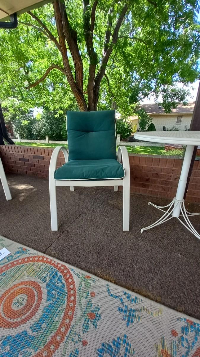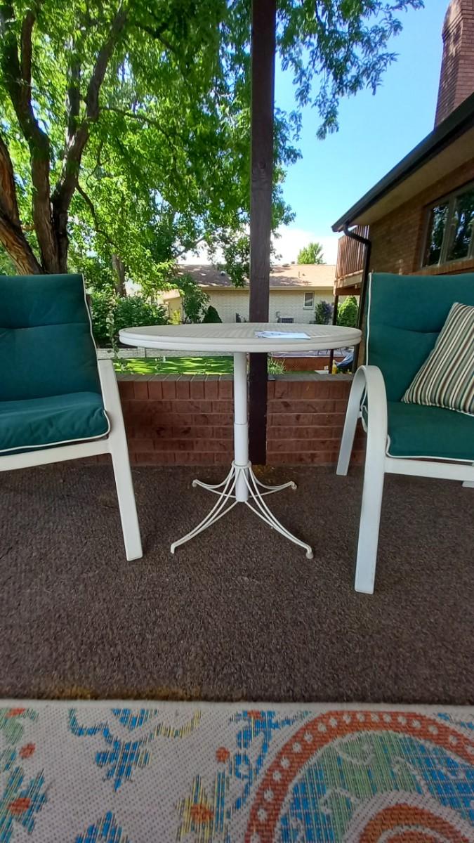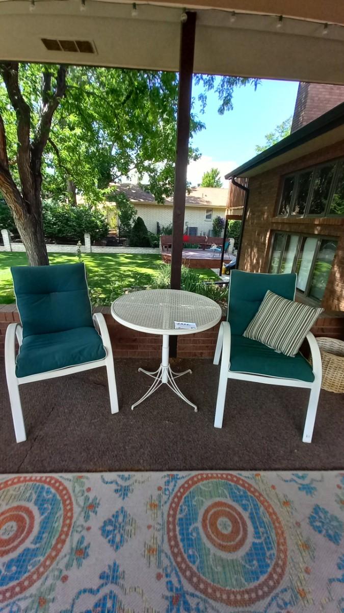METAL TABLE 30" ROUND AND TWO PATIO CHAIRSWITH CUSHIONS
