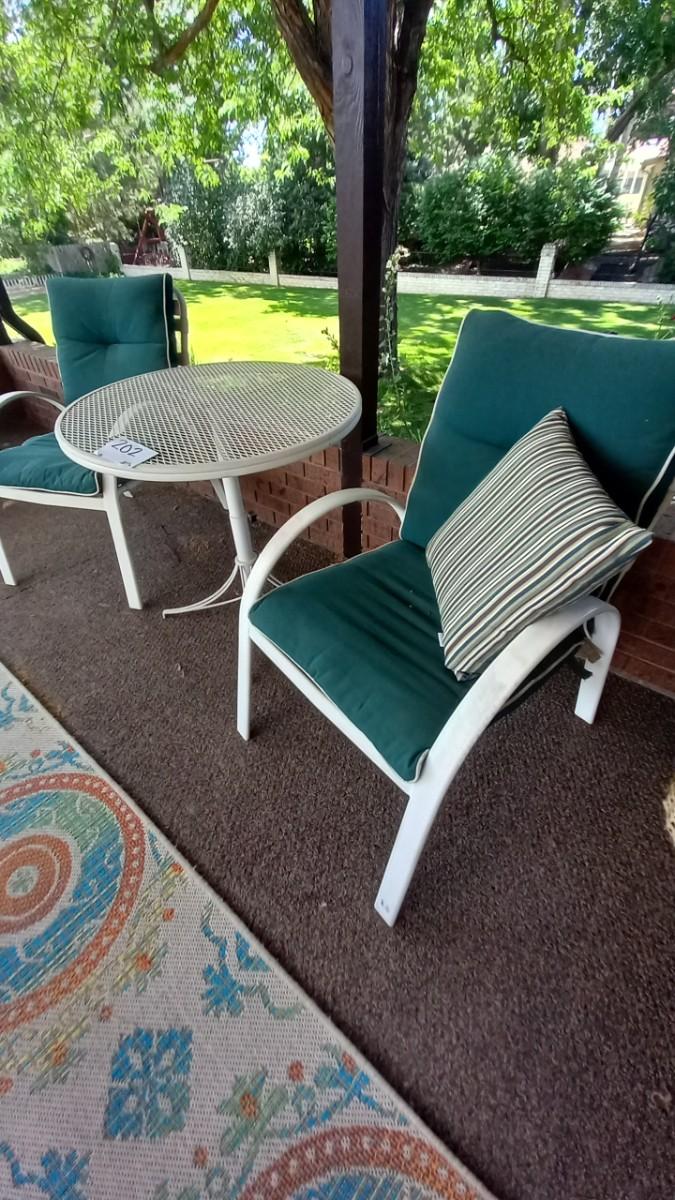 LOT 202  METAL TABLE AND TWO PATIO CHAIRS WITH CUSHIONS