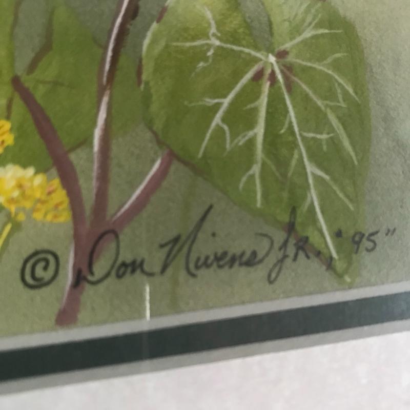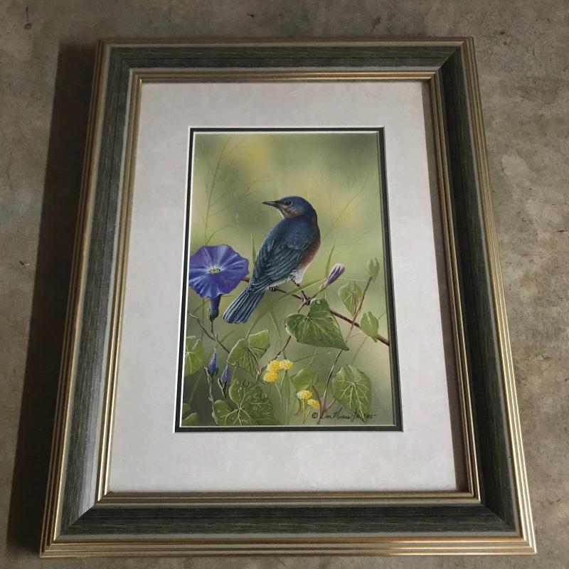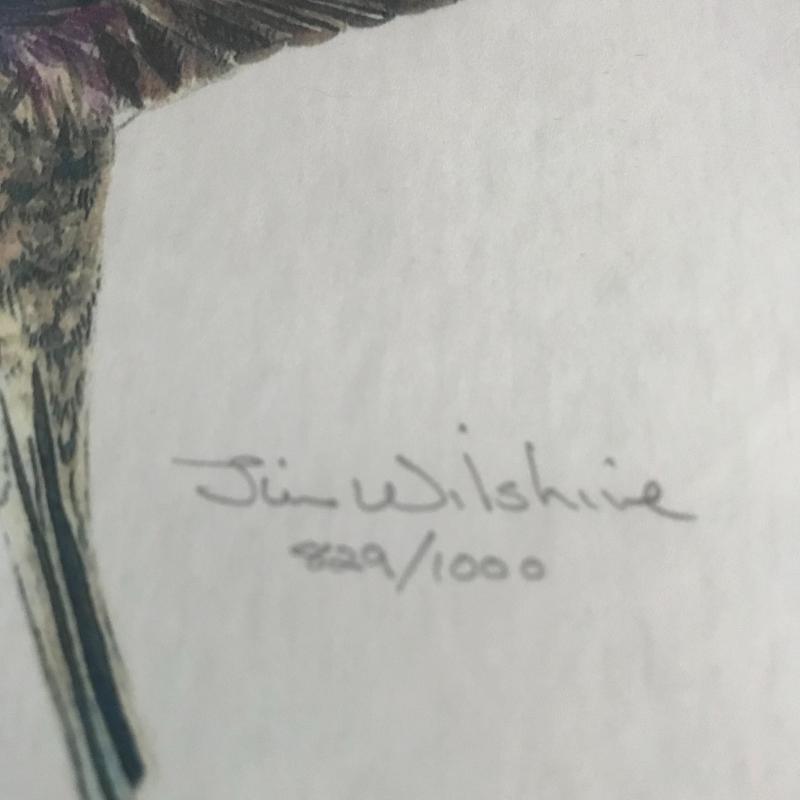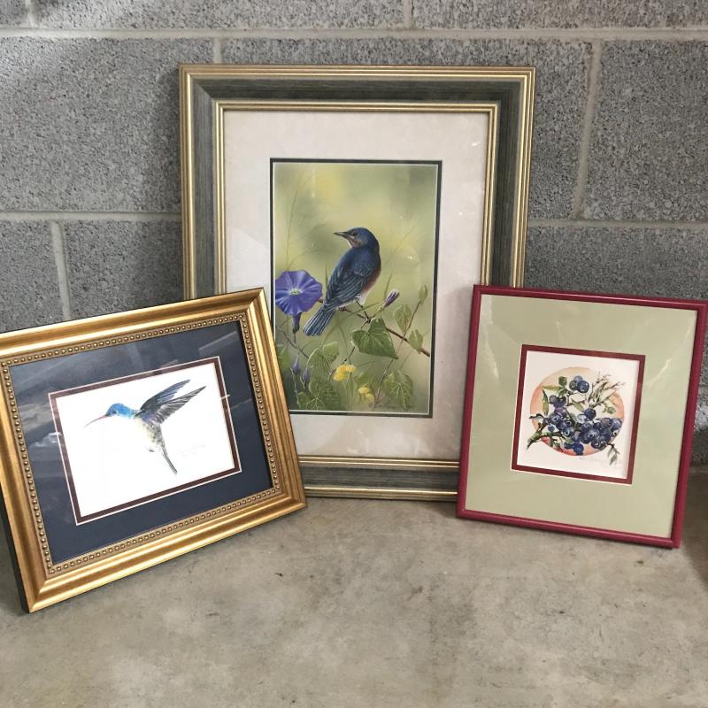 Three pieces of art nicely matted and framed. The Don Nivens Jr. piece is the largest wooden frame at approx 15” x 19”. The “Violet-Crowned Hummingbird” by Jim Wilshire is numbered and also has a wood frame. The final piece is numbered, matted, wrapped in plastic and in a metal frame without glass. Shipping available, please call UPS for a quote prior to bidding as art can be costly to ship.