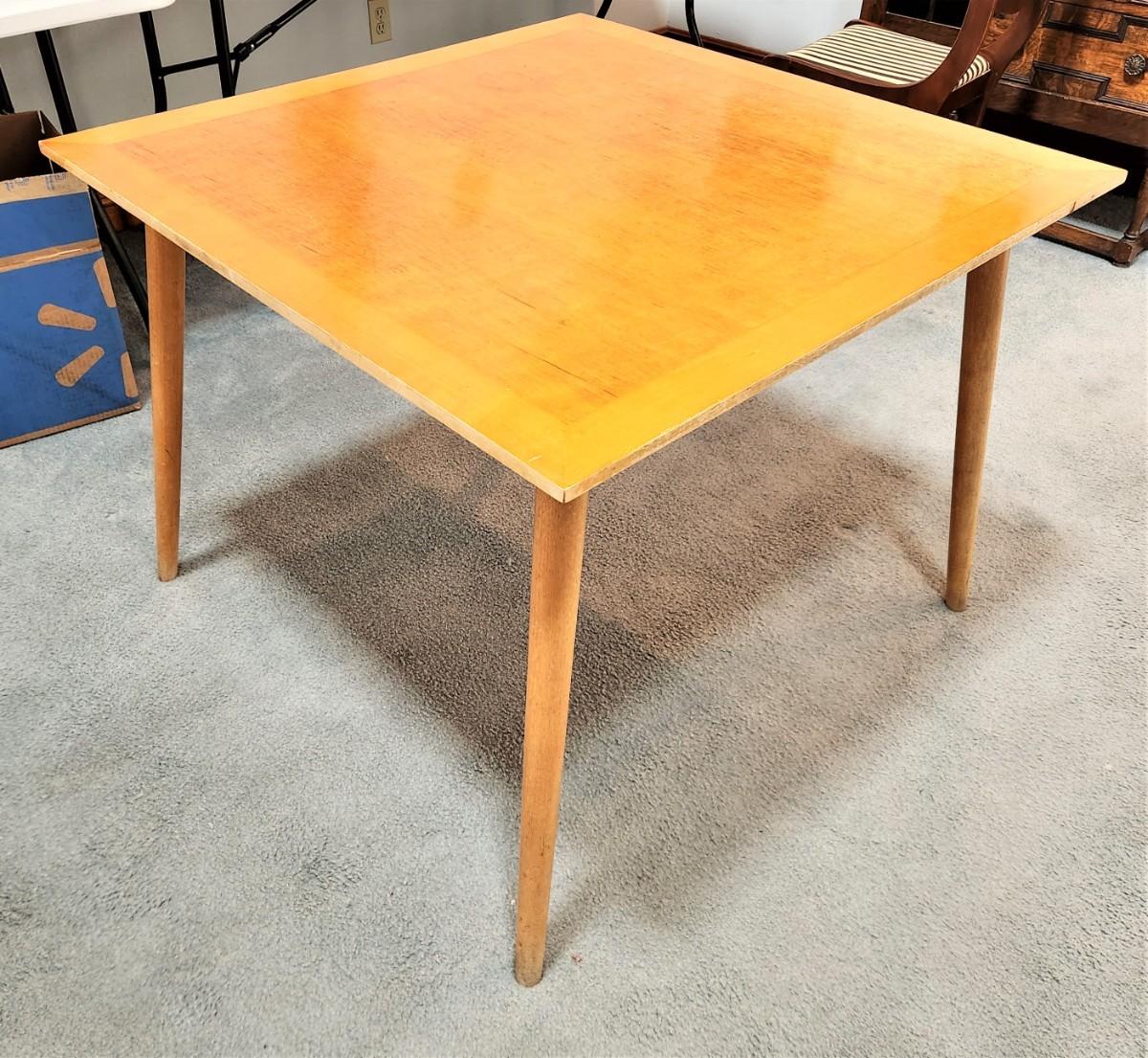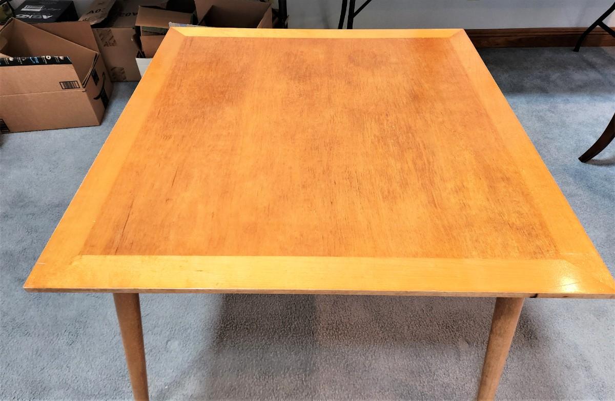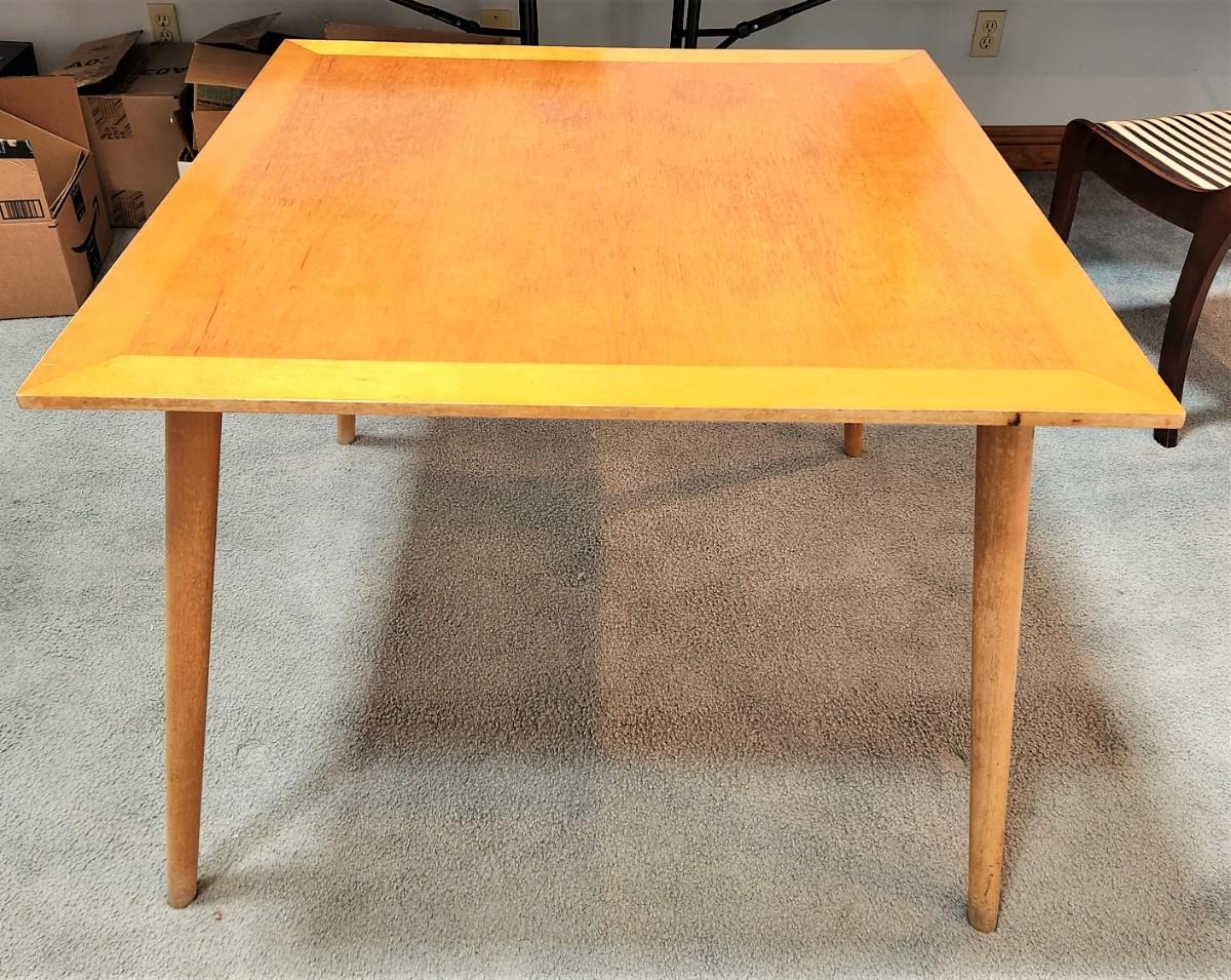 No maker noted. Very clean lines, good condition, no chairs. 27.5" tall, 3' x 3'. Blond MidCentury Modern table - good condition, sturdy.