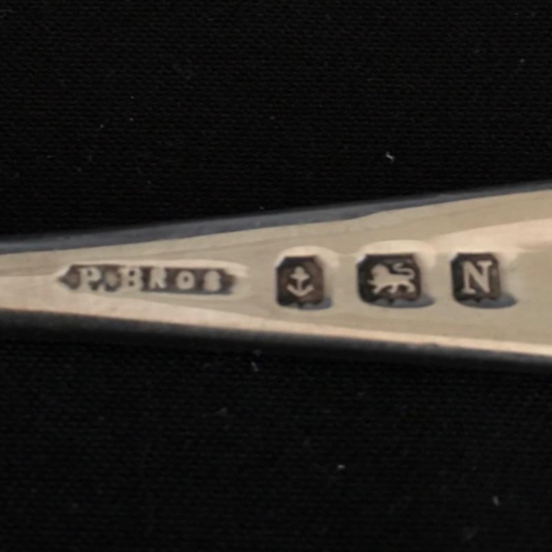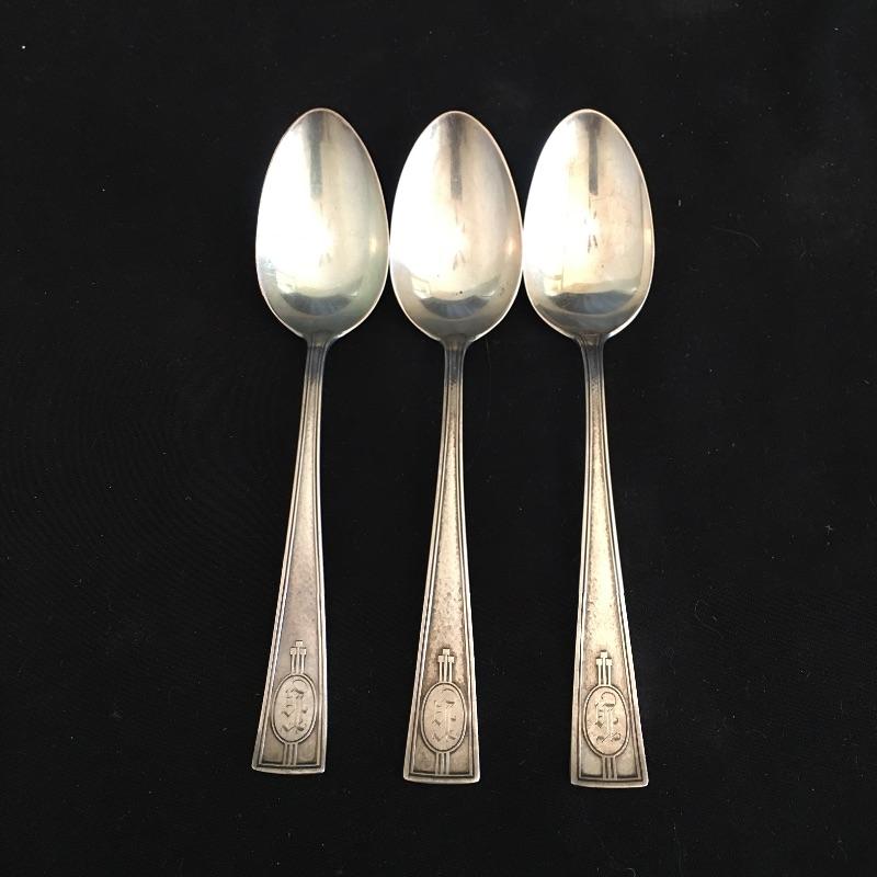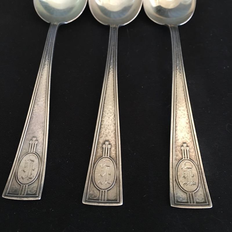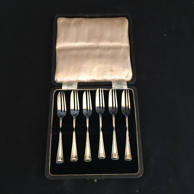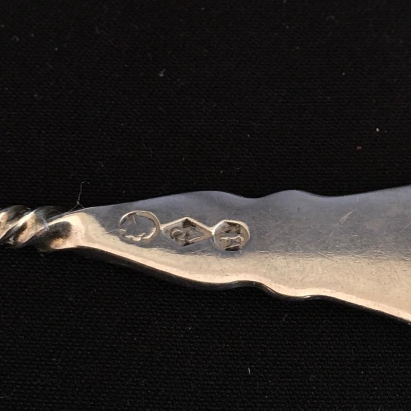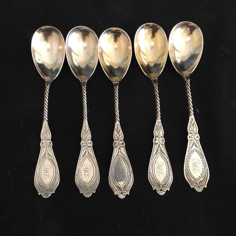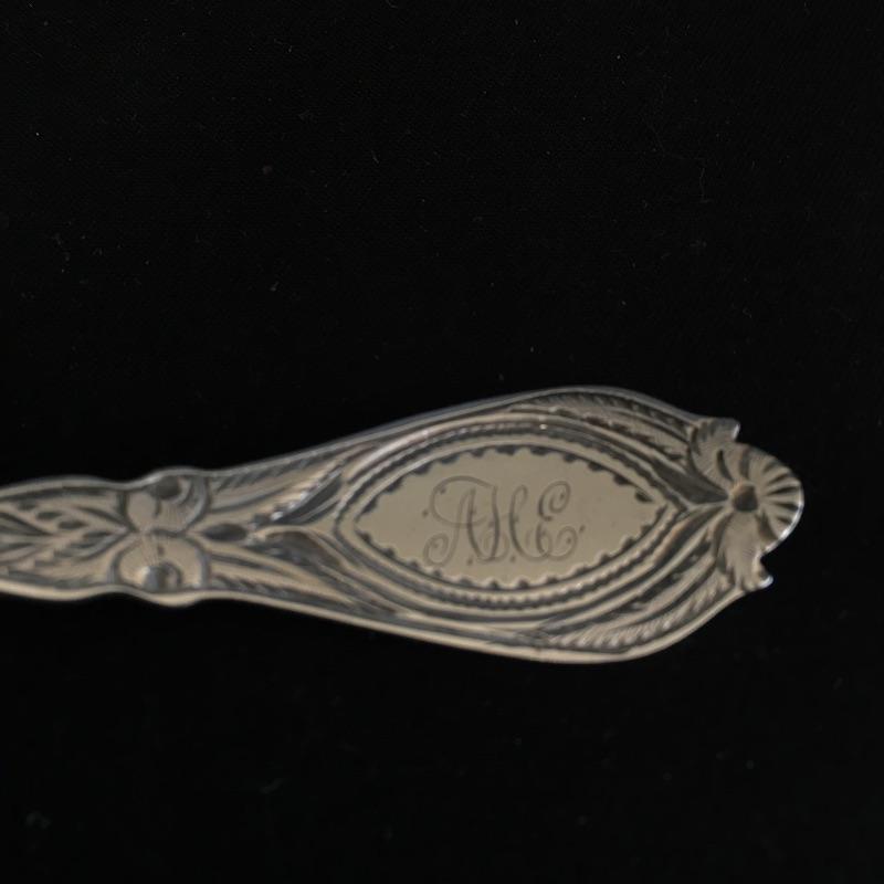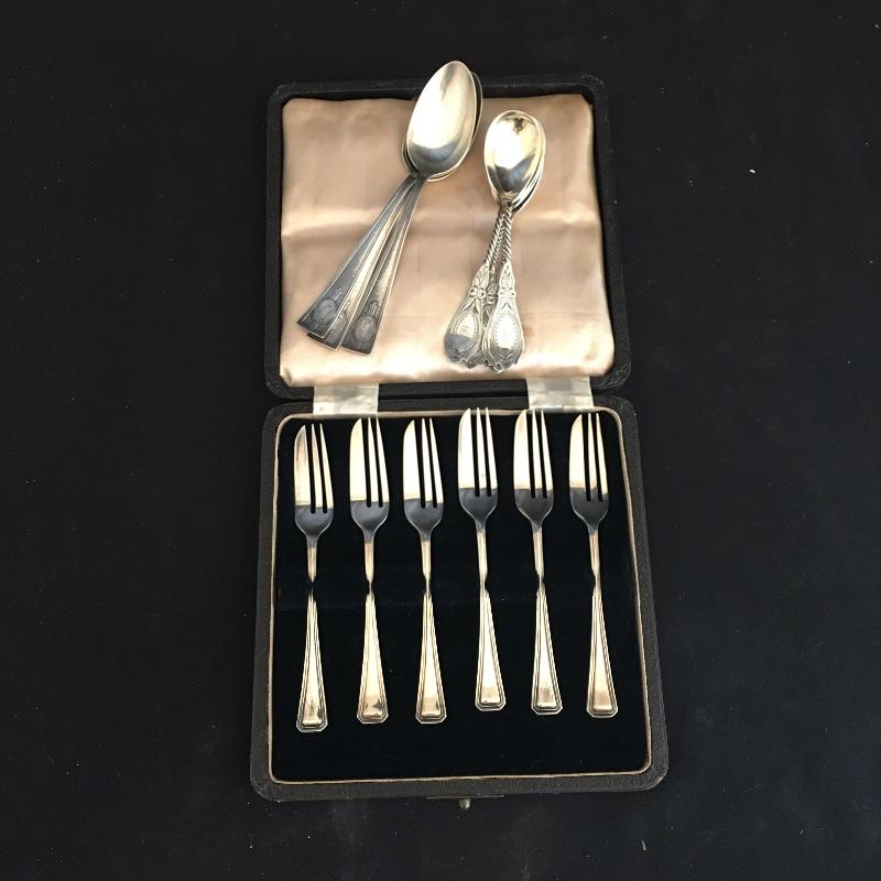 This lot includes a six piece fork set in a velvet lined case( has a broken clasp). It also includes five spoons with a cute twisted handle and engraved with the monogram "AHE" on the bottom. The larger three spoons are also monogramed and marked sterling(measure 5.5” long). See photos for all hallmarks. Owner indicates that all pieces are sterling.