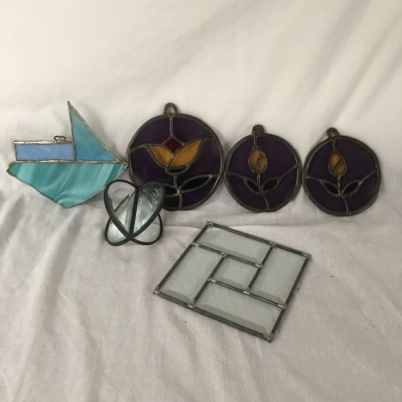 Four pieces of stained glass and two are beveled glass. Adorn your windows with this lovely stained glass collection. Square piece measures 6.25” x 6.25”.