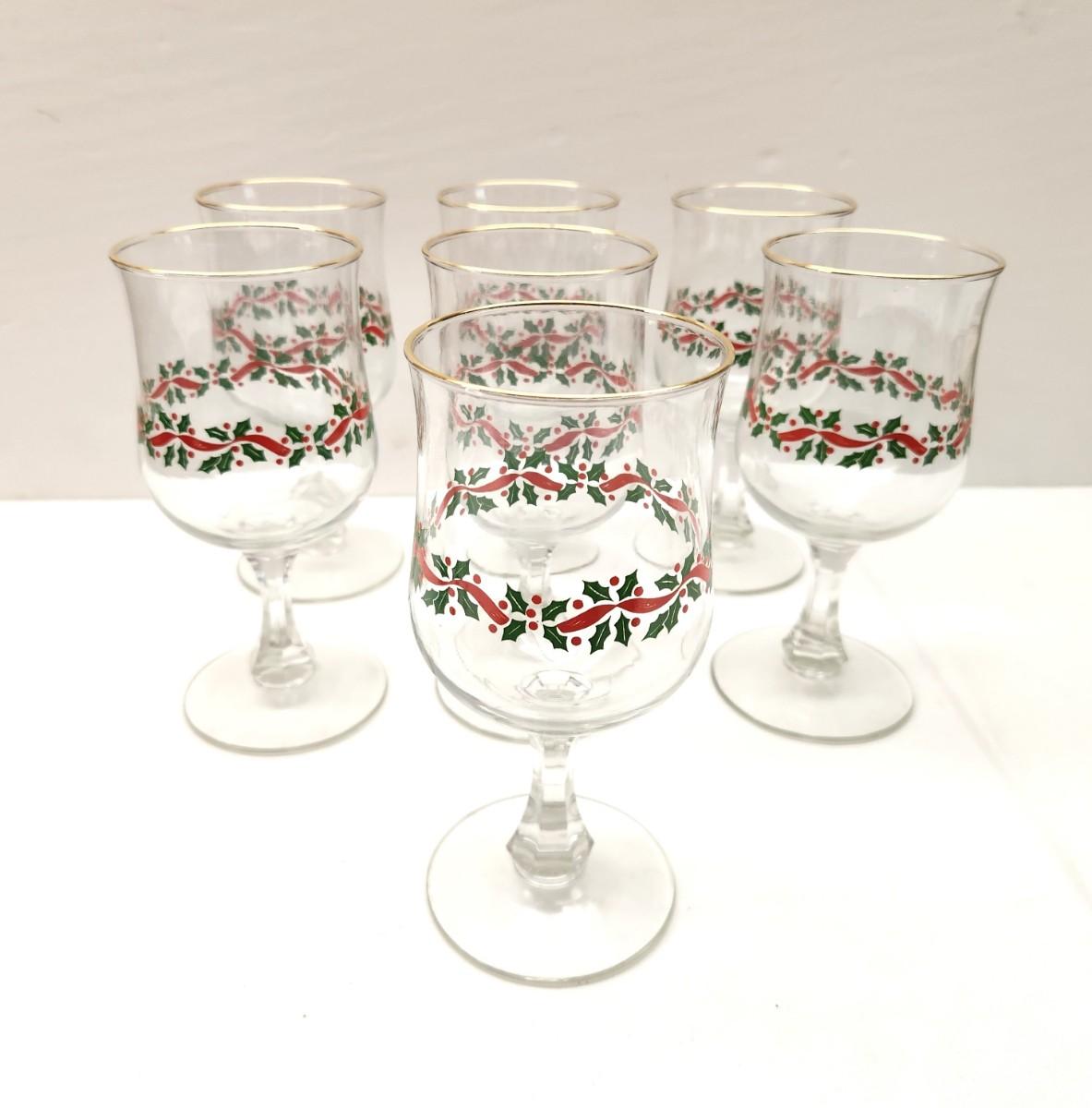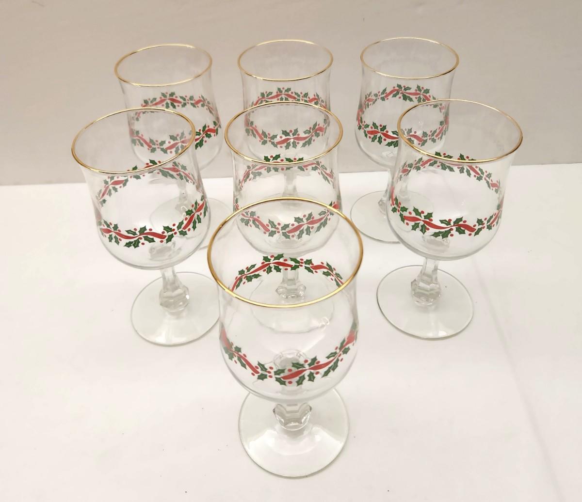 Vintage Libbey Holly/Berry footed glasses, gold rim, lot of 7 pieces, 7" tall.