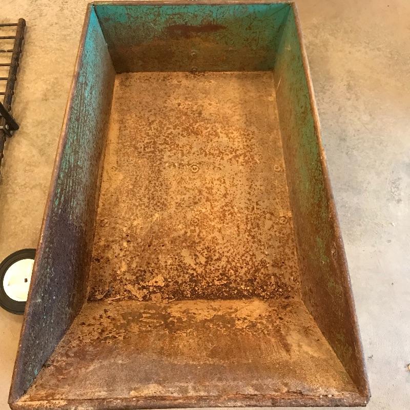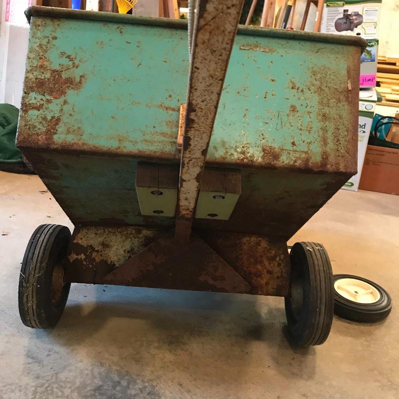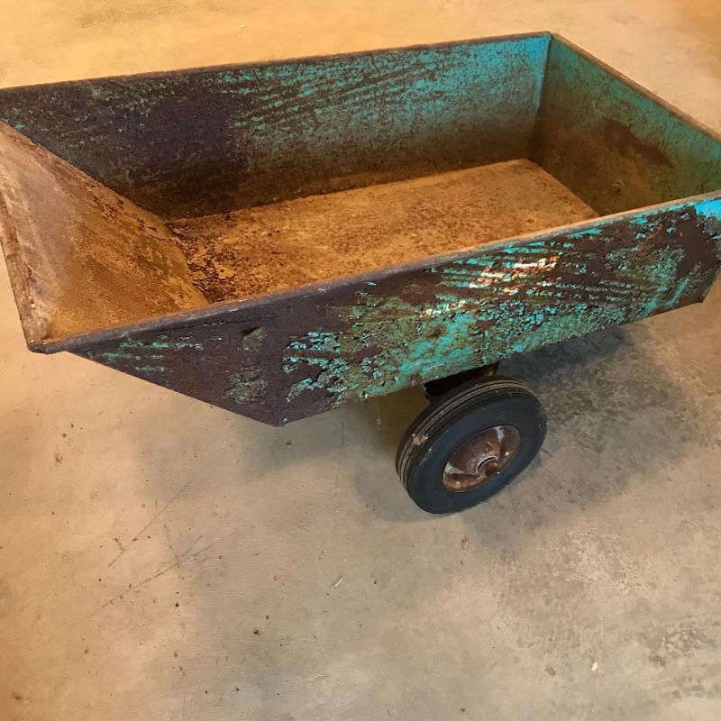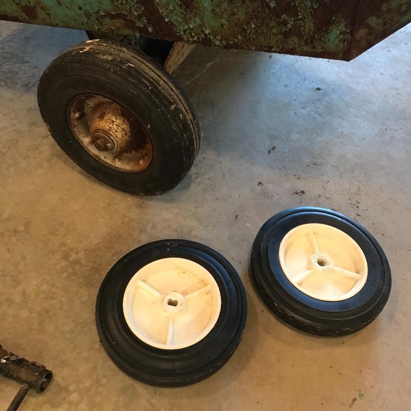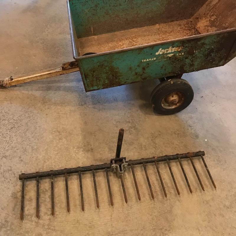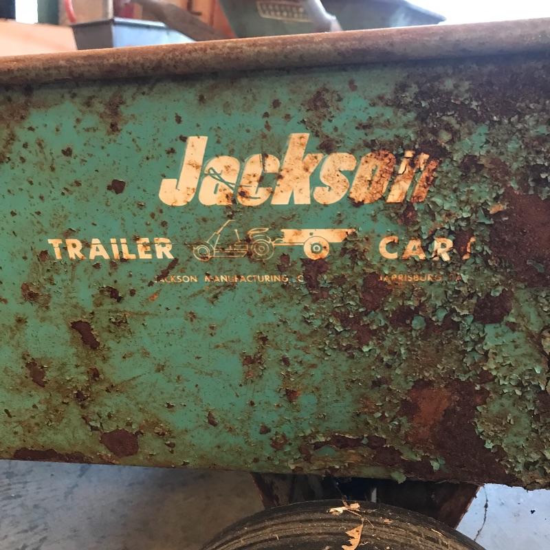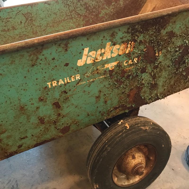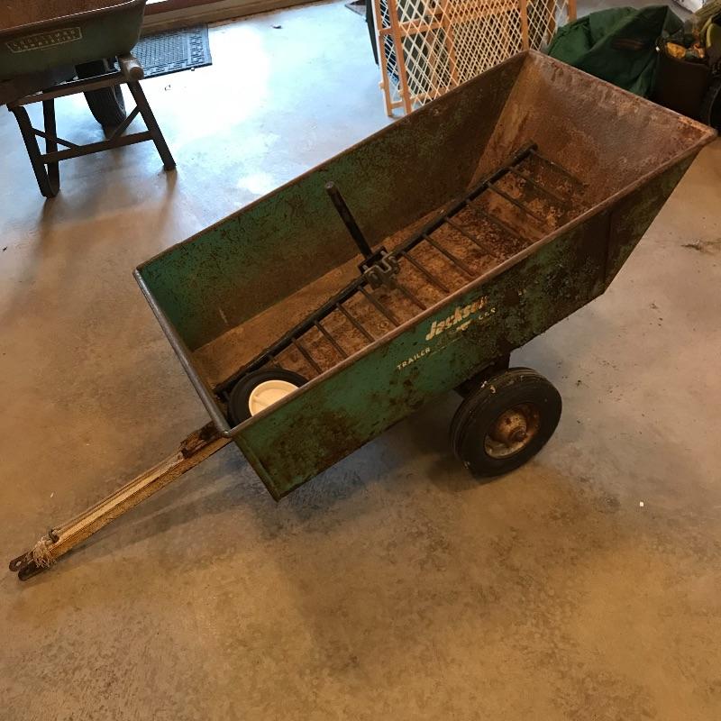 Heavy green metal Jackson Trailer Cart shows age, personality and appears to still be sturdy and strong enough to handle the job! It’s two hard wheels roll smoothly. Severe rusting throughout, but holes in metal were not found. A plowing attachment and some extra hard wheels included. See photos, no shipping.