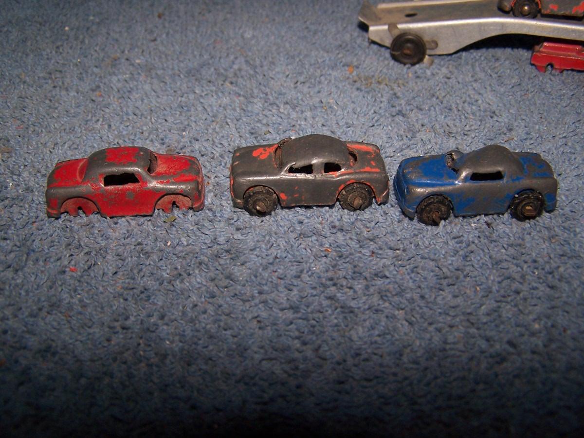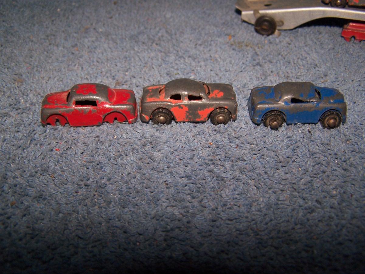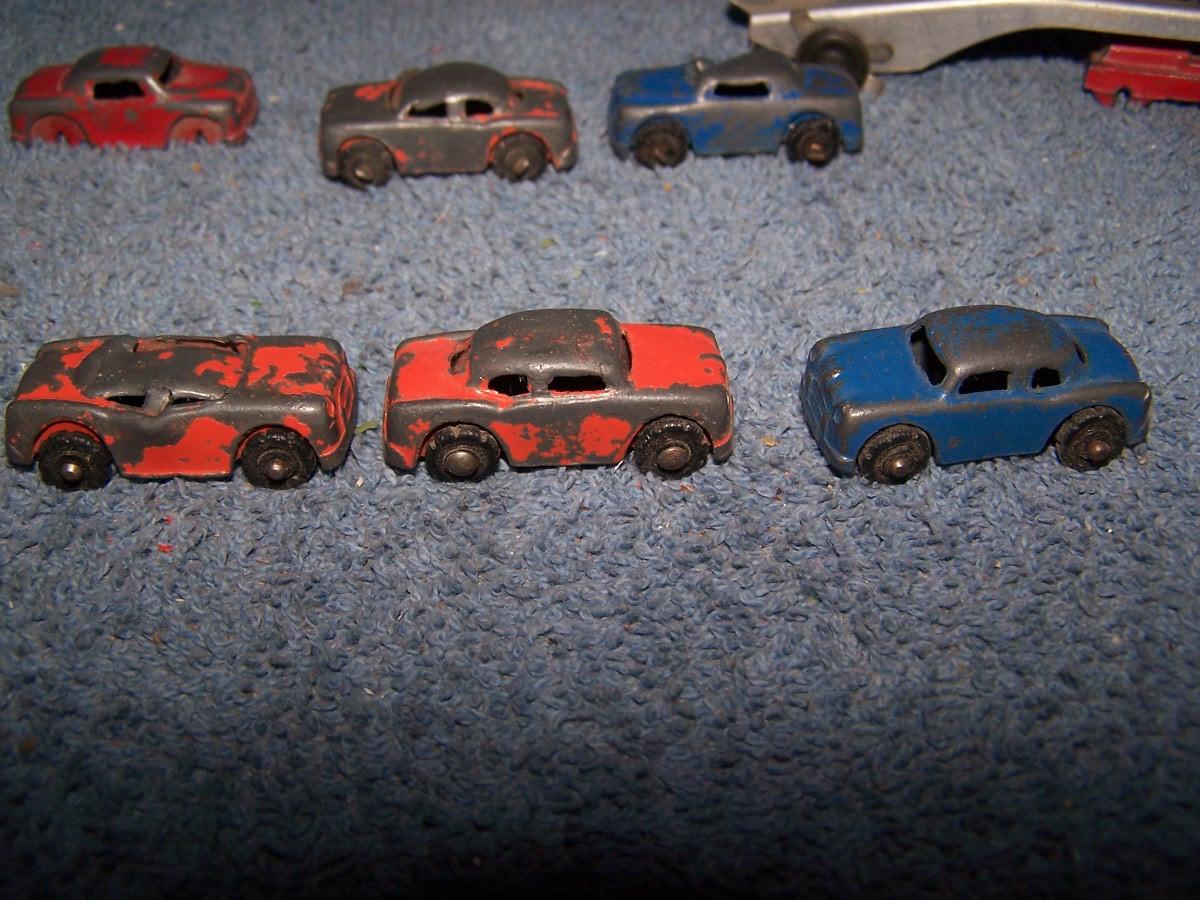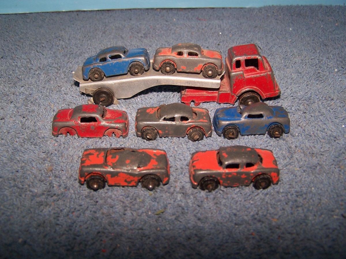 THESE ARE GREAT VINTAGE MINI METAL VEHICLES, UNMARKED, PROBABLY, BARCLAYS.. CARS ARE 1 1/2'' LONG.. 1 CAR IS MASHED.. TRUCK IS MISSING 2 WHEELS.. ALL TOYS HAVE BEEN PLAYED WITH..
