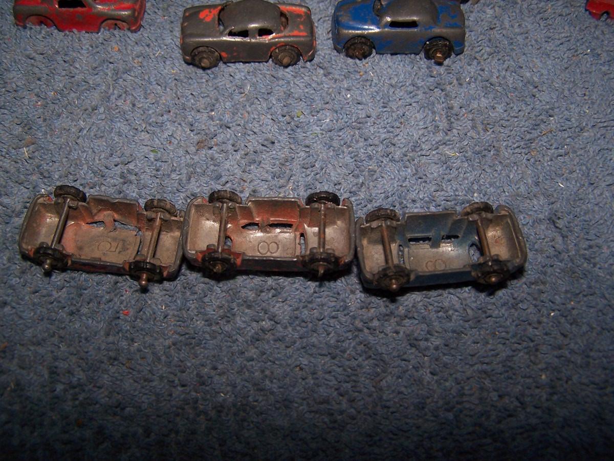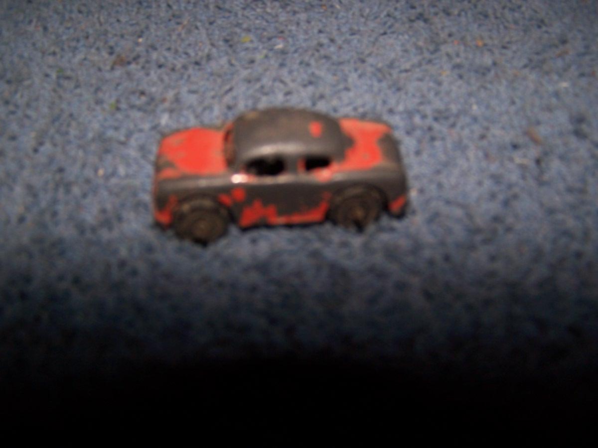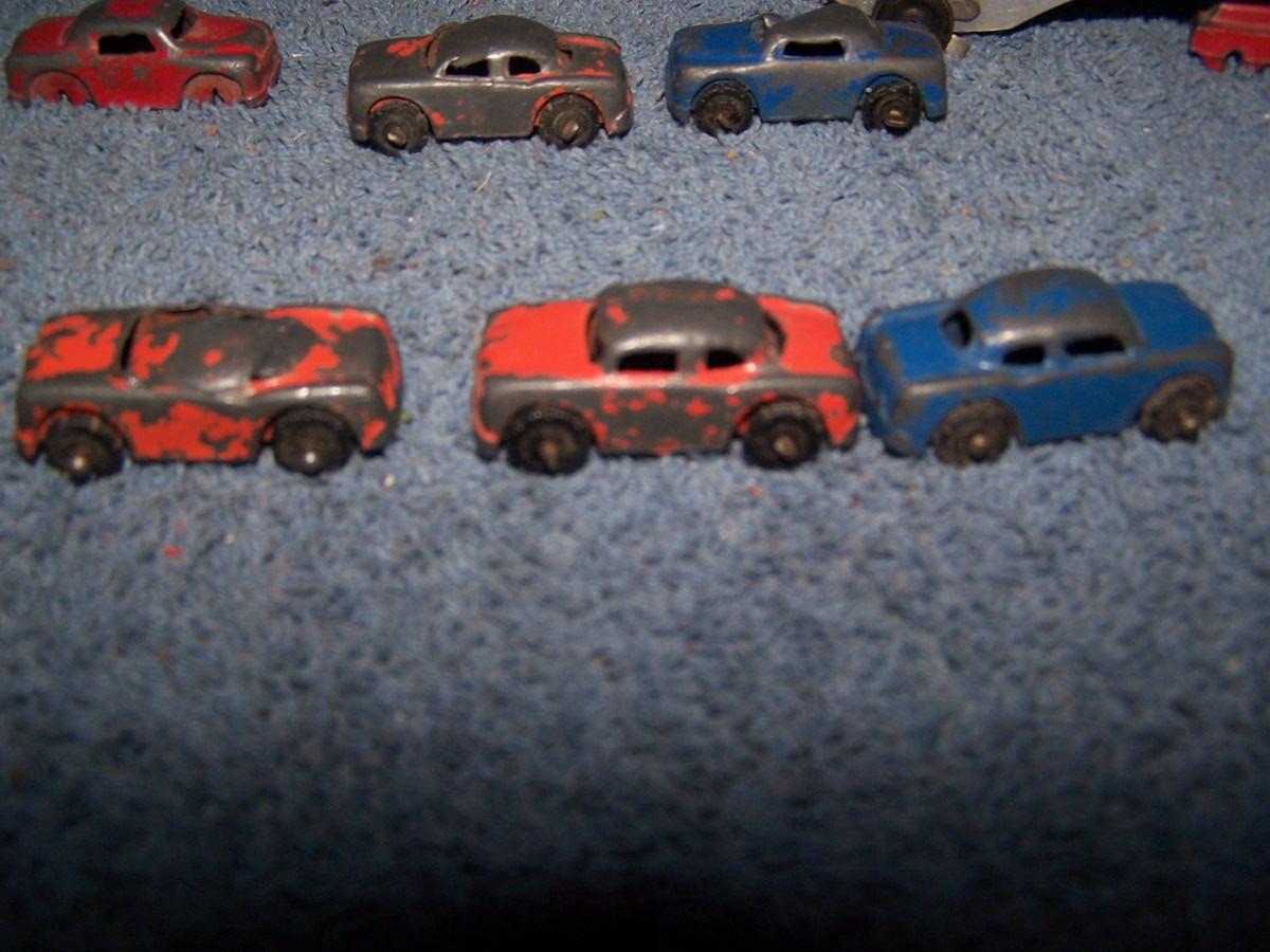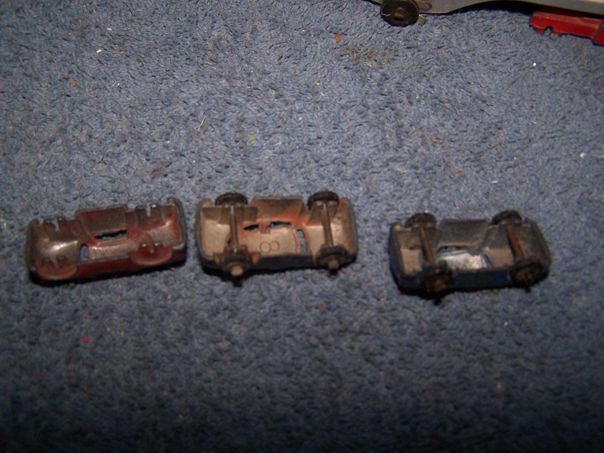 THESE ARE GREAT VINTAGE MINI METAL VEHICLES, UNMARKED, PROBABLY, BARCLAYS.. CARS ARE 1 1/2'' LONG.. 1 CAR IS MASHED.. TRUCK IS MISSING 2 WHEELS.. ALL TOYS HAVE BEEN PLAYED WITH..