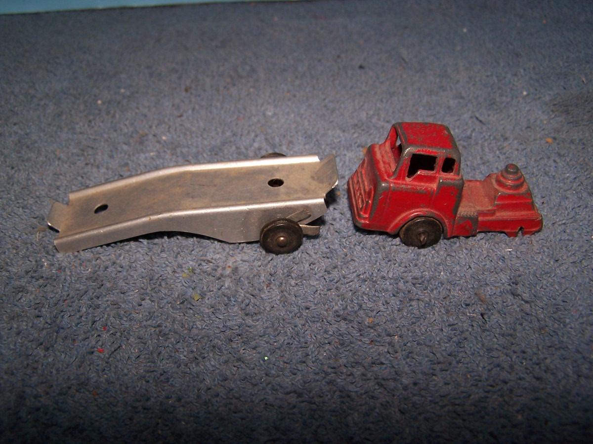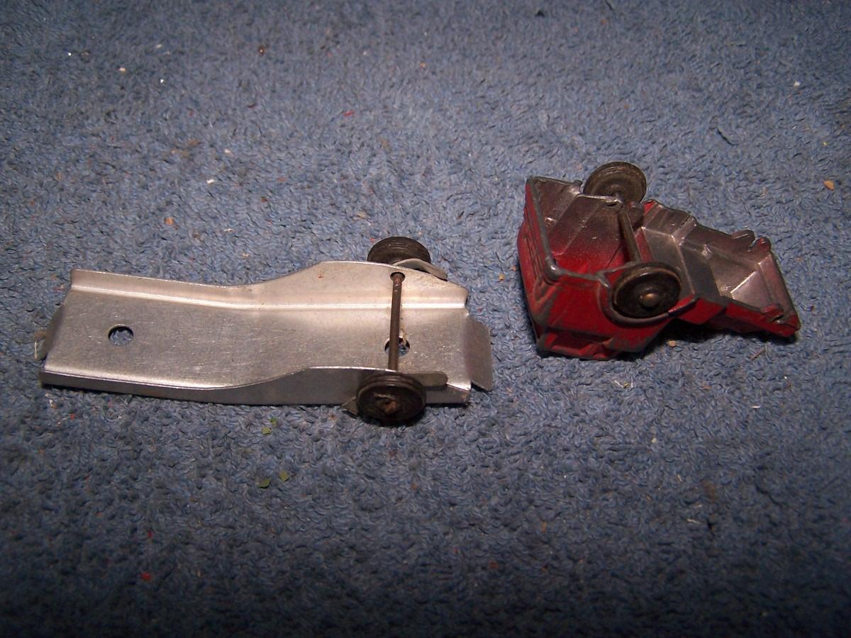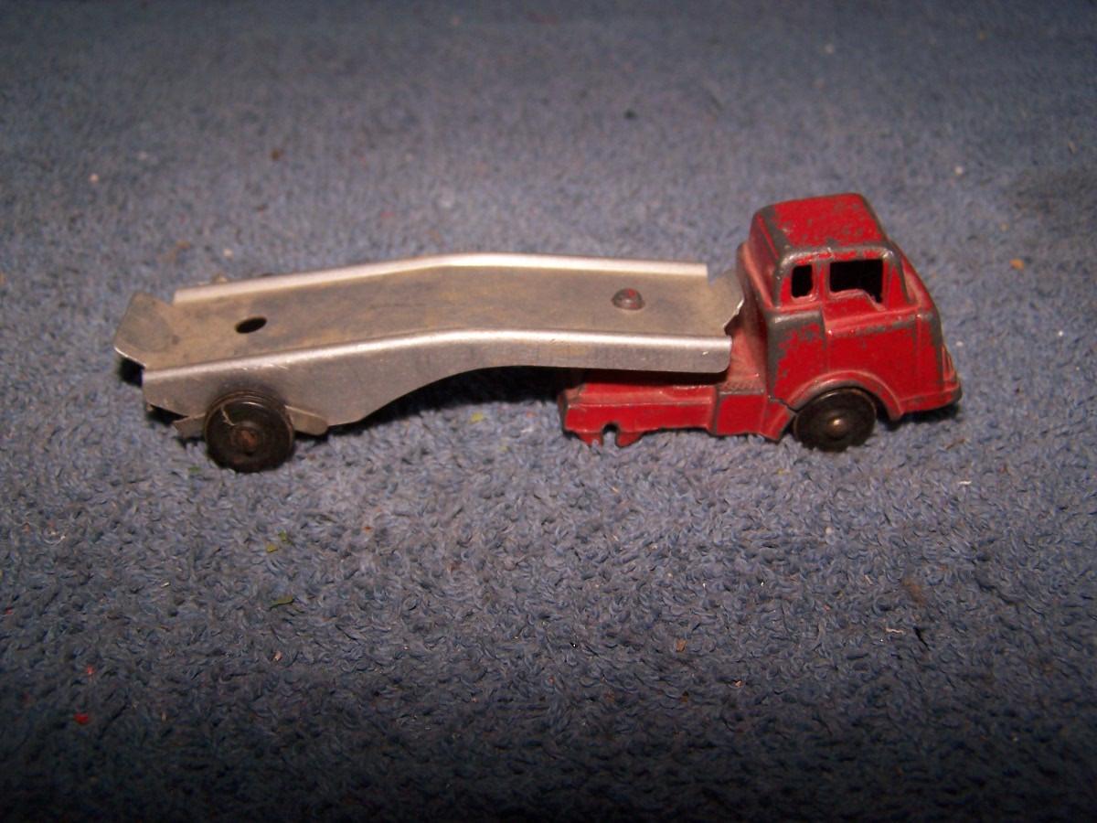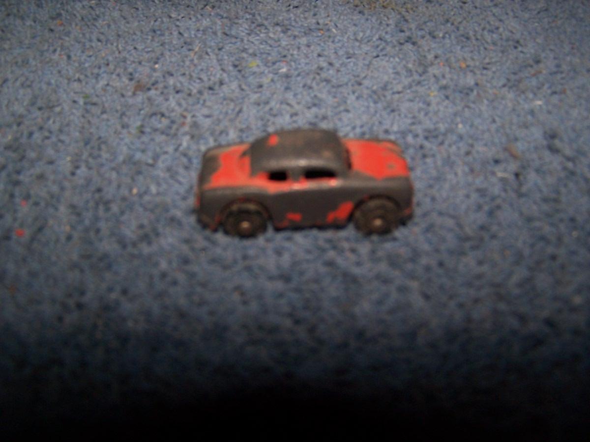 THESE ARE GREAT VINTAGE MINI METAL VEHICLES, UNMARKED, PROBABLY, BARCLAYS.. CARS ARE 1 1/2'' LONG.. 1 CAR IS MASHED.. TRUCK IS MISSING 2 WHEELS.. ALL TOYS HAVE BEEN PLAYED WITH..