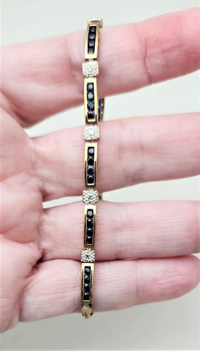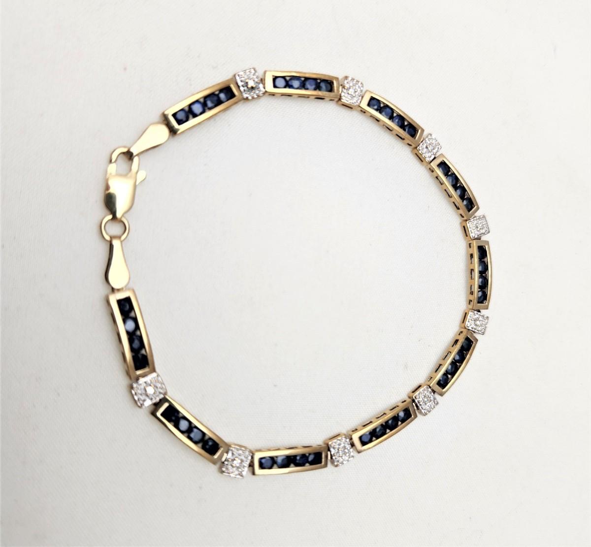 Lobster claw clasp 14kt yellow gold bracelet (7" long) set with tiny diamonds and channel set sapphires. Great condition and very pretty. Fine jewelry opening bids are set a little above the scrap price - they will not be reduced.