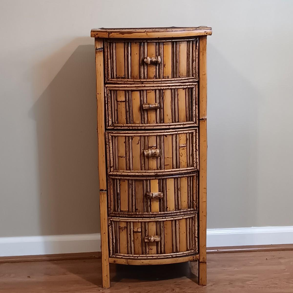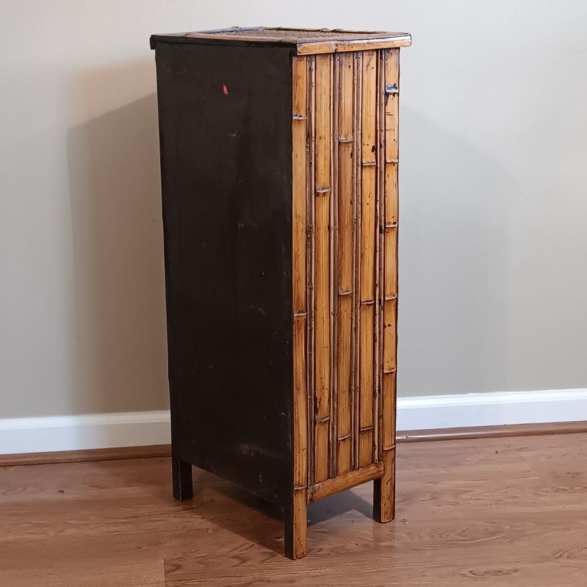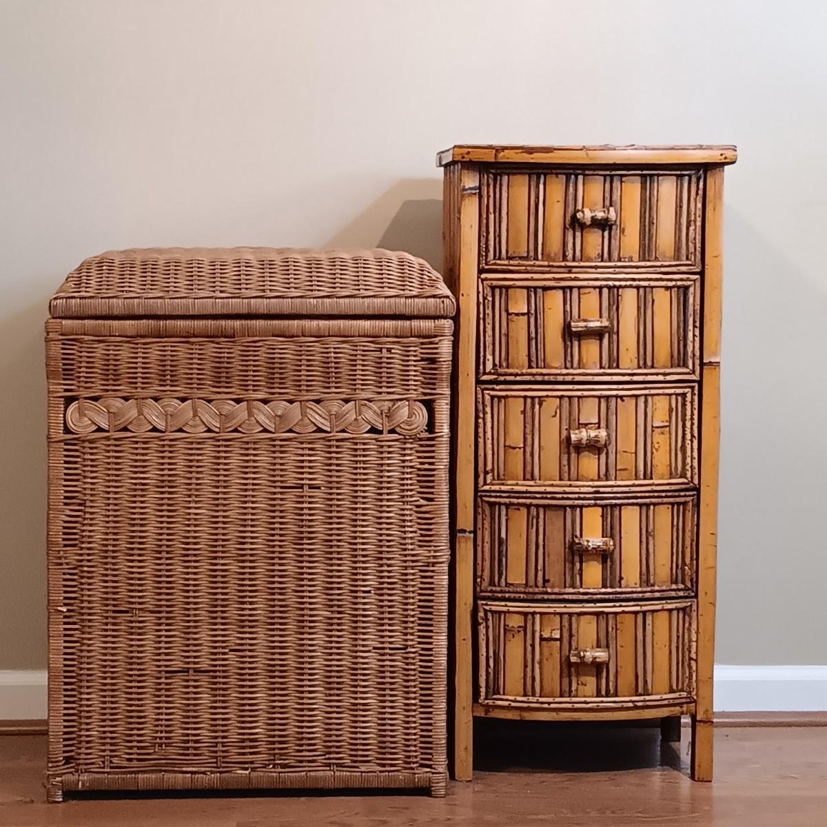 LOT 203: Bamboo and Rattan End Table with Wicker Hamper